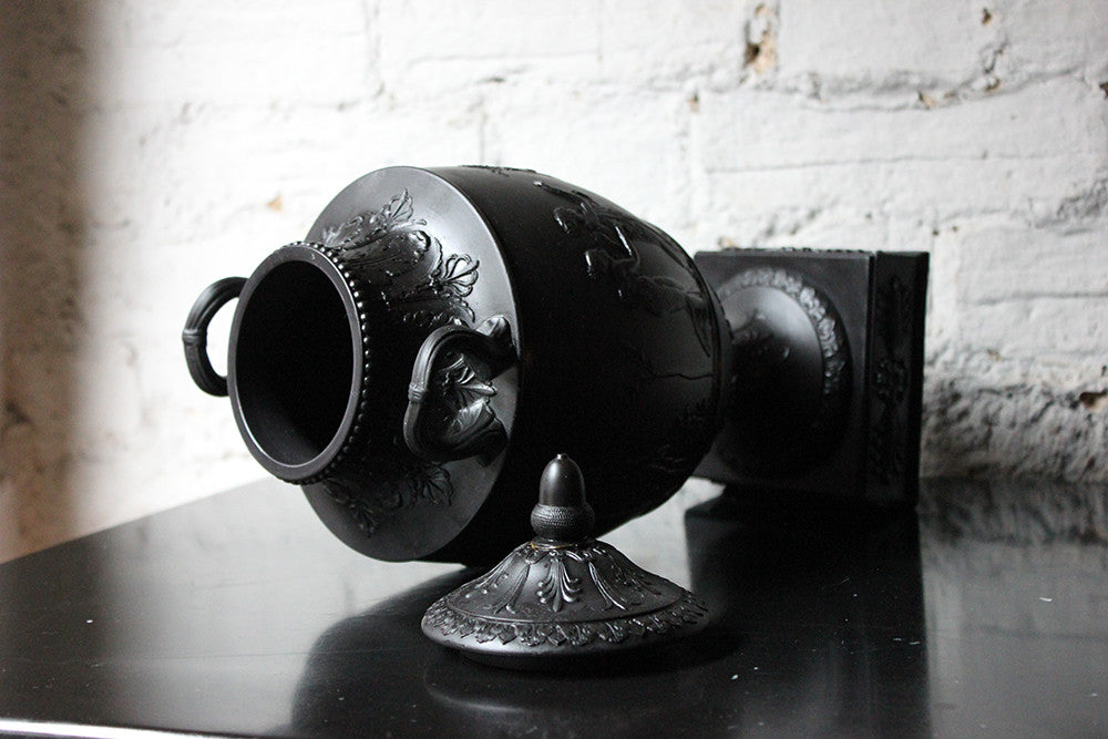 The Wedgwood Company is a British pottery firm, originally founded by Josiah Wedgwood c1795, and possibly the most famous name ever associated with pottery. One of the highest pottery innovations of all time is the Wedgwood Black Basalt. Since its innovation, this fine porcelain has been a huge commercial success. It is developed from reddish brown clay that burned black in firing. The ceramic body is quite superior in appearance and its body owed its richer color to the inclusion of manganese. The creations were inspired by original antiques mostly from vases in the collections that had been amassed by early collectors. ‘Black Basalte’ wares were based on Roman, Greek and Etruscan originals, and fitted in perfectly with the neoclassical style that was the dominant fashion for interior design in the 1770s. They were decorated in classical style, too. Basalt wares had perhaps their greatest popularity in the first half of the 19th century
