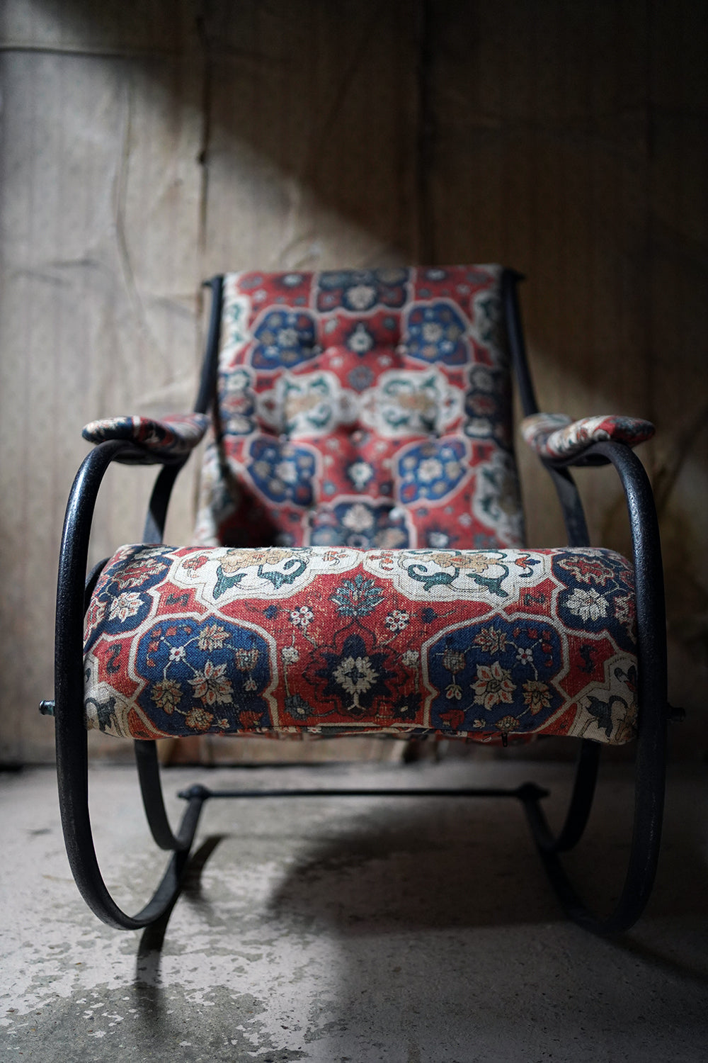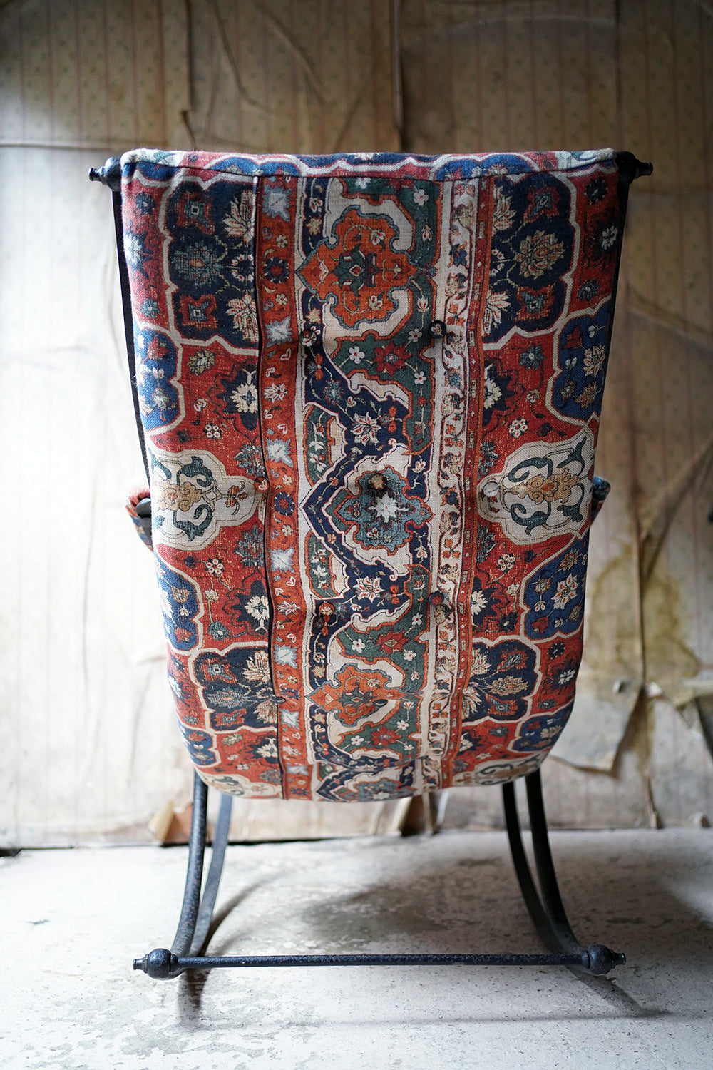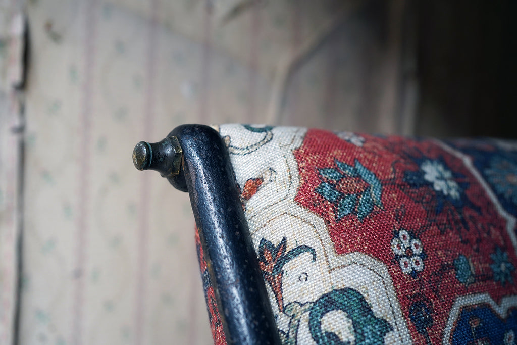 In the manner of, or indeed made by R.W. Winfield, the black tubular steel frame with pad arms above scrolling supports and serpentine base rails, now freshly button-back upholstered in Colefax and Fowlers’ Perseus carpet inspired fabric, the chair being comfortable and useable and surviving from early Victorian England.