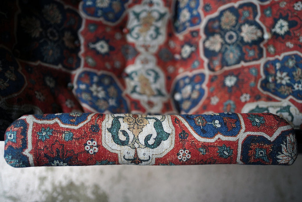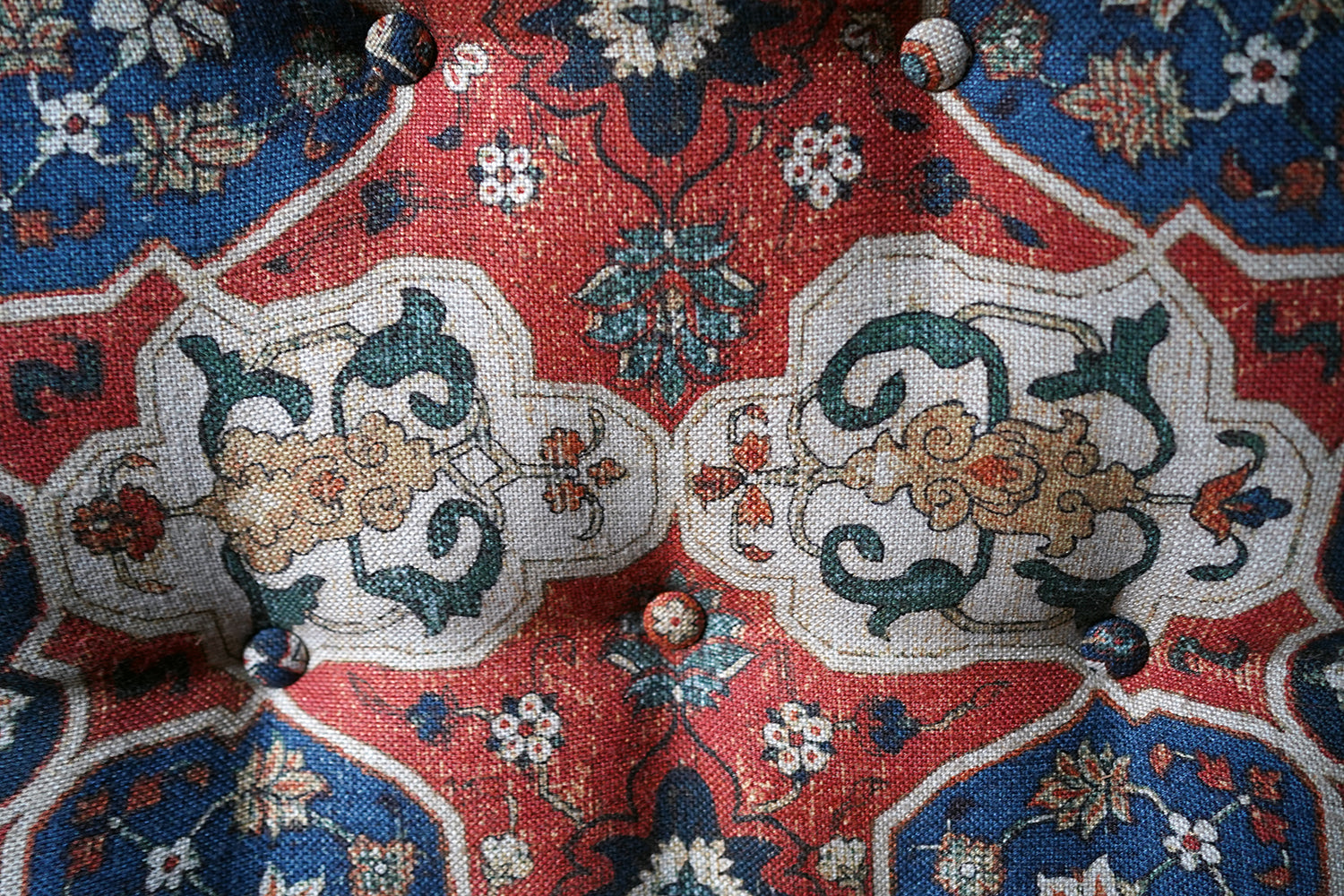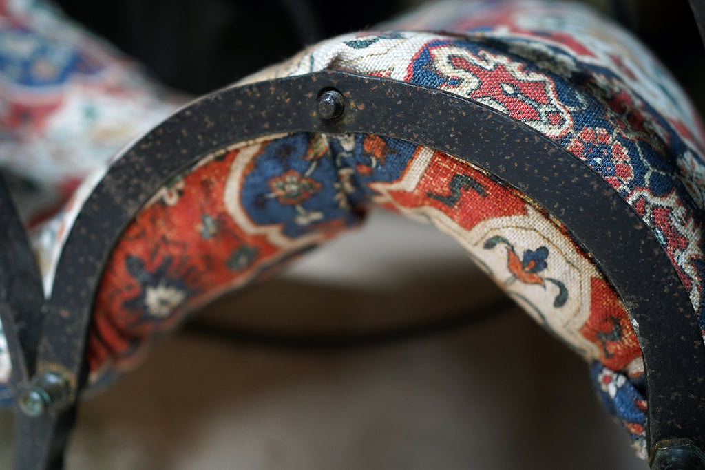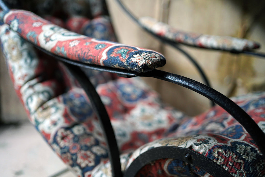 In the manner of, or indeed made by R.W. Winfield, the black tubular steel frame with pad arms above scrolling supports and serpentine base rails, now freshly button-back upholstered in Colefax and Fowlers’ Perseus carpet inspired fabric, the chair being comfortable and useable and surviving from early Victorian England.