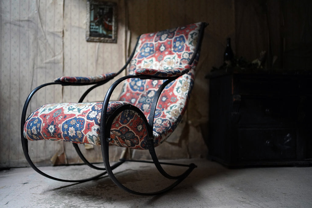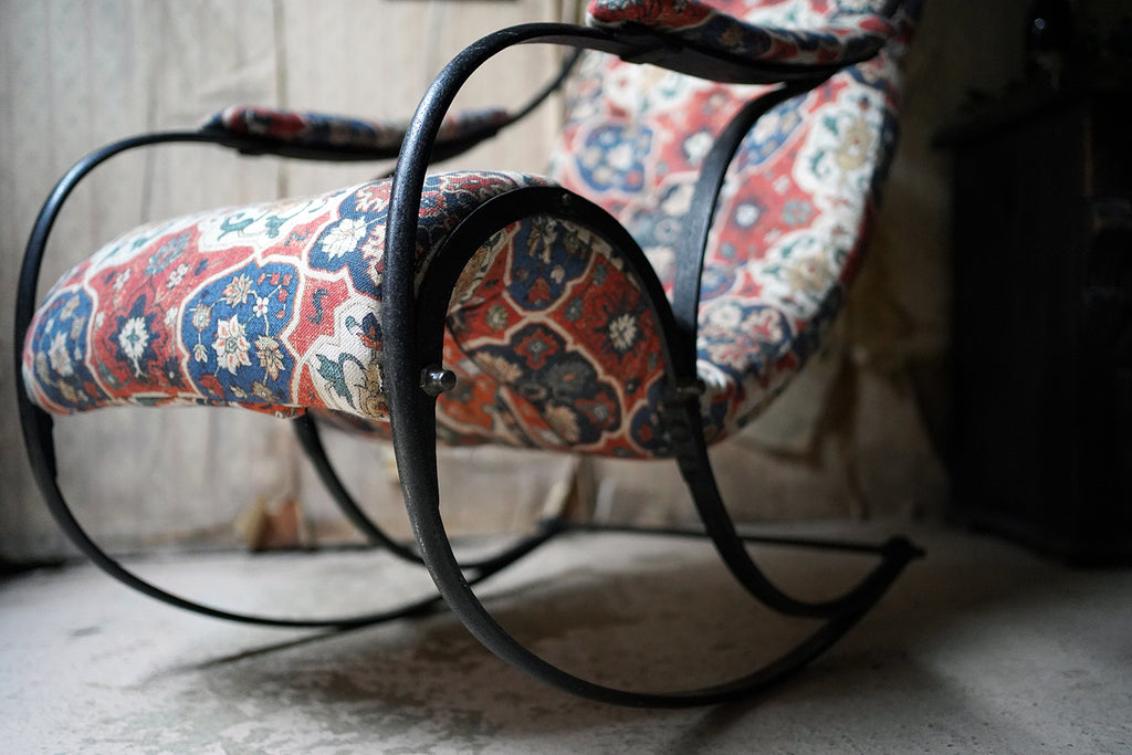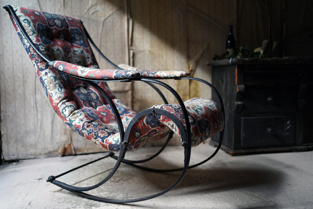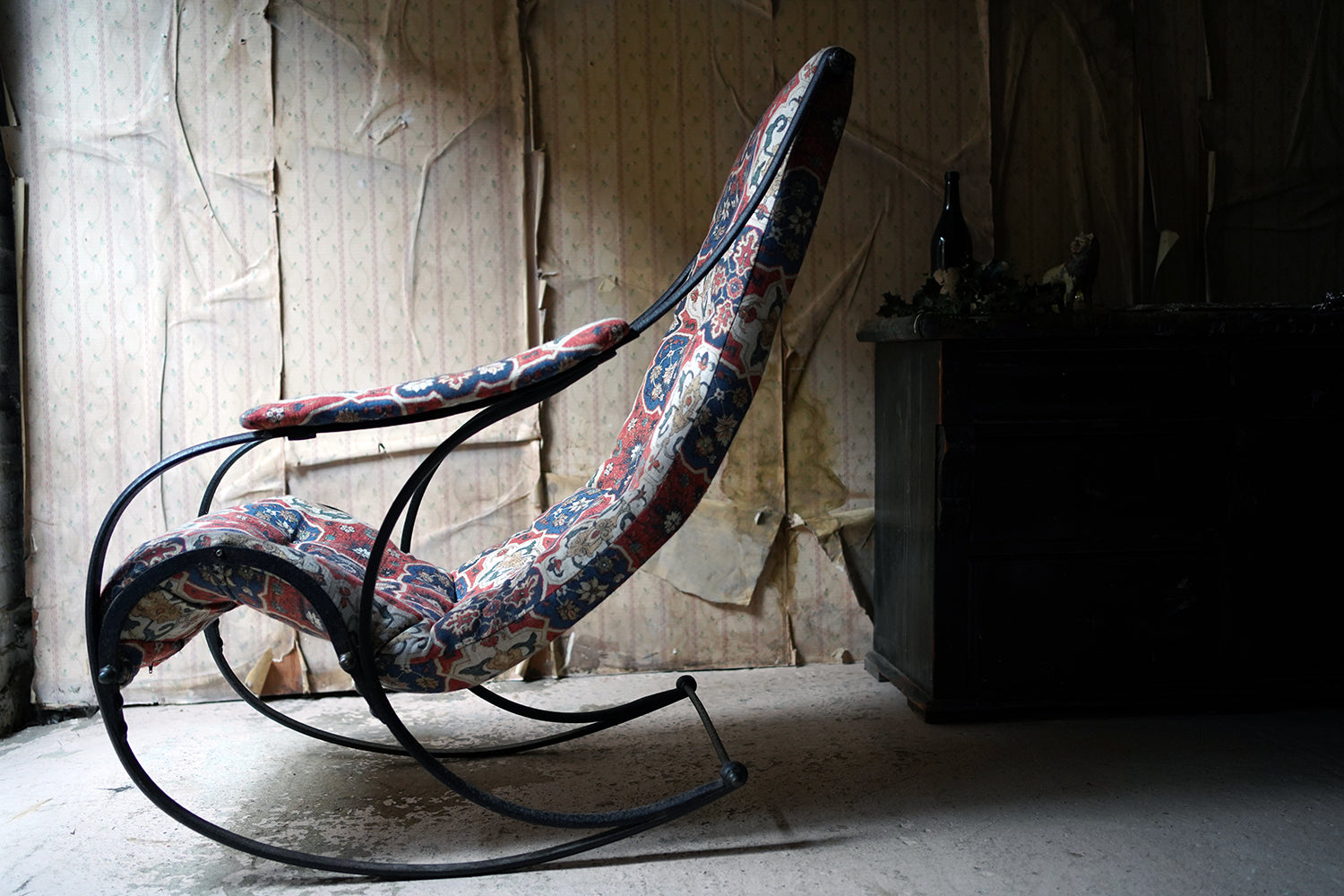 Rocking chairs were originally made with curved rockers attached to the feet of ordinary chairs. This unusual type of rocking chair used the curved frame of the chair to create the rocking motion. Examples were produced both in tube metal and in strip metal and the upholstery is slung between the top of the back and the seat, rather like a deck chair. During the 1840s, iron tube, normally used for beds, was adapted for rocking chairs. In 1844 Charles Dickens and his wife, Catherine, rented 1 Devonshire Terrace, London, and the inventory of the house included an iron rocking chair in the dining room.