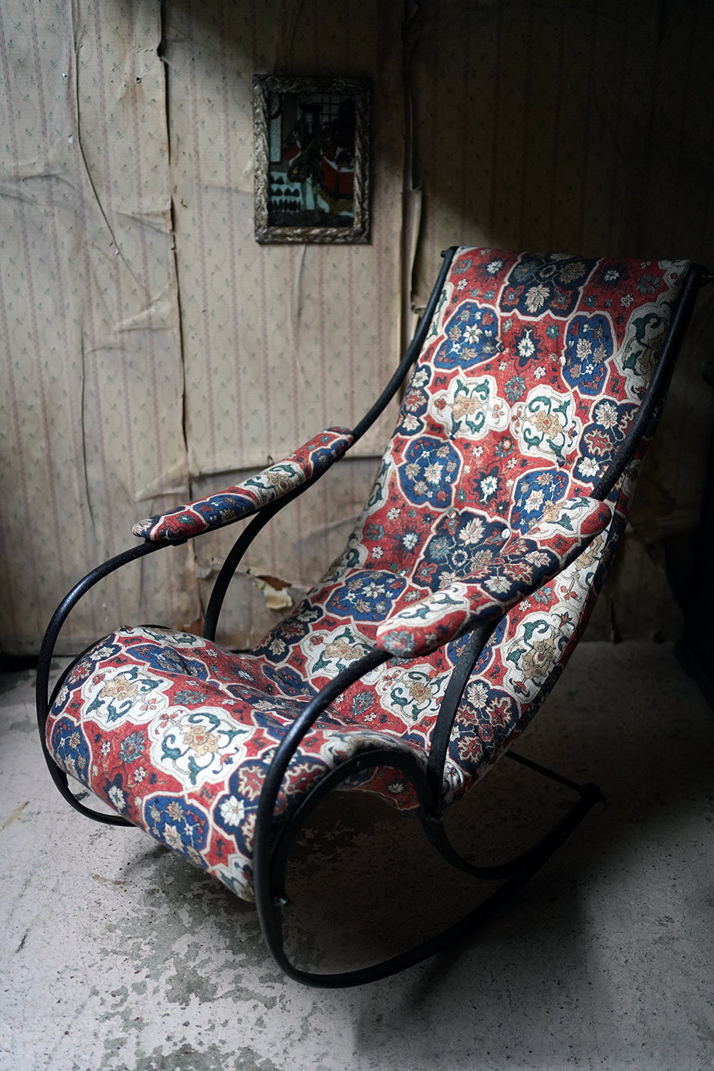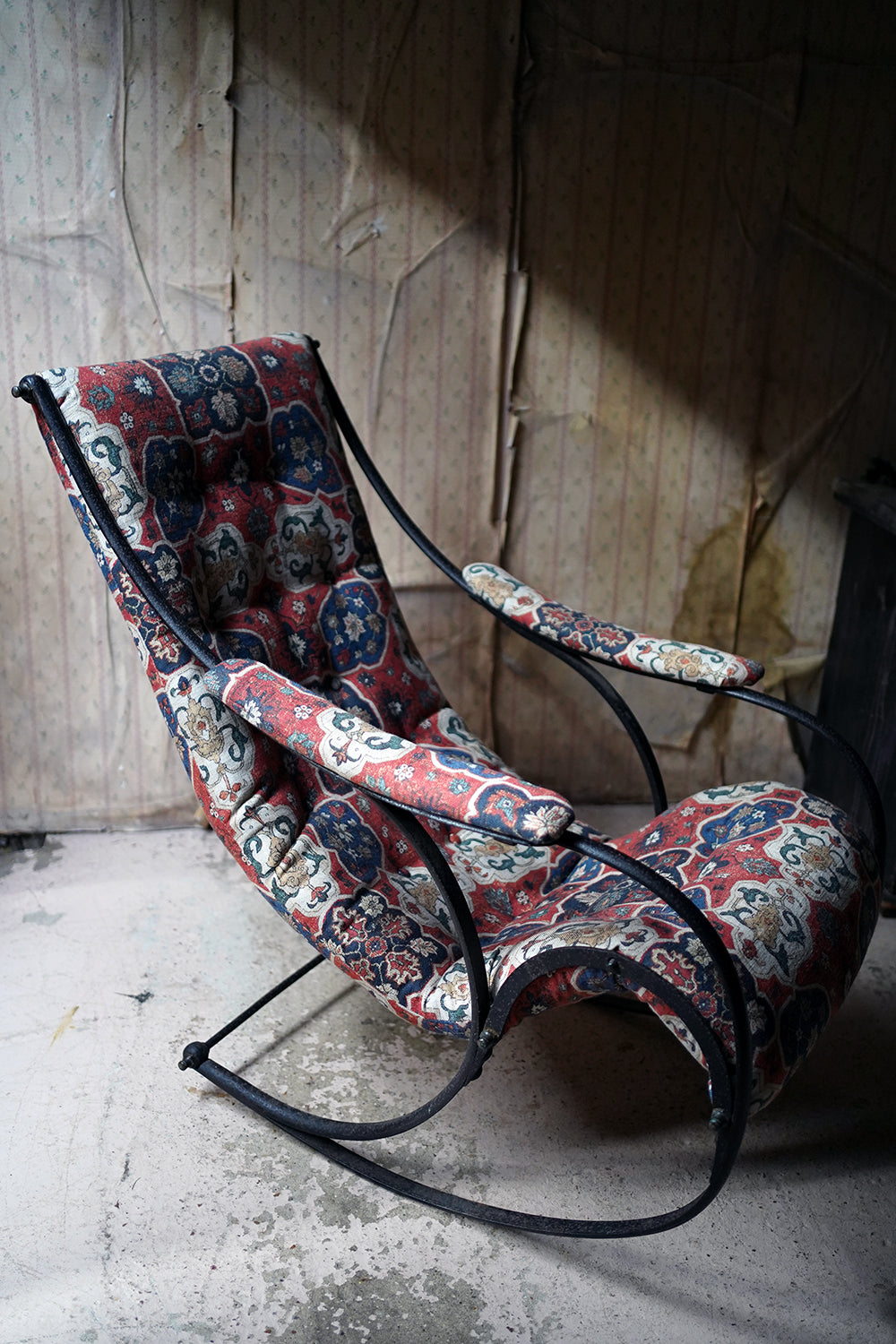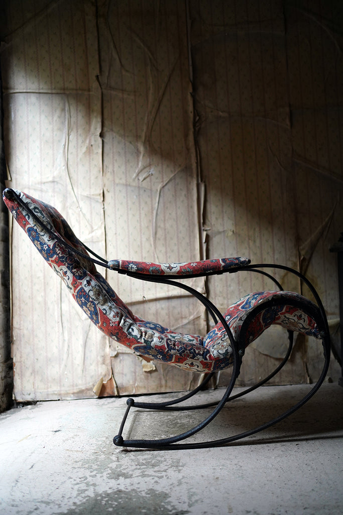 Rocking chairs were originally made with curved rockers attached to the feet of ordinary chairs. This unusual type of rocking chair used the curved frame of the chair to create the rocking motion. Examples were produced both in tube metal and in strip metal and the upholstery is slung between the top of the back and the seat, rather like a deck chair. During the 1840s, iron tube, normally used for beds, was adapted for rocking chairs. In 1844 Charles Dickens and his wife, Catherine, rented 1 Devonshire Terrace, London, and the inventory of the house included an iron rocking chair in the dining room.