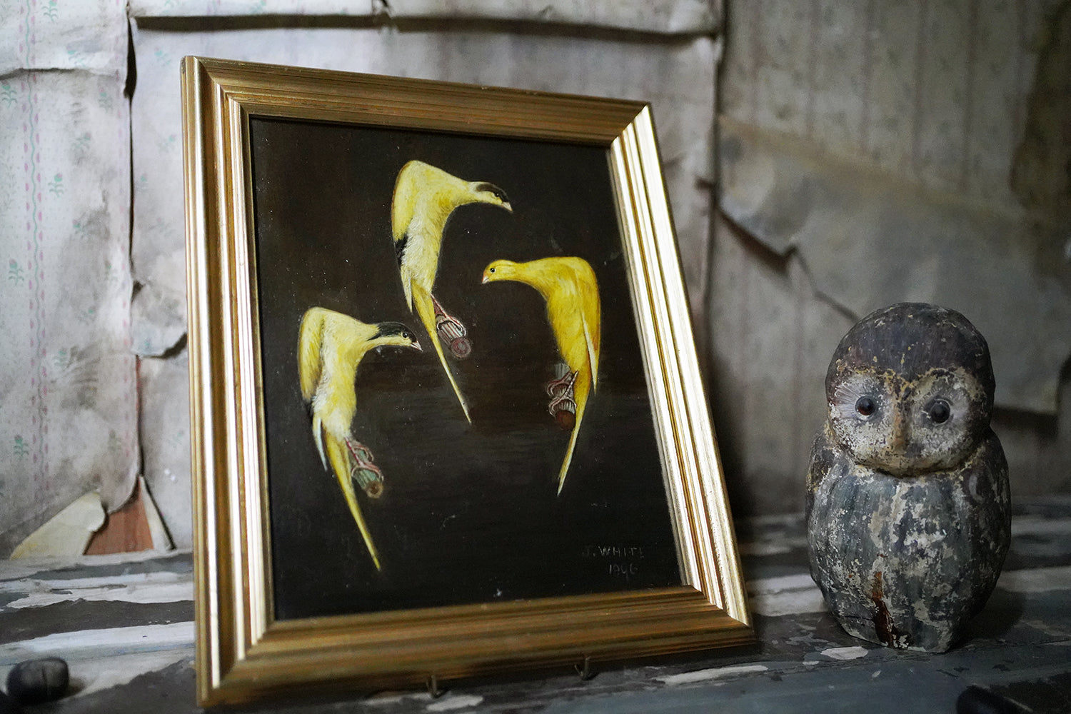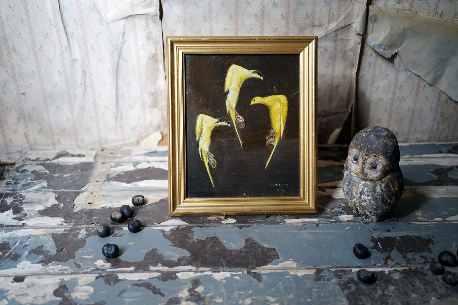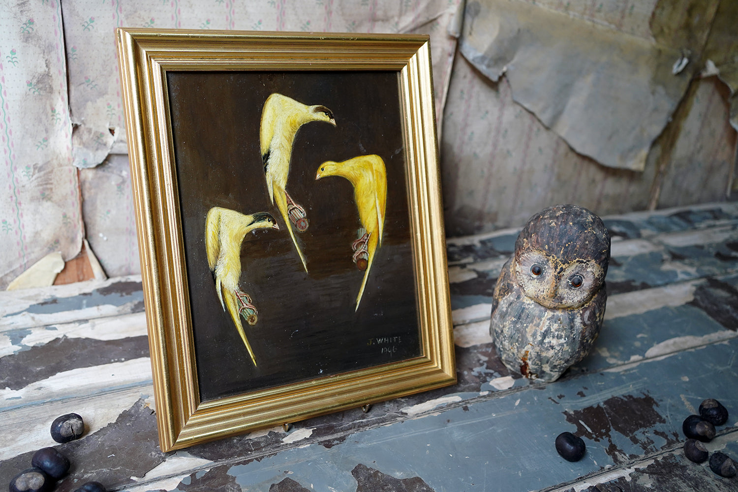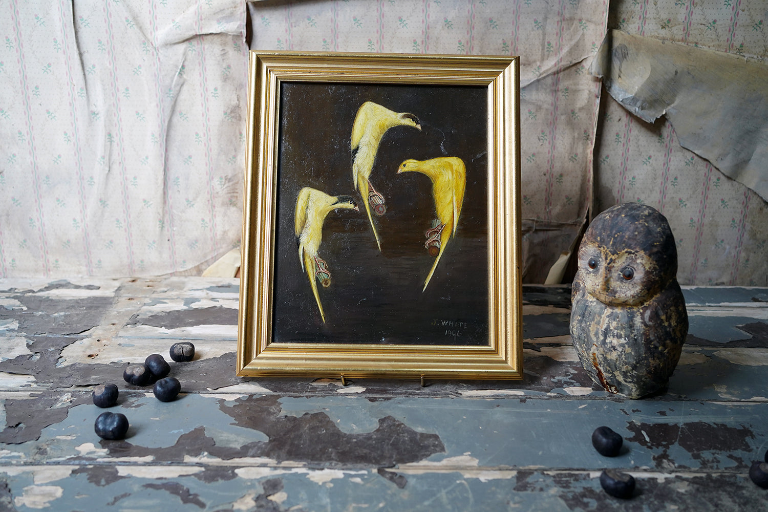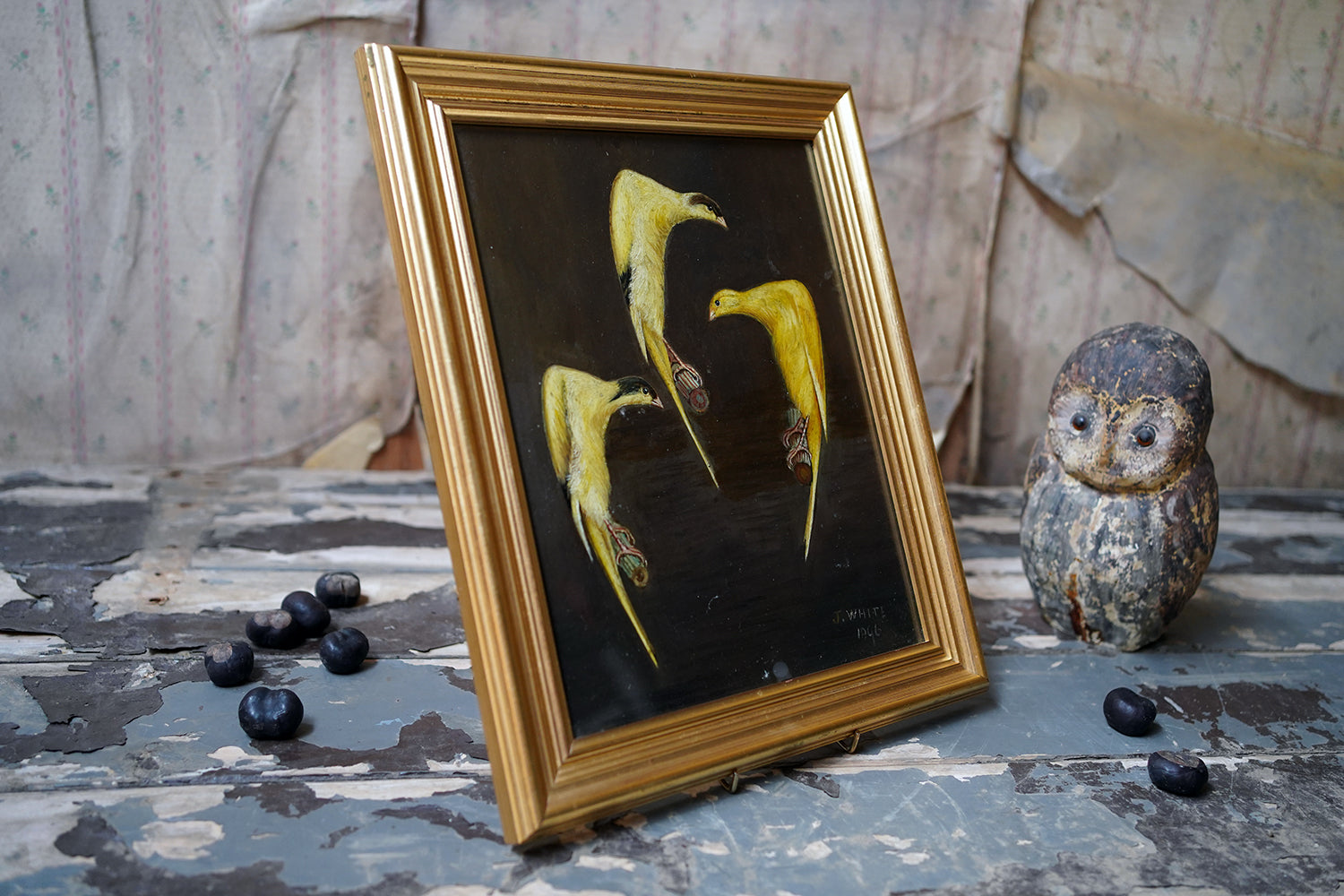 One rarely sees representations of canaries in oils and this is a striking and beautiful painting in a distinctive style.
