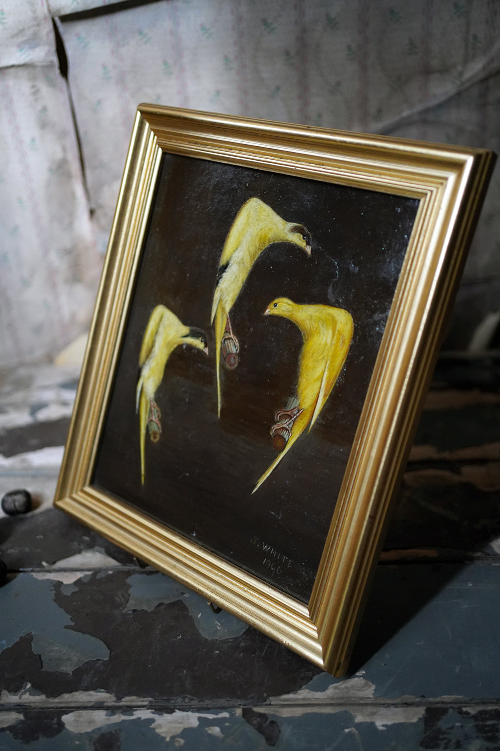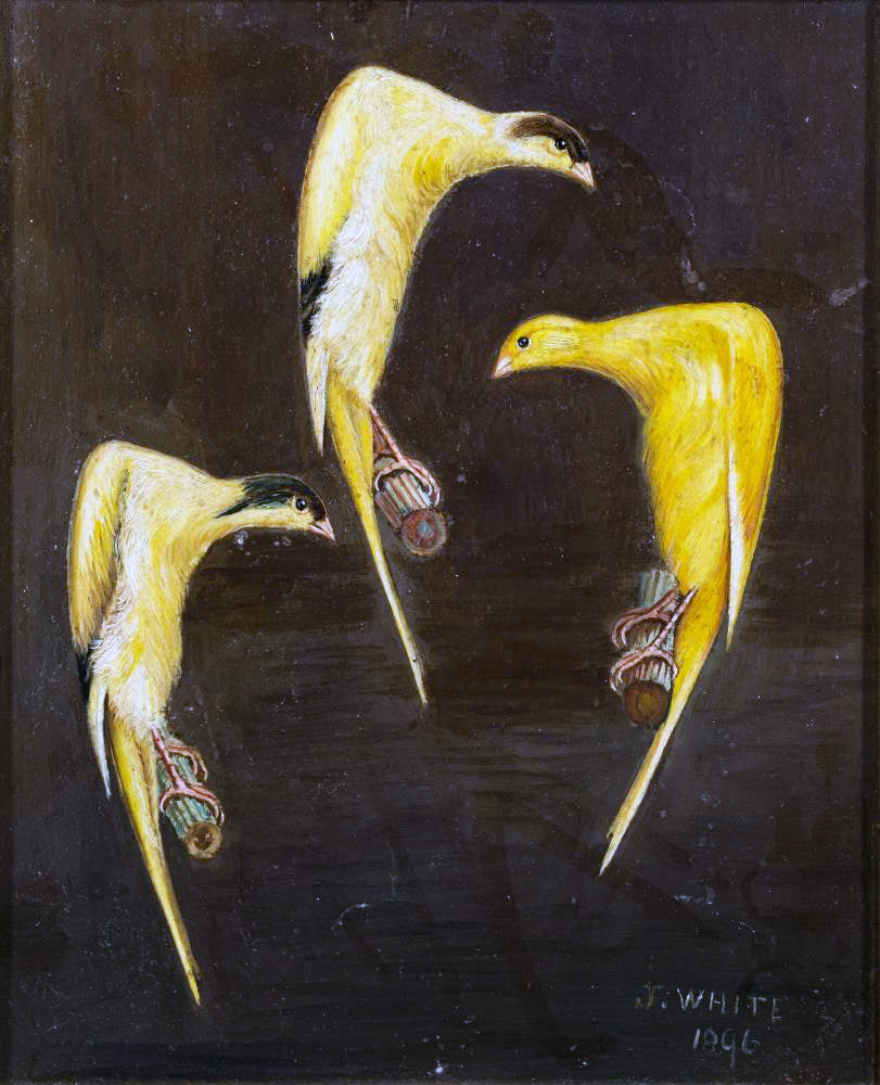 The beautifully balanced oil on panel, depicting three scotch fancy or Glasgow dons, being a particular breed of canary, each sat on perches and in profile to a dark ocre ground, and signed and dated lower right J. White 1896, the whole presented in a later gilded and glazed frame and surviving from the zeniths of the Victorian period.