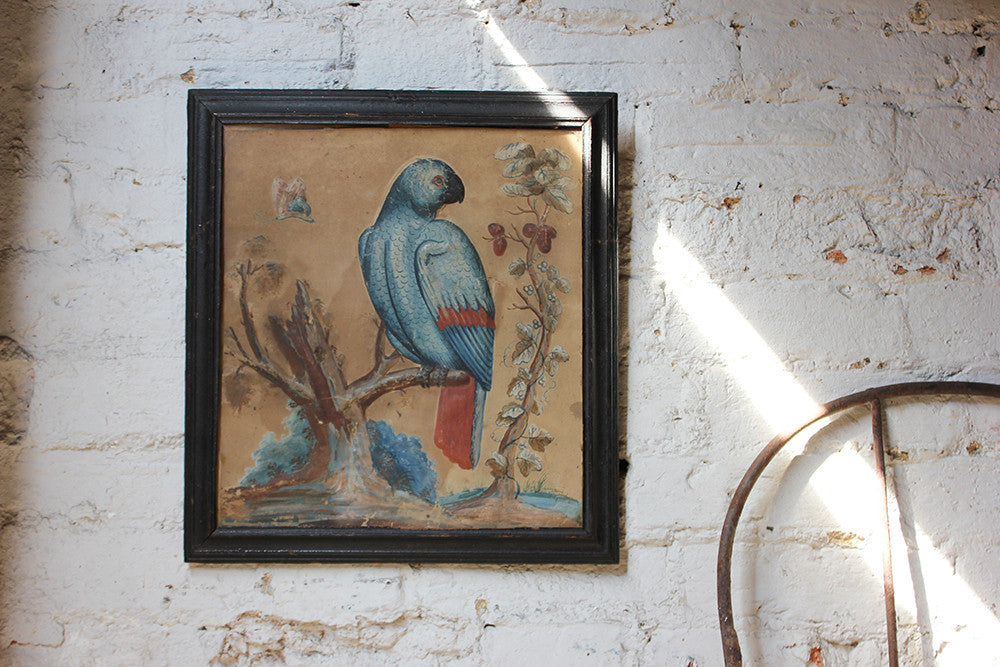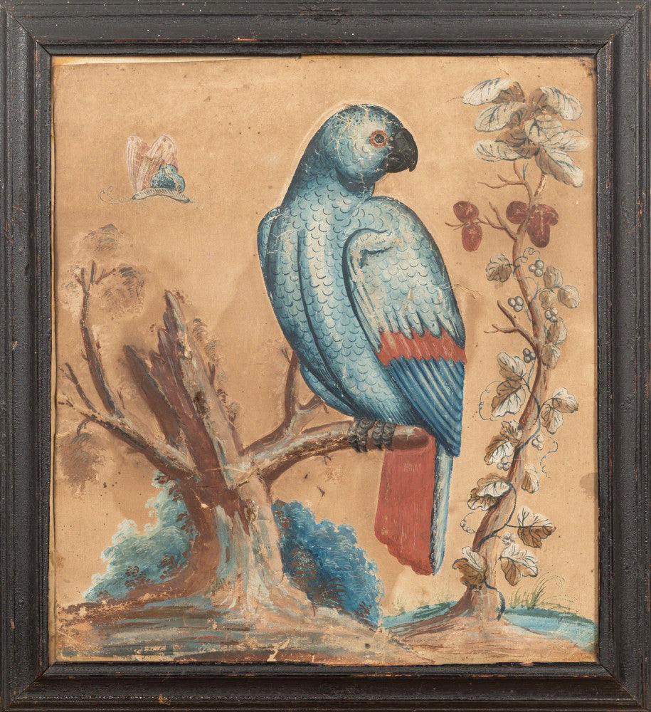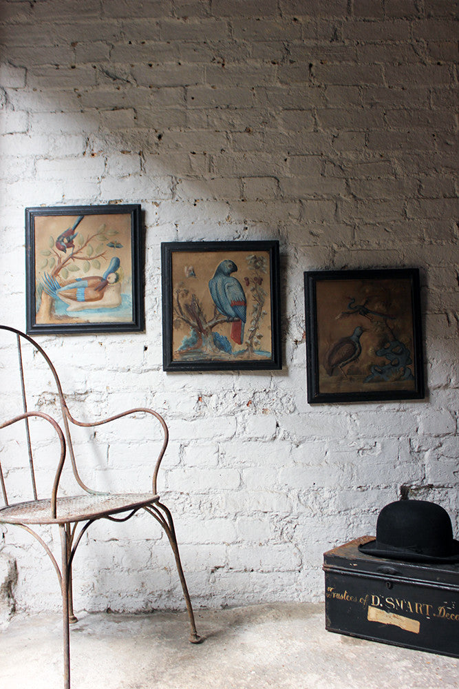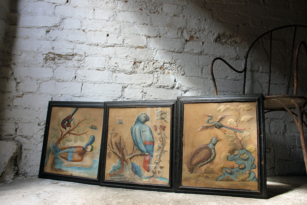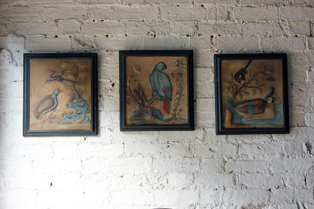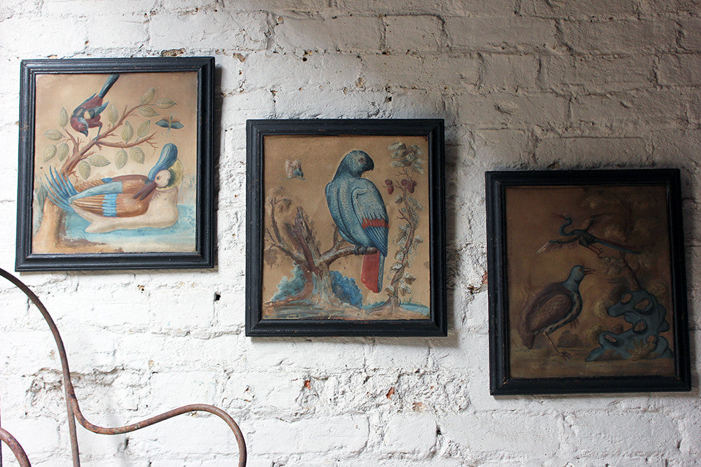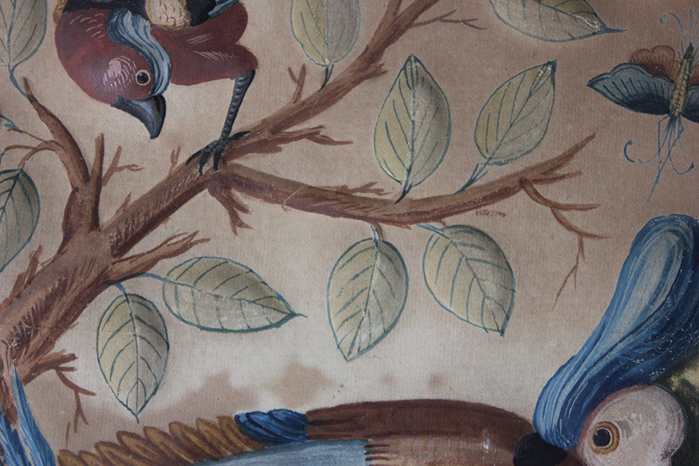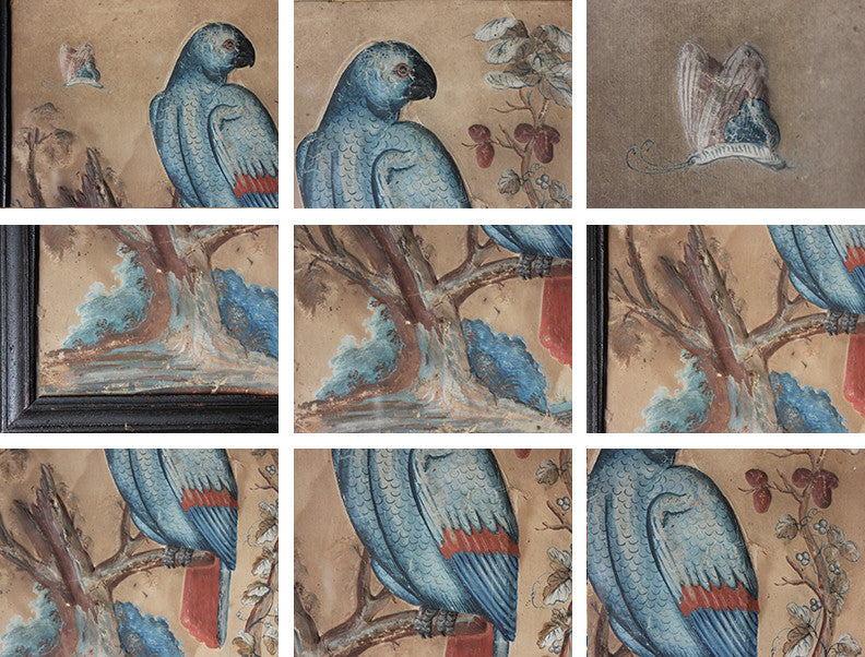 Samuel Dixon, the Dublin artist, owned a ‘picture ware-room’ on Capel Street, north of the River Liffey where he produced embossed papier-mâché pictures of birds and flowers. These were hand-coloured by his apprentices and sold in black and gold japanned frames. Samuel Dixon of Dublin was made famous by his sets of embossed bird and flower pictures issued between 1748 and 1755. These pictures incorporated a technique, which Dixon called, 'basso relievo' whereby parts of the design were raised by means of a copper plate and then coloured in gouache, a technique we see in our pictures here.