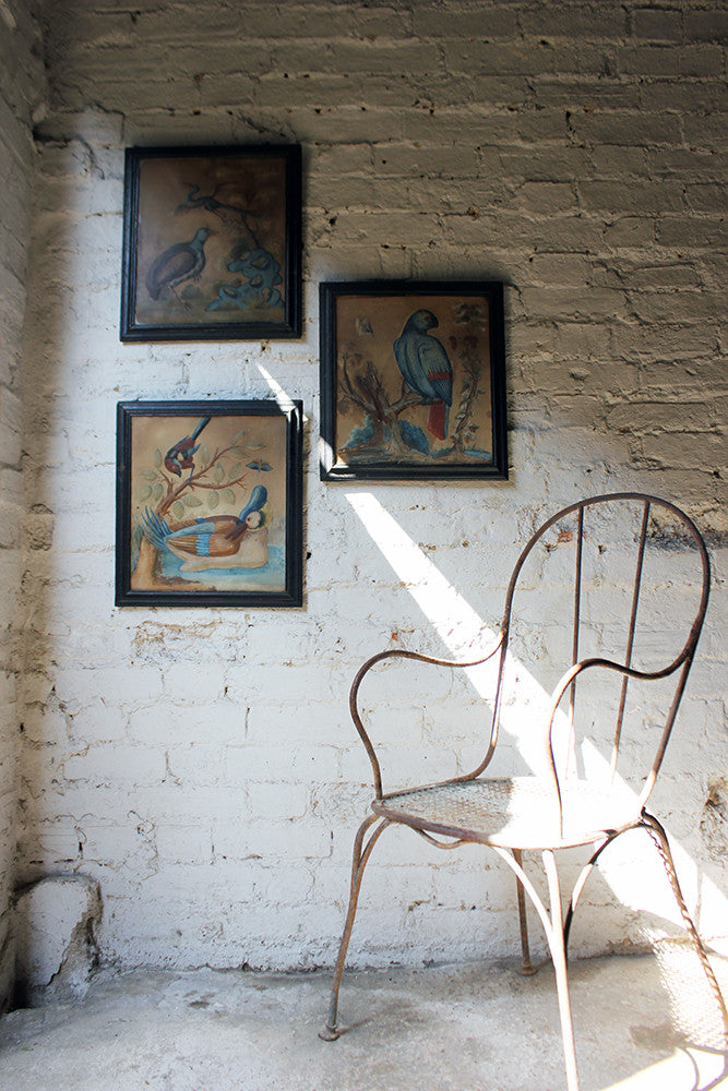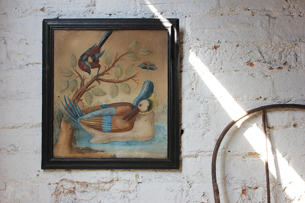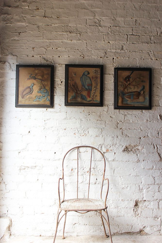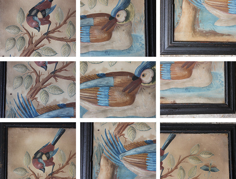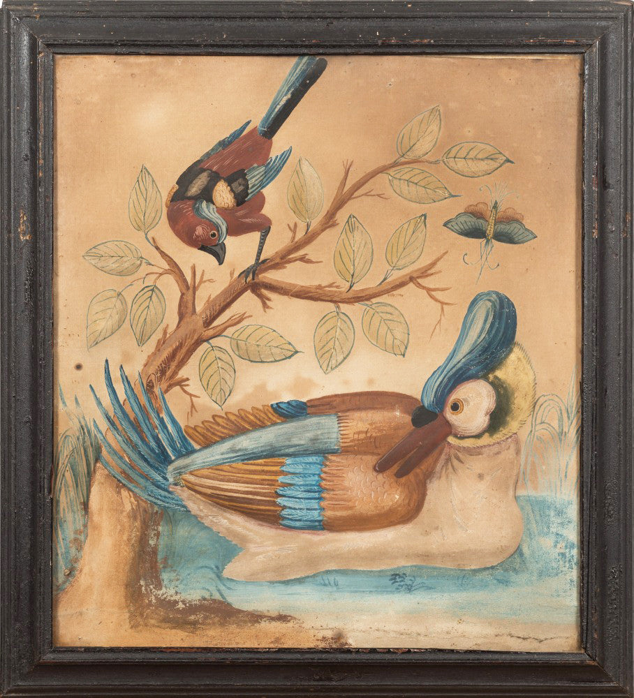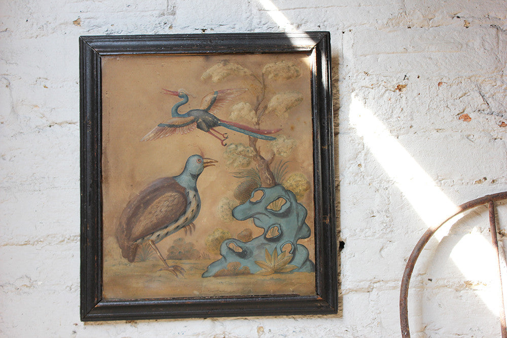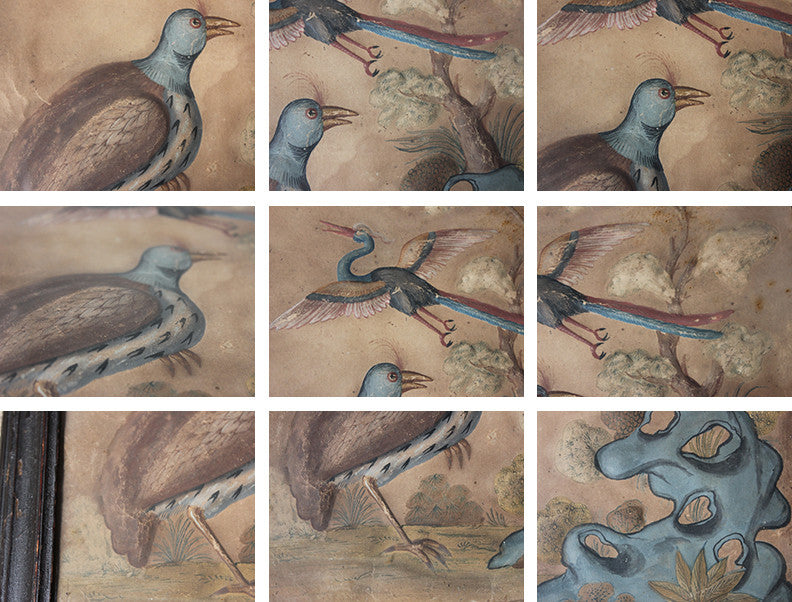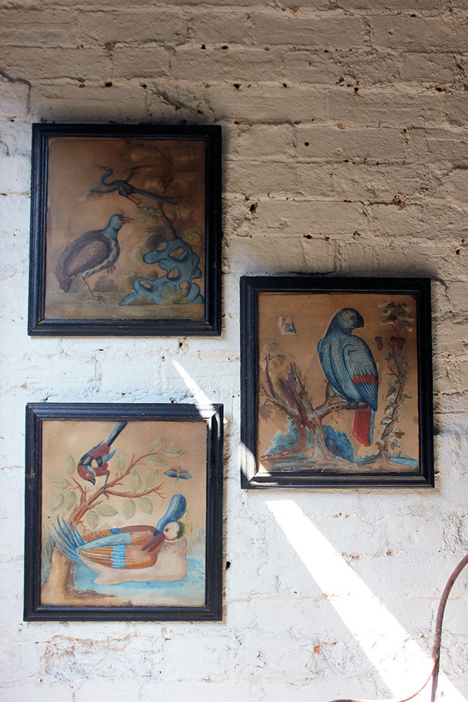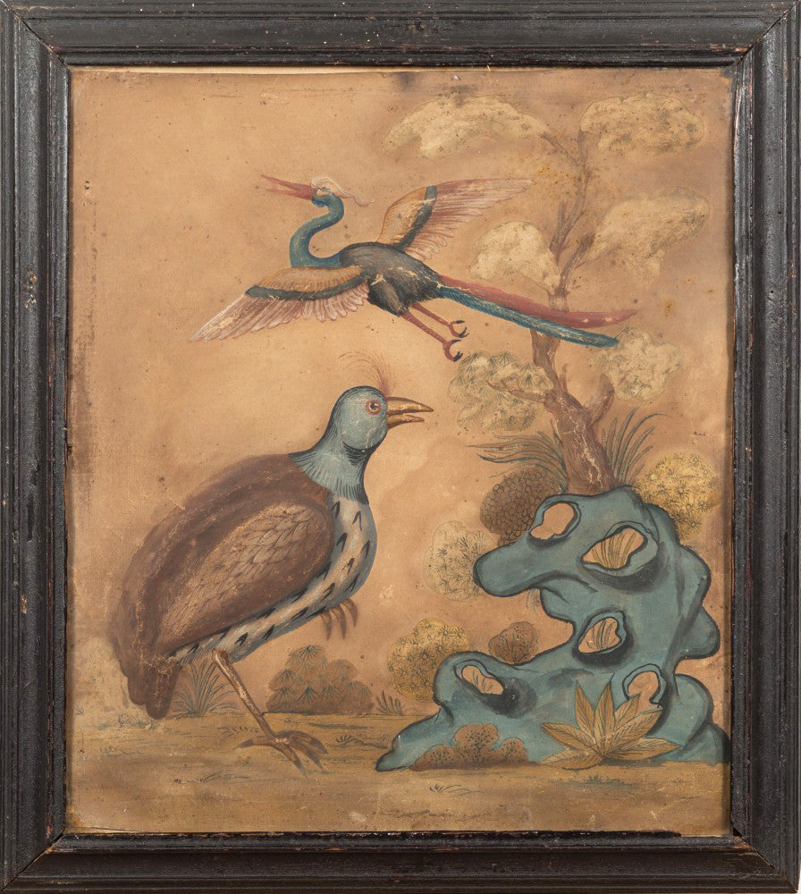 Samuel Dixon, the Dublin artist, owned a ‘picture ware-room’ on Capel Street, north of the River Liffey where he produced embossed papier-mâché pictures of birds and flowers. These were hand-coloured by his apprentices and sold in black and gold japanned frames. Samuel Dixon of Dublin was made famous by his sets of embossed bird and flower pictures issued between 1748 and 1755. These pictures incorporated a technique, which Dixon called, 'basso relievo' whereby parts of the design were raised by means of a copper plate and then coloured in gouache, a technique we see in our pictures here.