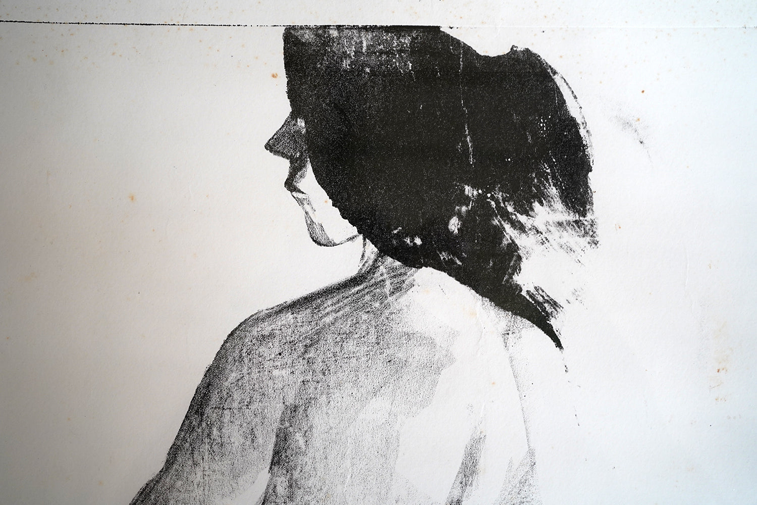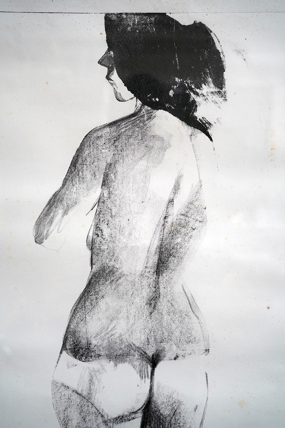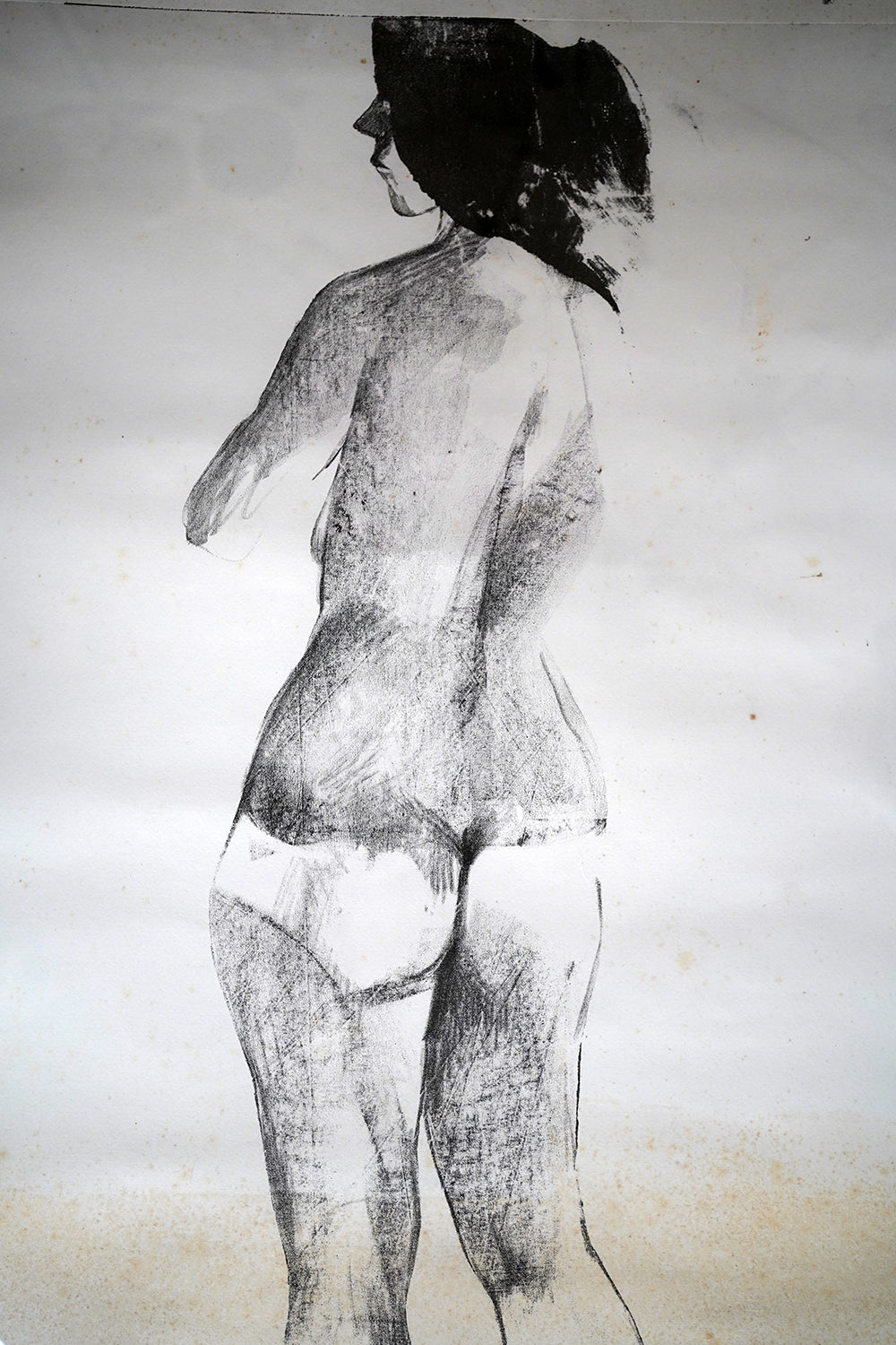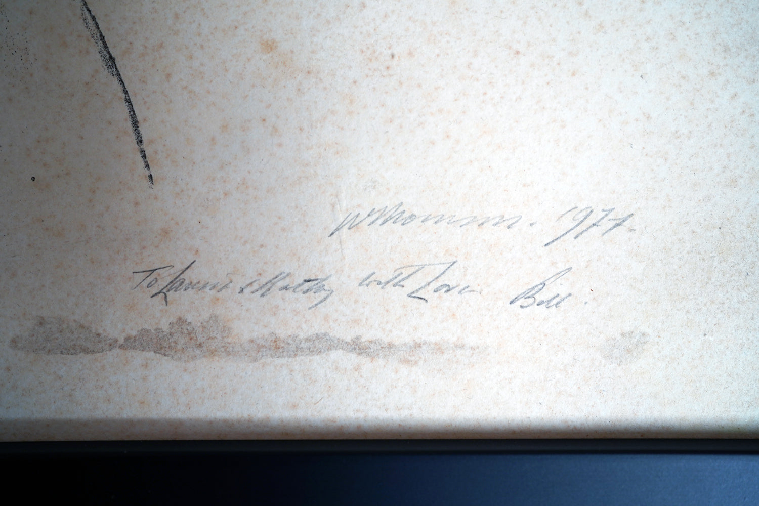 The sparse and quietly expressive standing nude study depicting a female figure shown from behind, rendered in a mixture of monotype and charcoal on a large sheet of wove paper, the artist allowing broad tonal sweeps to sit alongside sharply linear passages in the legs and lower back, the head is handled with the soft, muffled tonality characteristic of monotype pulling, while the legs and torso carry more incisive, hand-worked marks; the whole signed indistinctly at lower right “W. Moorman. 1977” and inscribed beneath in pencil “To Laurie & Kathy with love Bill” and surviving from the fourth quarter of the twentieth century.