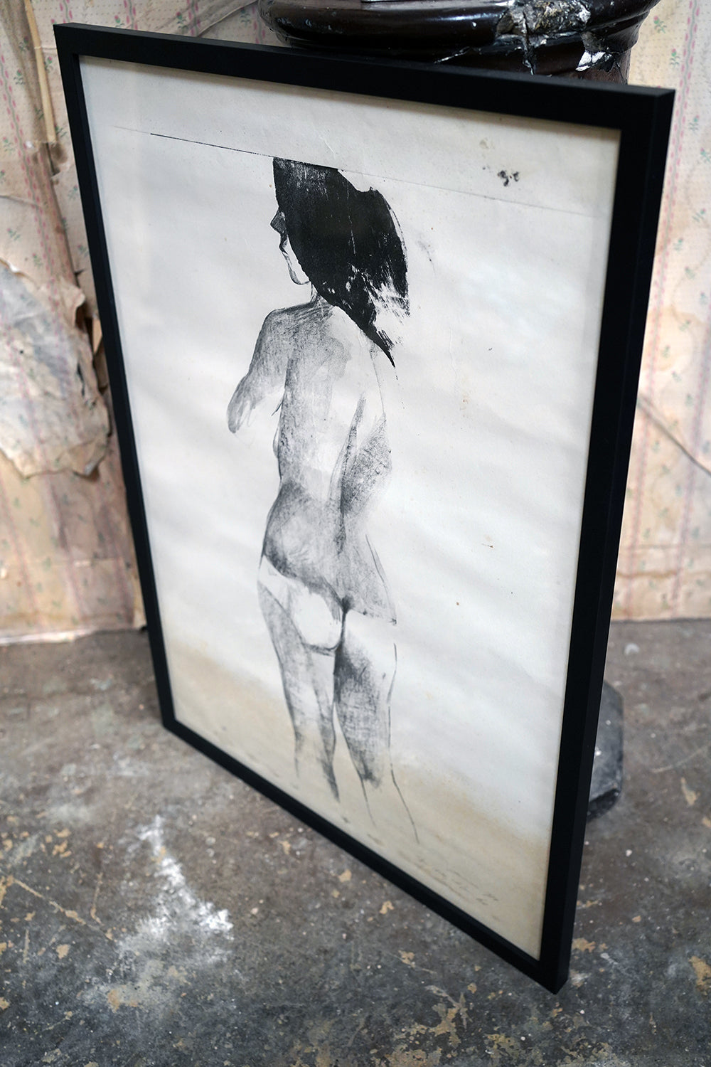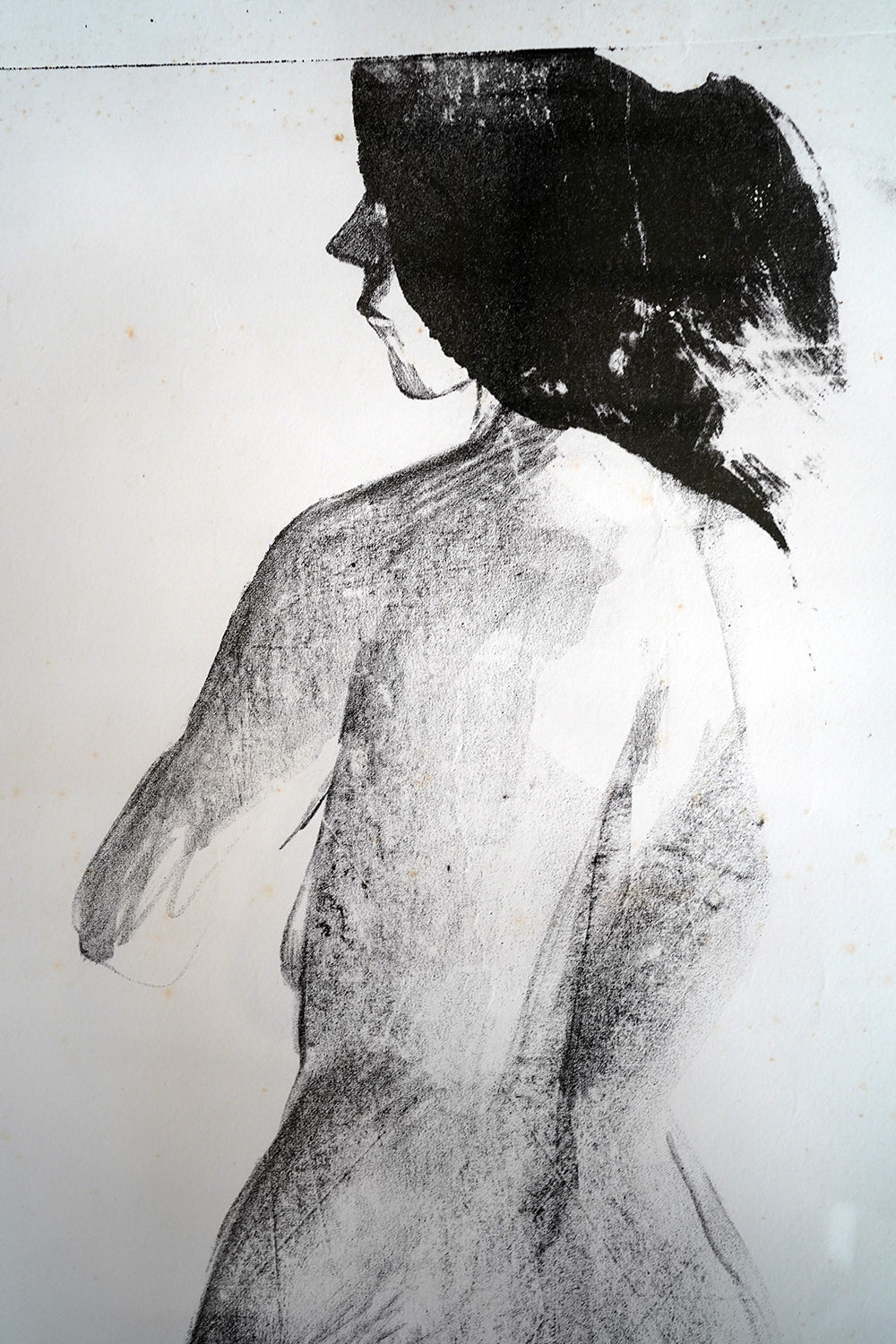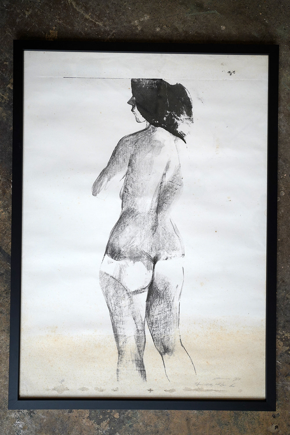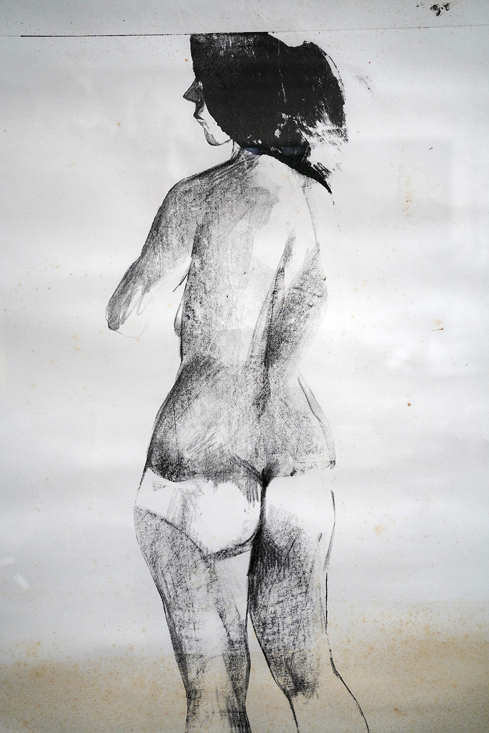 The sparse and quietly expressive standing nude study depicting a female figure shown from behind, rendered in a mixture of monotype and charcoal on a large sheet of wove paper, the artist allowing broad tonal sweeps to sit alongside sharply linear passages in the legs and lower back, the head is handled with the soft, muffled tonality characteristic of monotype pulling, while the legs and torso carry more incisive, hand-worked marks; the whole signed indistinctly at lower right “W. Moorman. 1977” and inscribed beneath in pencil “To Laurie & Kathy with love Bill” and surviving from the fourth quarter of the twentieth century.