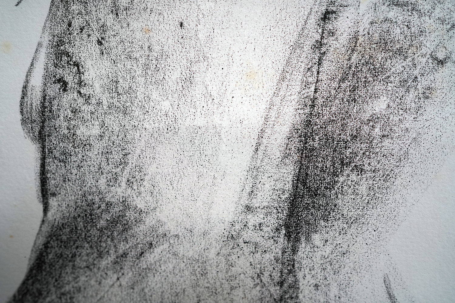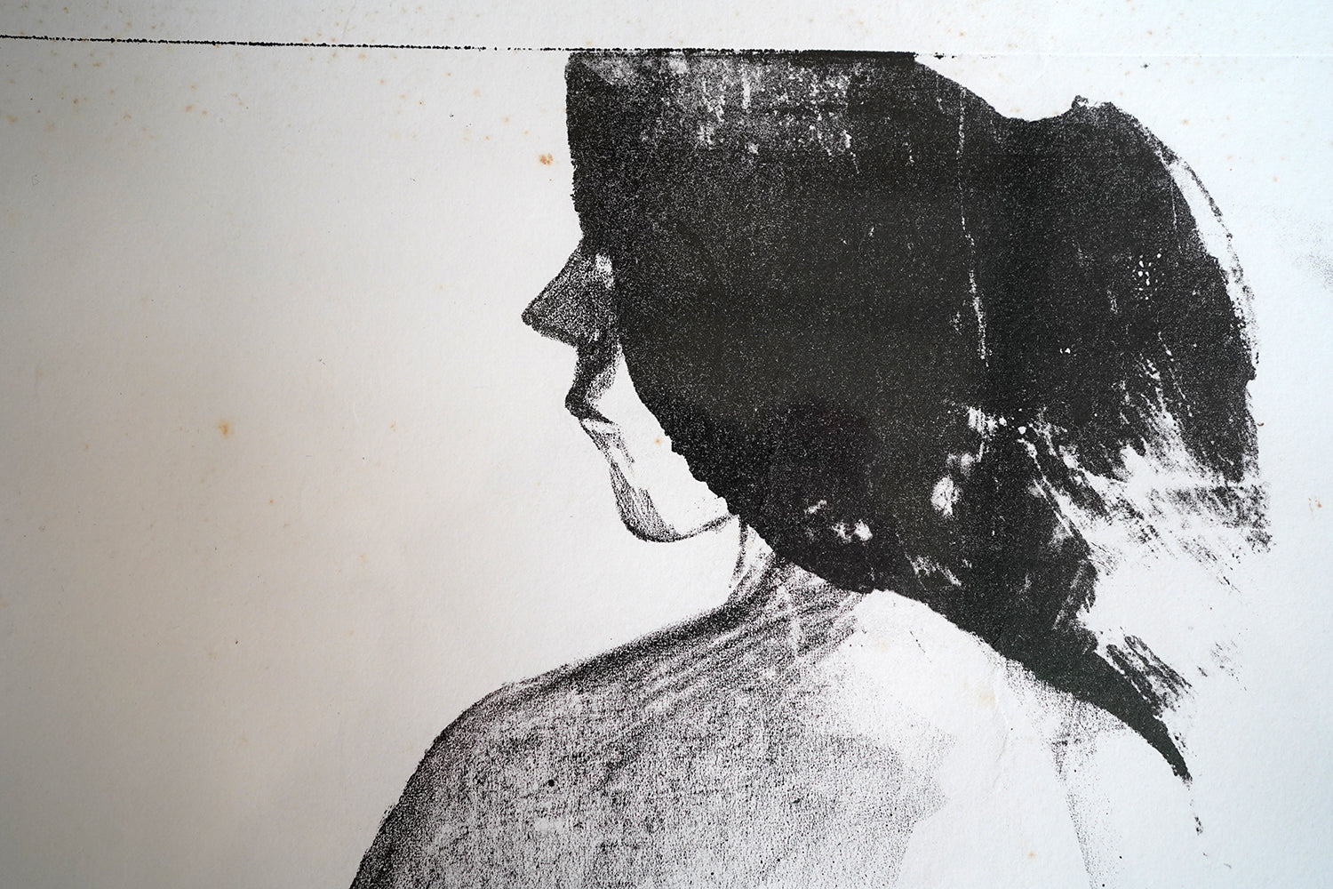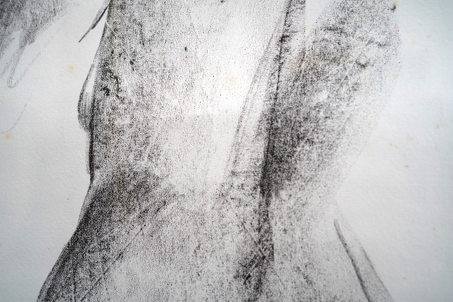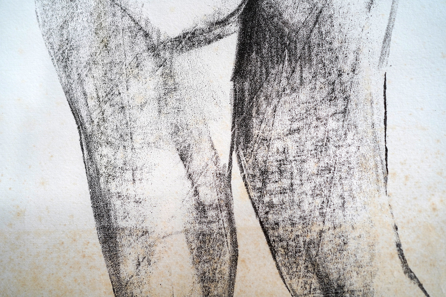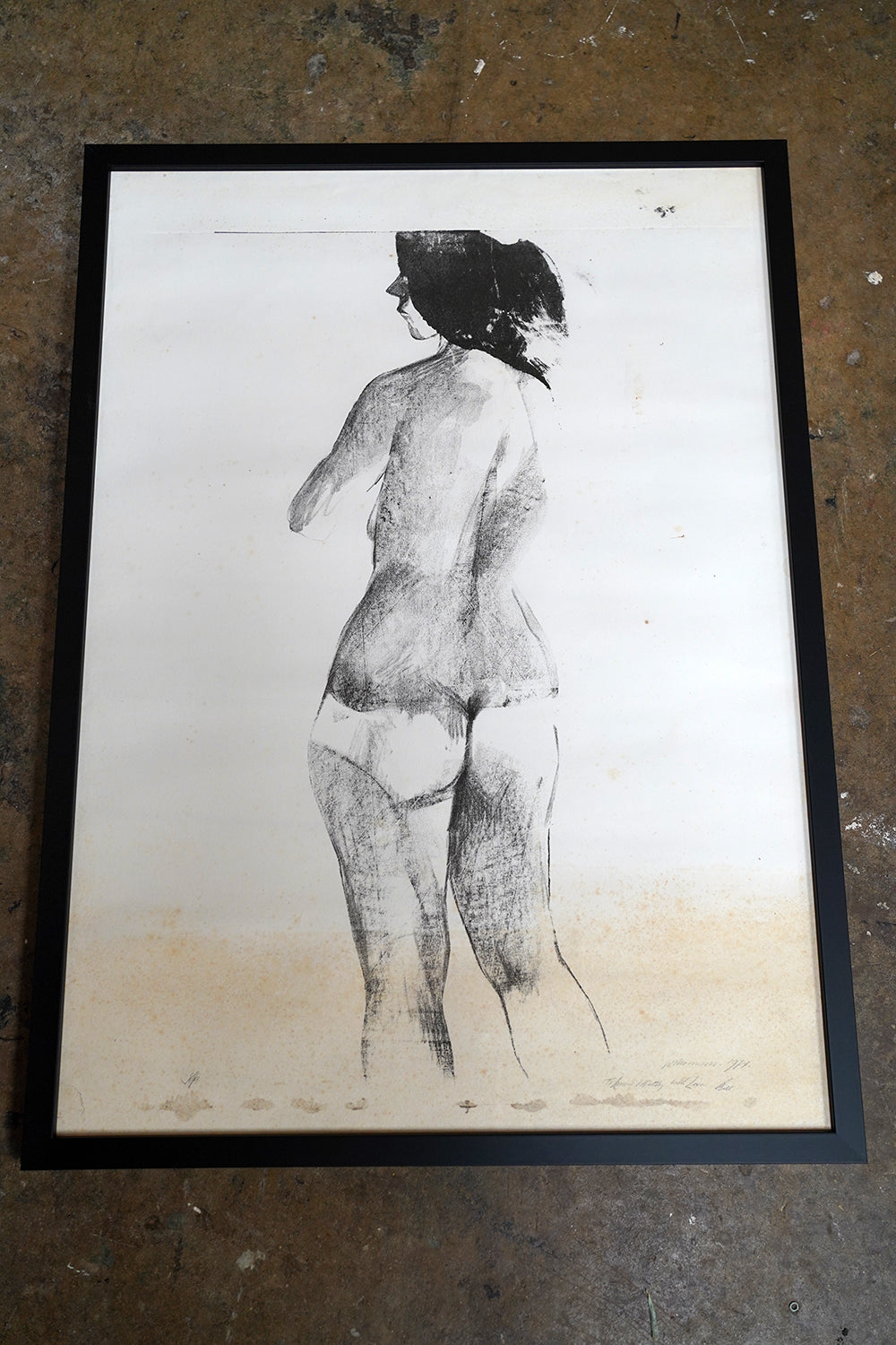 The sparse and quietly expressive standing nude study depicting a female figure shown from behind, rendered in a mixture of monotype and charcoal on a large sheet of wove paper, the artist allowing broad tonal sweeps to sit alongside sharply linear passages in the legs and lower back, the head is handled with the soft, muffled tonality characteristic of monotype pulling, while the legs and torso carry more incisive, hand-worked marks; the whole signed indistinctly at lower right “W. Moorman. 1977” and inscribed beneath in pencil “To Laurie & Kathy with love Bill” and surviving from the fourth quarter of the twentieth century.