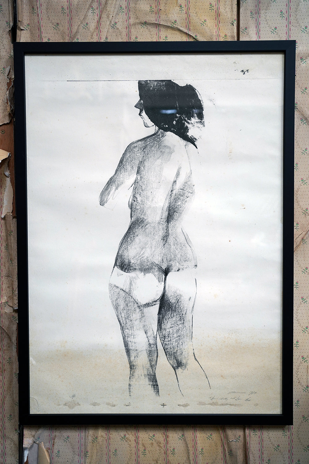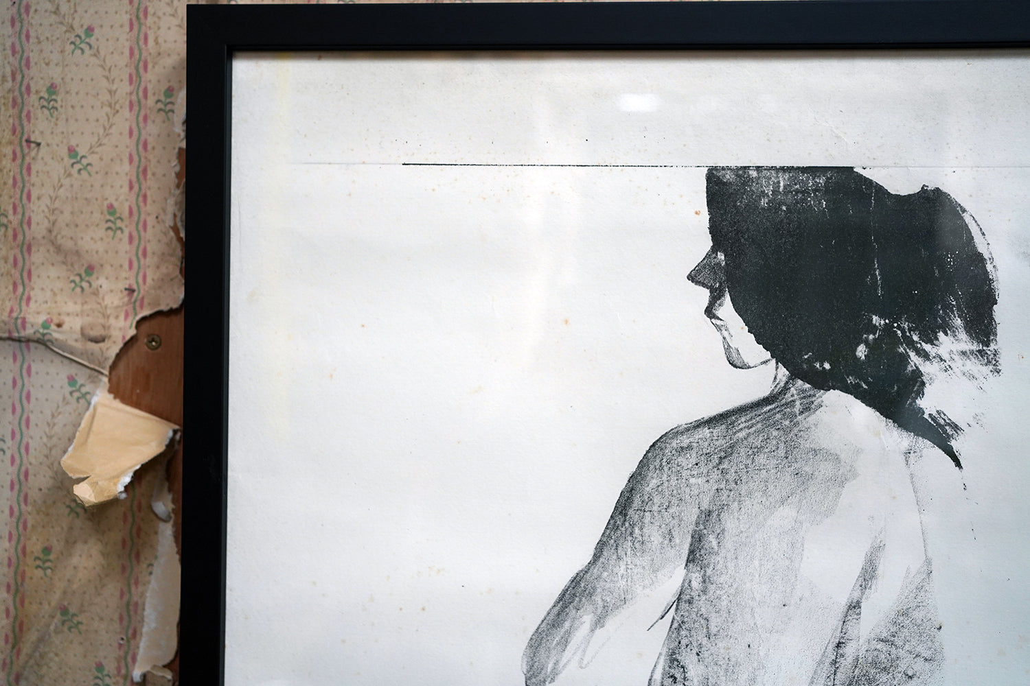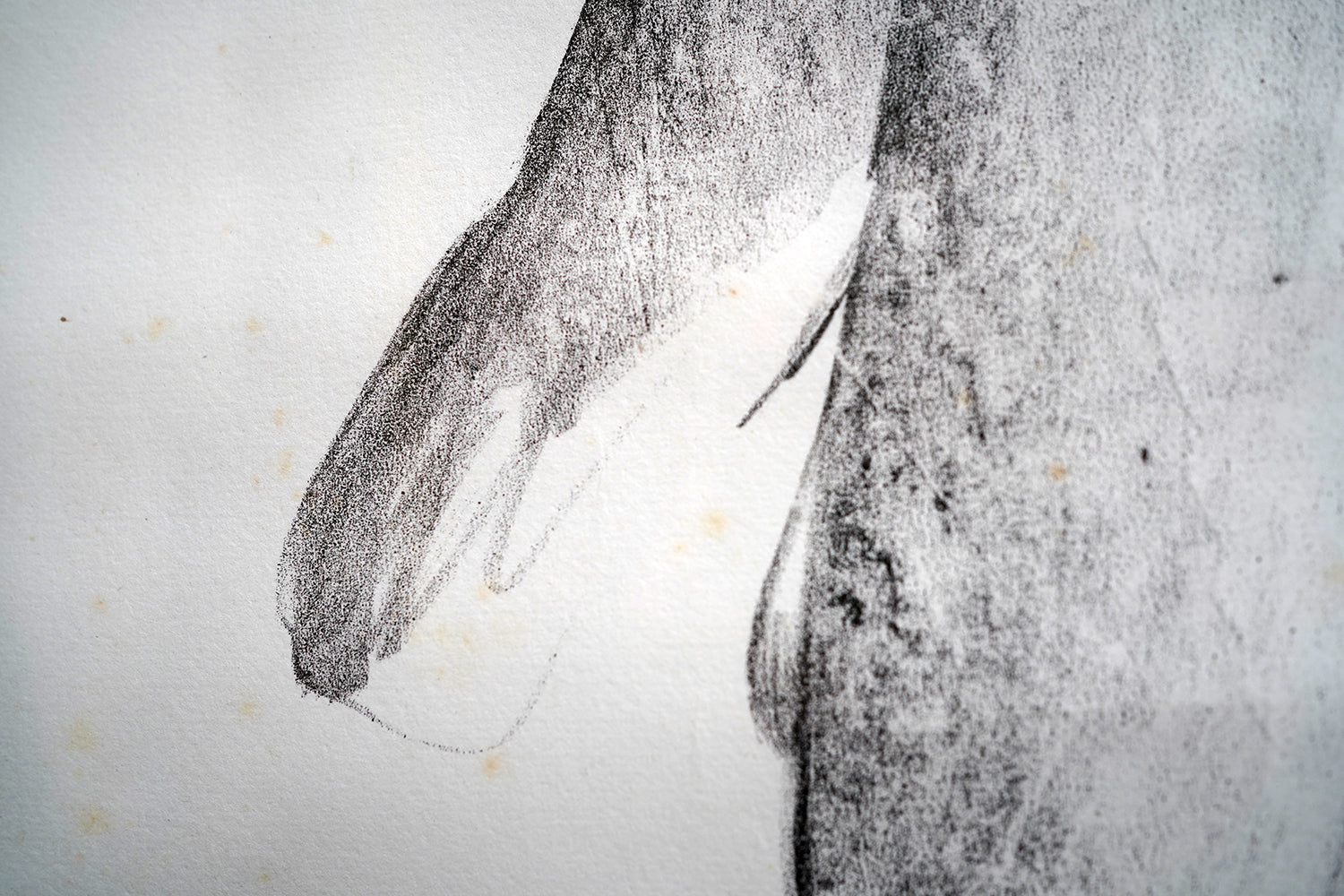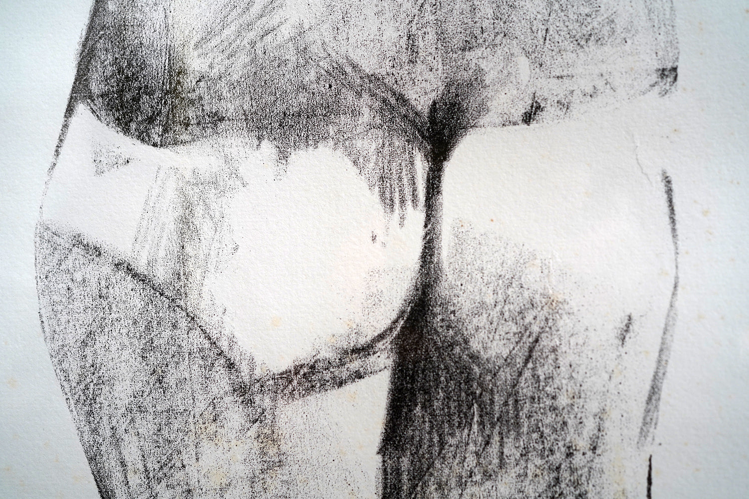 The sparse and quietly expressive standing nude study depicting a female figure shown from behind, rendered in a mixture of monotype and charcoal on a large sheet of wove paper, the artist allowing broad tonal sweeps to sit alongside sharply linear passages in the legs and lower back, the head is handled with the soft, muffled tonality characteristic of monotype pulling, while the legs and torso carry more incisive, hand-worked marks; the whole signed indistinctly at lower right “W. Moorman. 1977” and inscribed beneath in pencil “To Laurie & Kathy with love Bill” and surviving from the fourth quarter of the twentieth century.