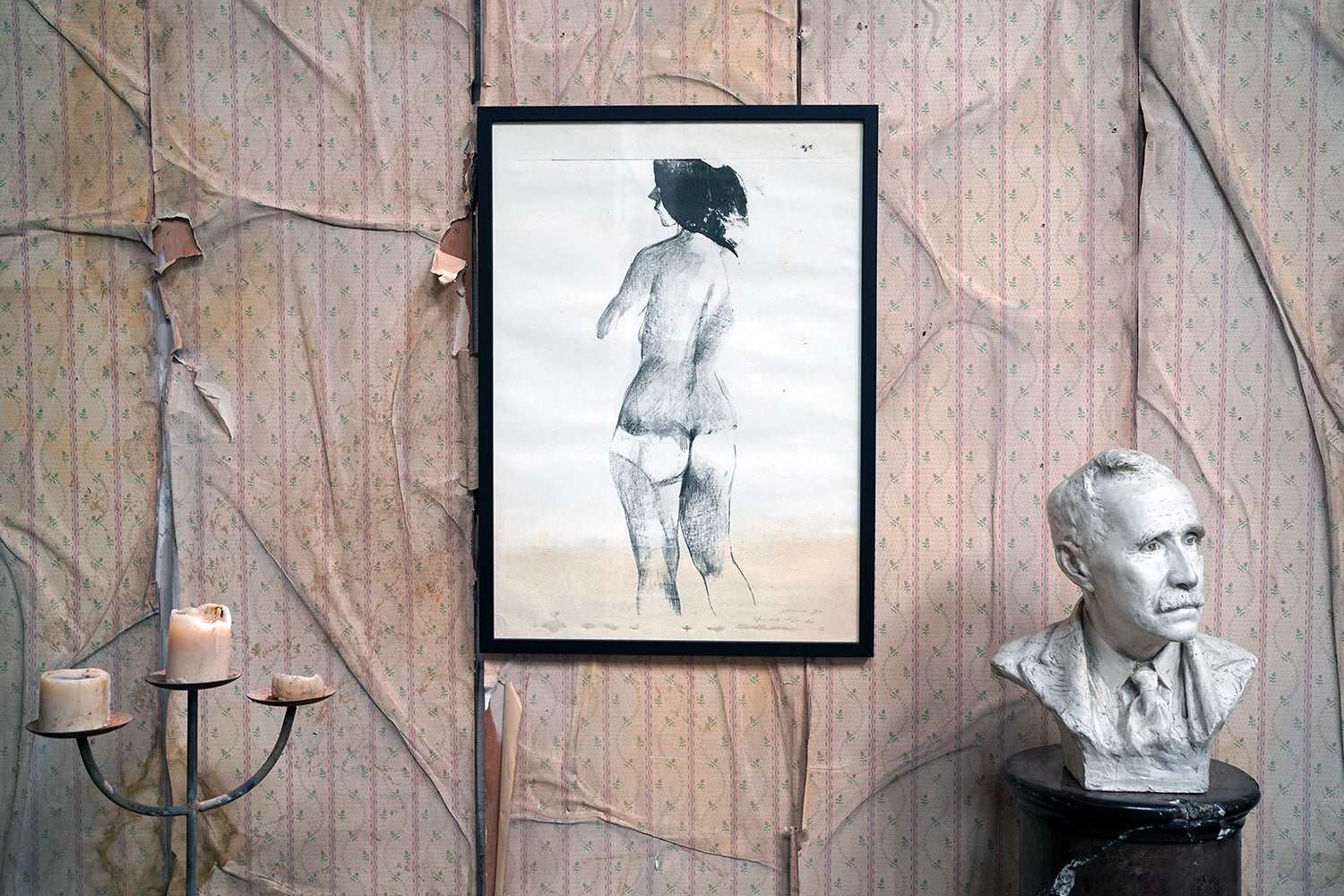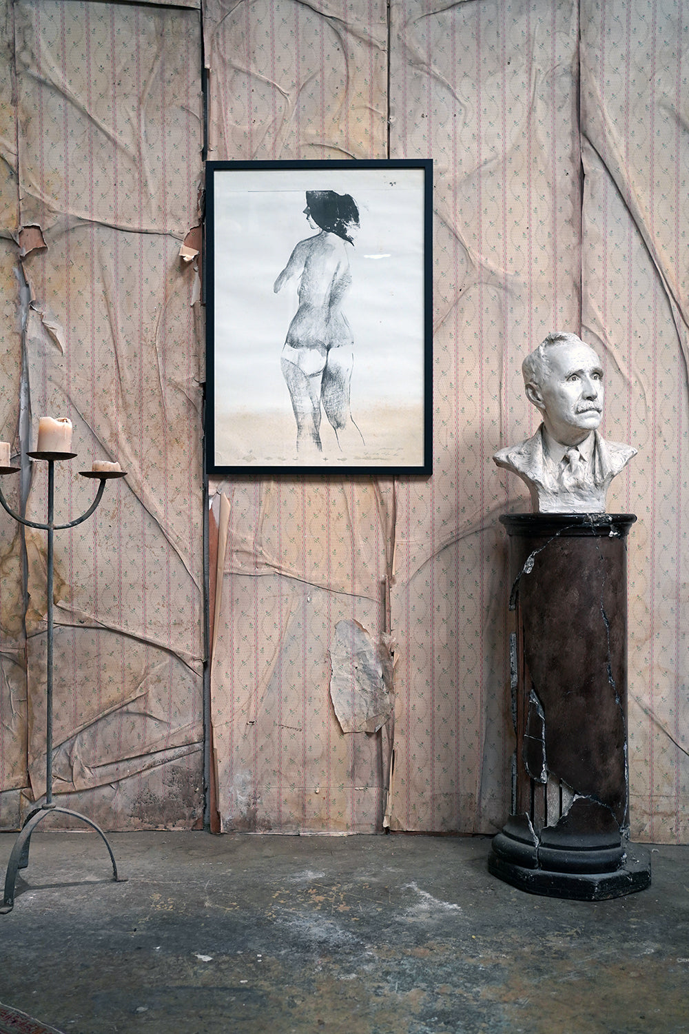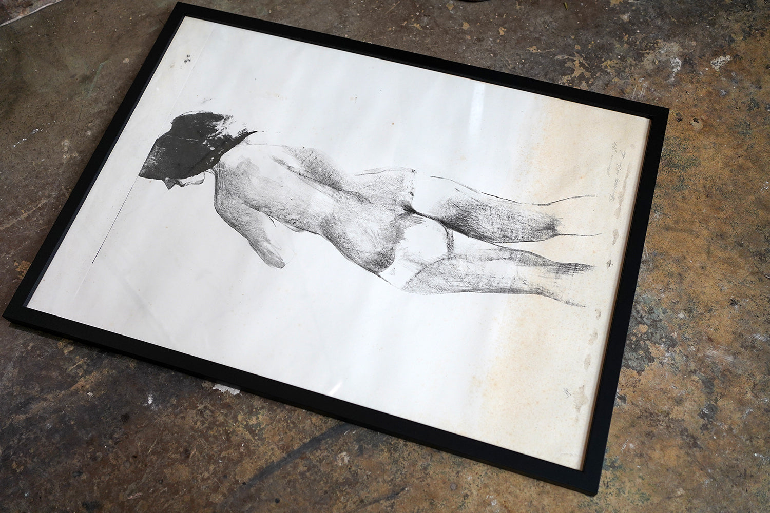 A large and atmospheric nude study whose scale, inscription, and gently time-worn surface all contribute to its quiet presence making it an evocative piece of studio work by Bill Moorman, enriched by its intimate link to Laurie and Kathy Lee.