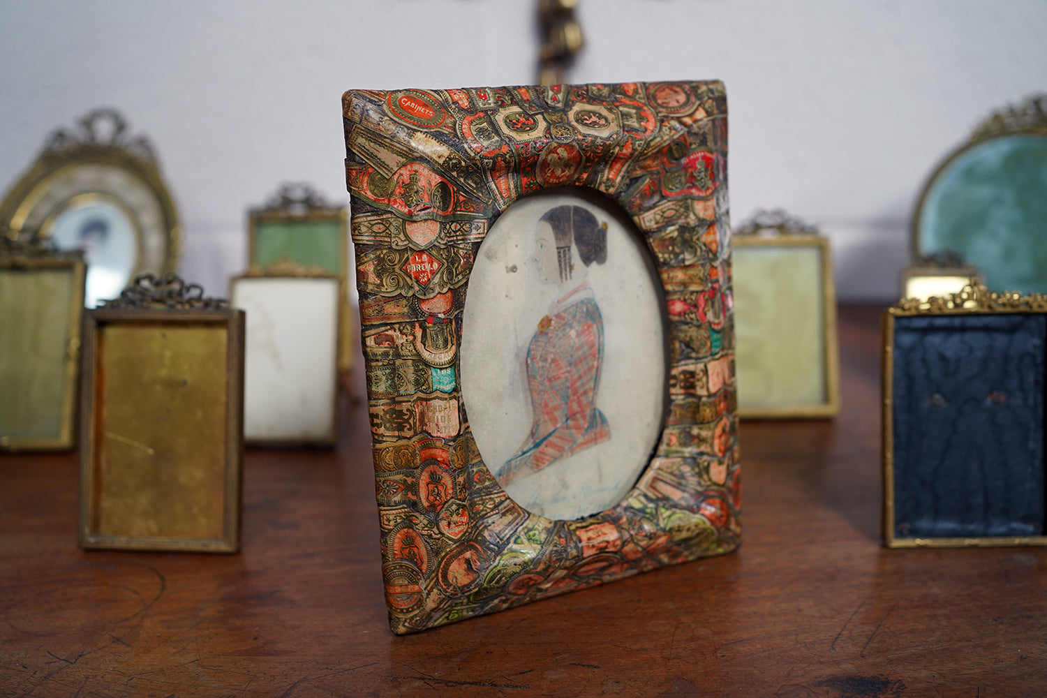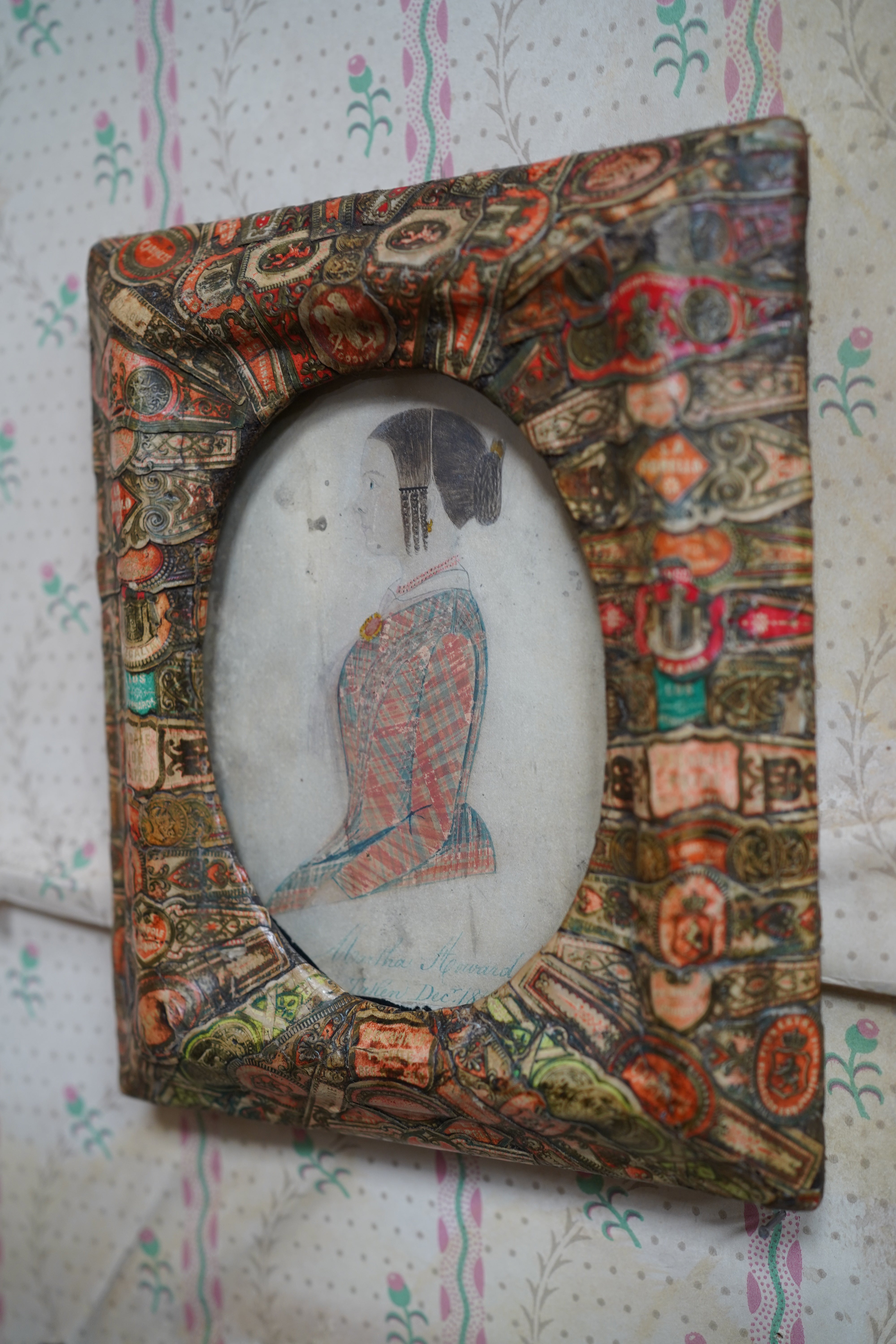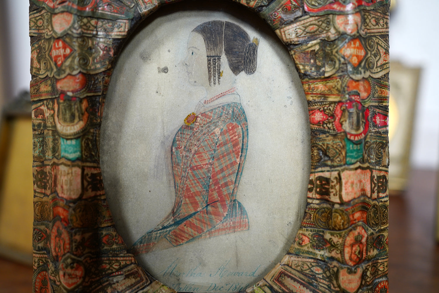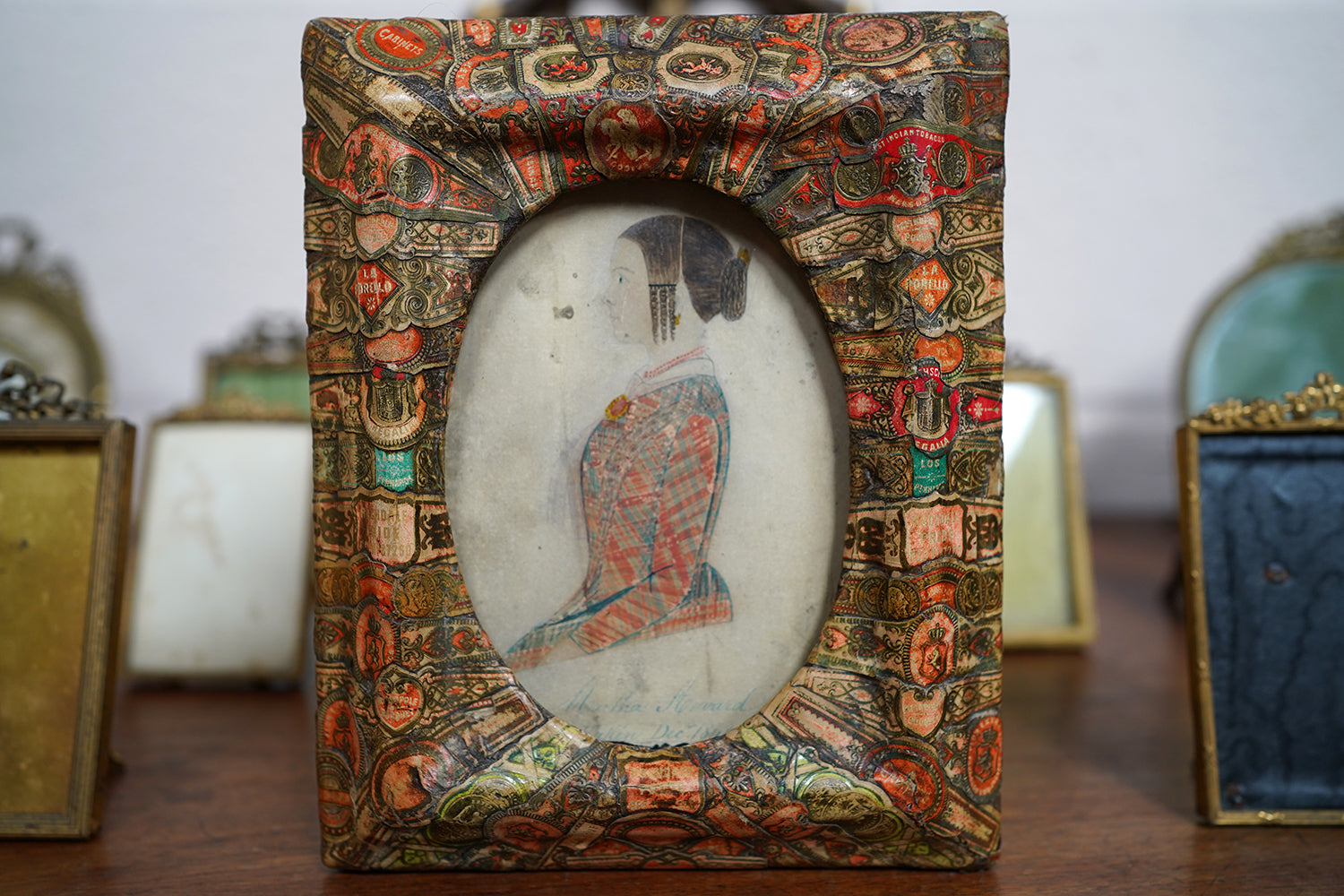 The rather unusual mid nineteenth century naïve Scottish portrait miniature crafted in watercolours and pen and ink on card; showing a lady in profile inscribed beneath in contemporary hand "Martha Howard - Taken Dec 1848", the sitter shown in crisp profile, her hair arranged in side ringlets and a back knot, and wearing a vividly rendered red tartan Highland-revival dress with a coral-beaded necklace and brooch, the whole presented in its original and wonderfully eccentric frame, applied all over with mid-19th-century cigar labels, with oval aperture, the reverse of the portrait with pencil inscriptions and surviving from the very early Victorian period.