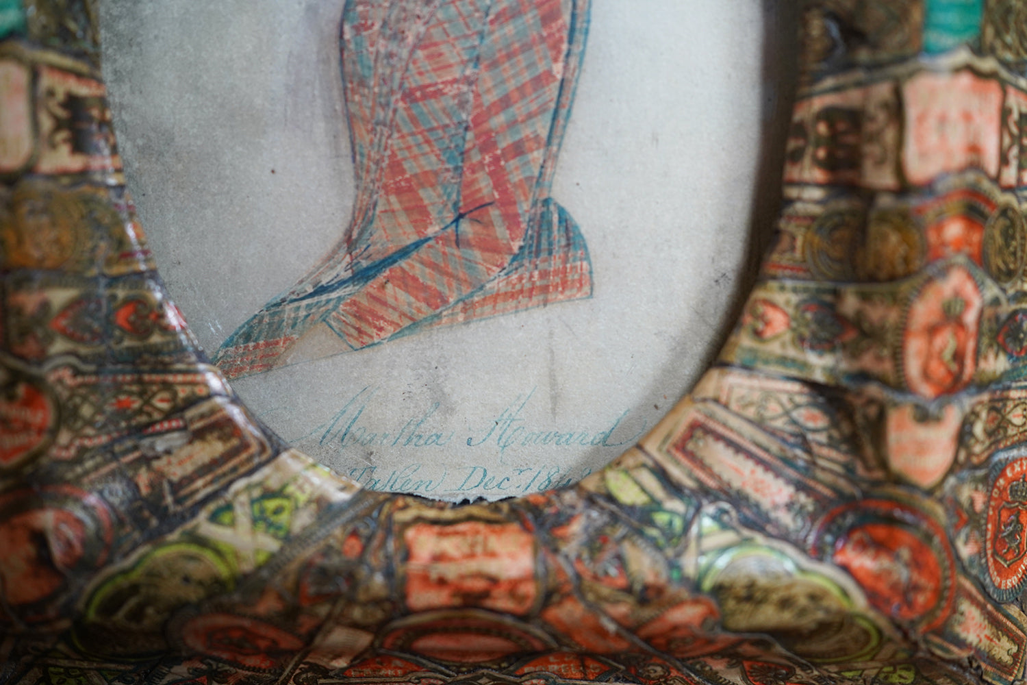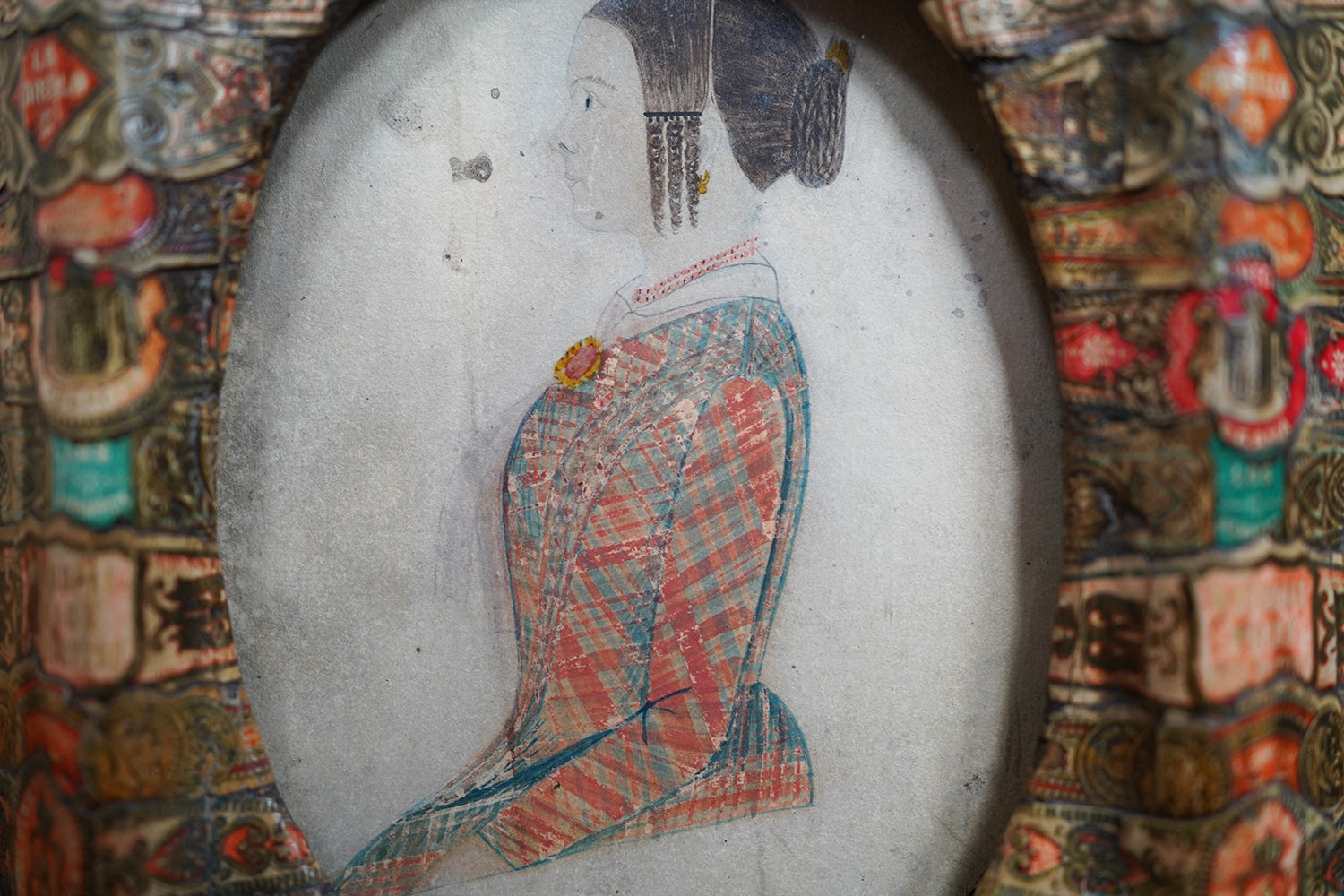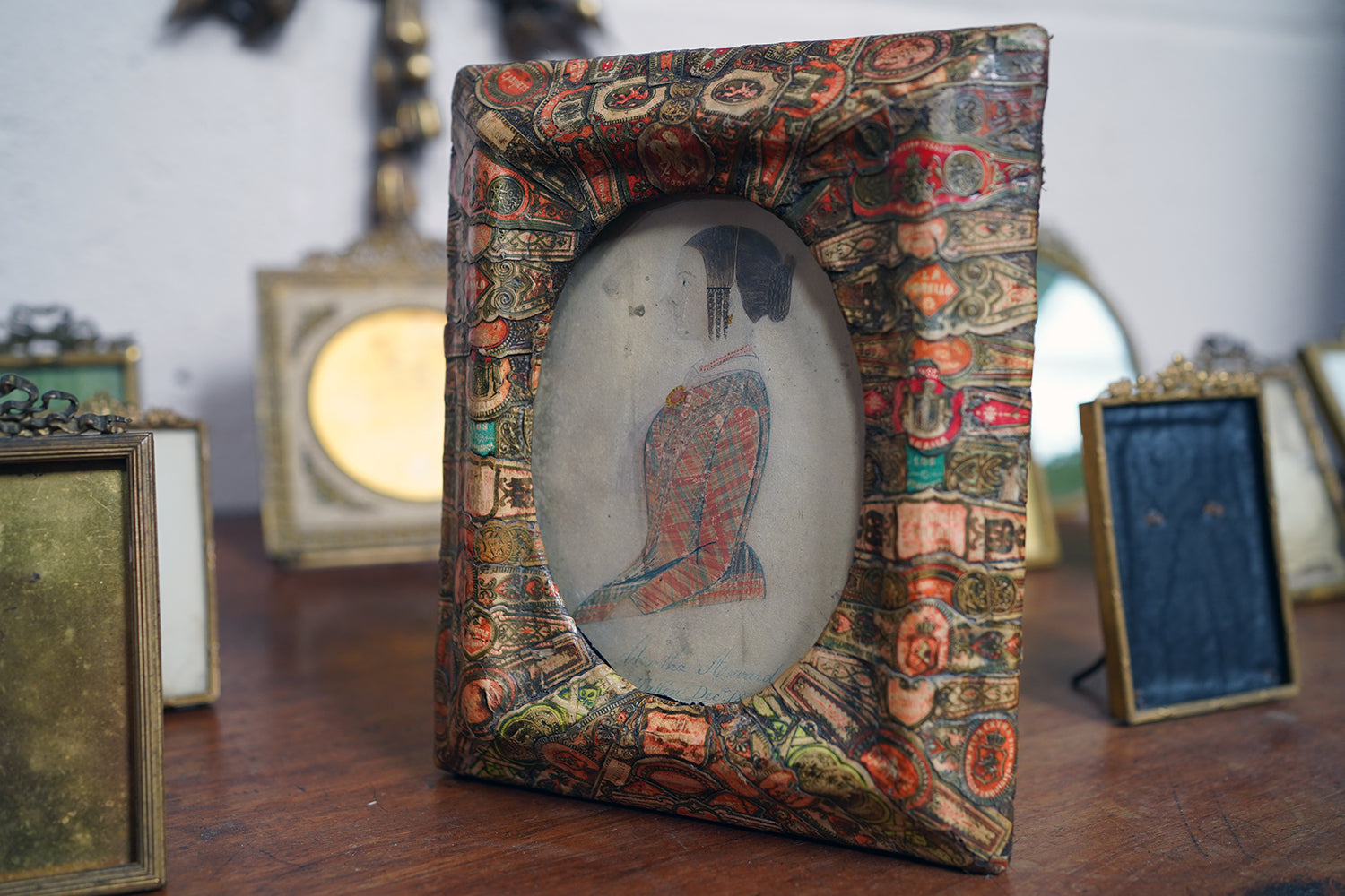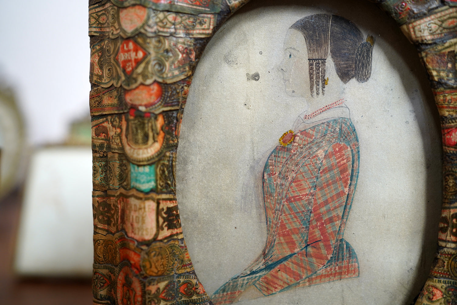 The rather unusual mid nineteenth century naïve Scottish portrait miniature crafted in watercolours and pen and ink on card; showing a lady in profile inscribed beneath in contemporary hand "Martha Howard - Taken Dec 1848", the sitter shown in crisp profile, her hair arranged in side ringlets and a back knot, and wearing a vividly rendered red tartan Highland-revival dress with a coral-beaded necklace and brooch, the whole presented in its original and wonderfully eccentric frame, applied all over with mid-19th-century cigar labels, with oval aperture, the reverse of the portrait with pencil inscriptions and surviving from the very early Victorian period.