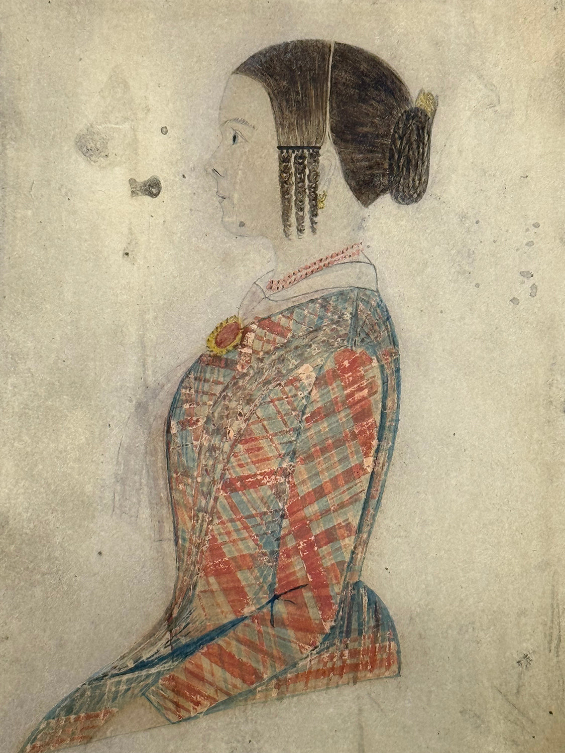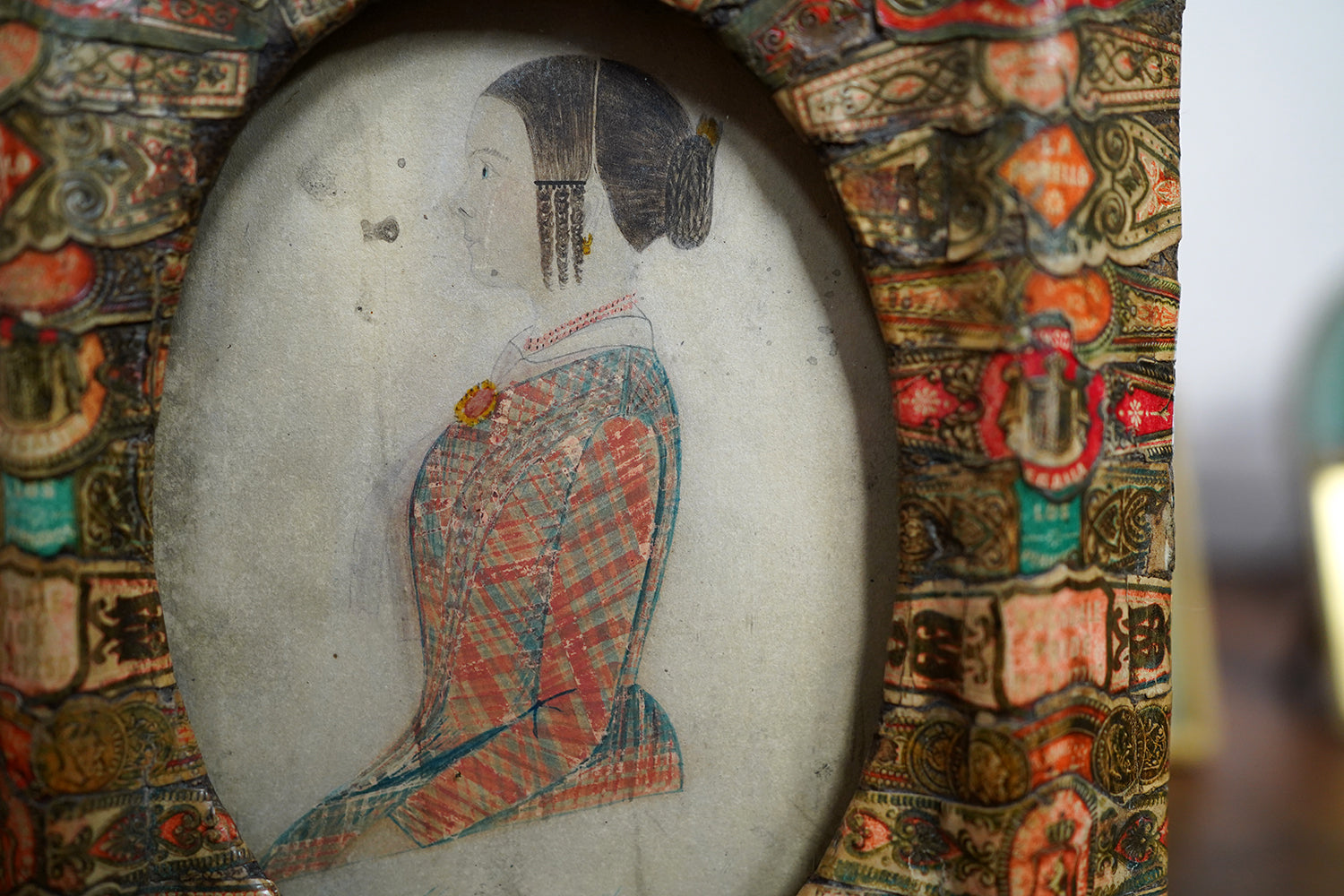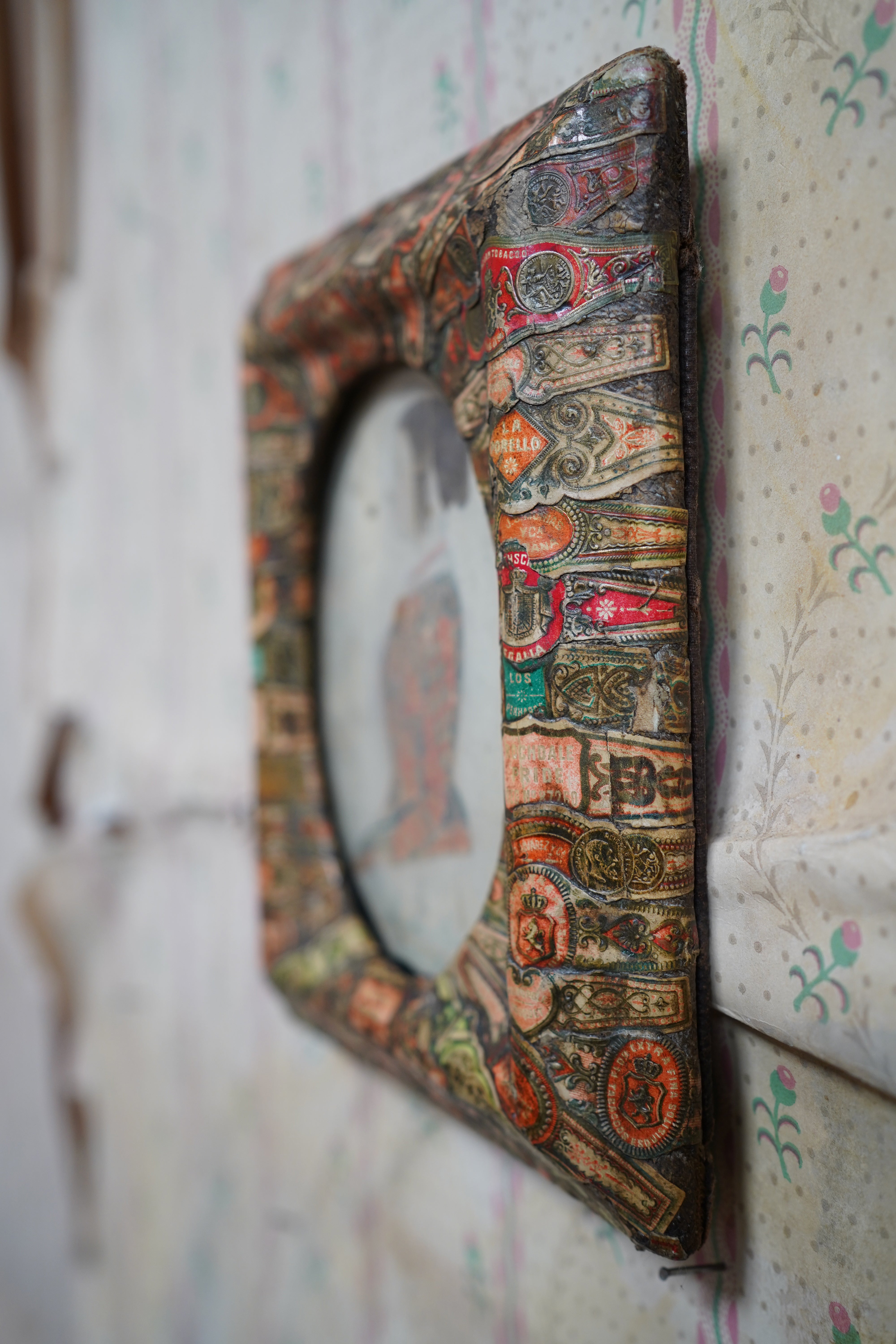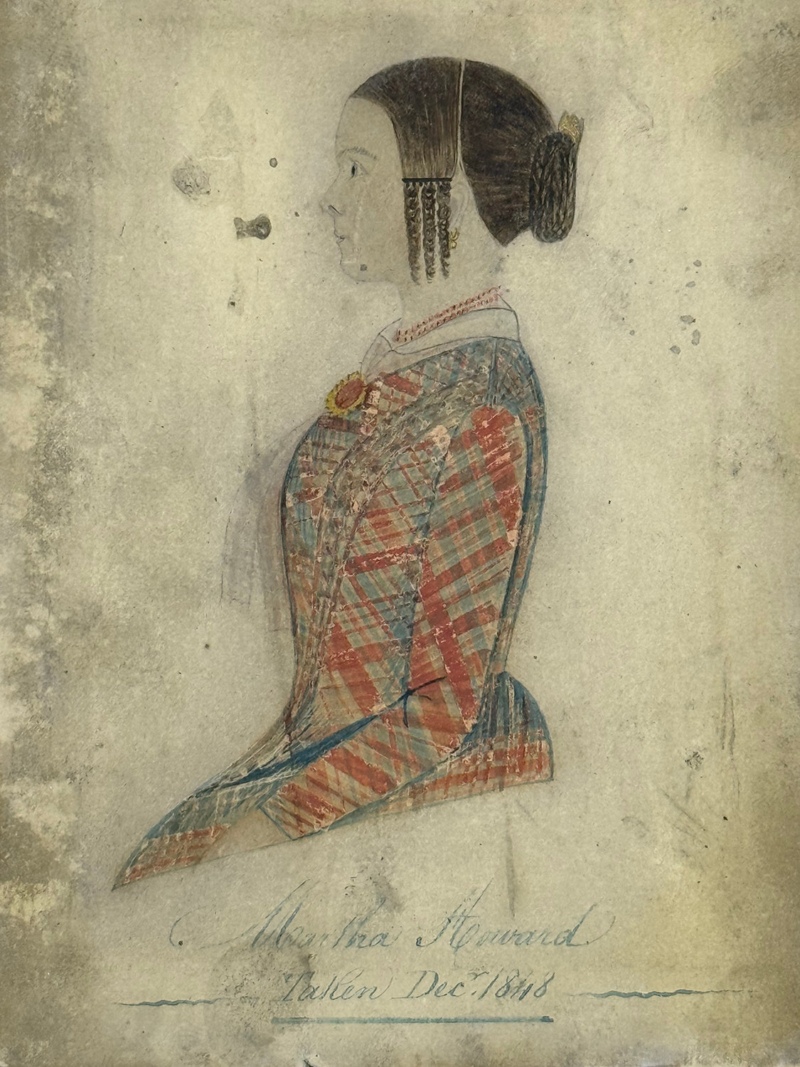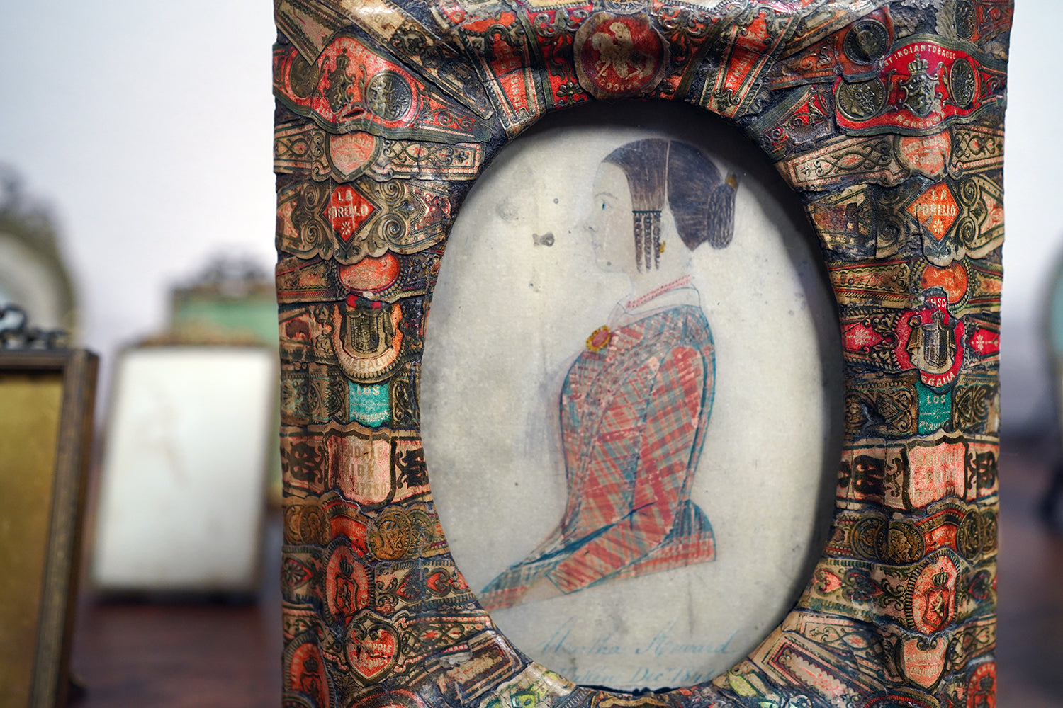 The rather unusual mid nineteenth century naïve Scottish portrait miniature crafted in watercolours and pen and ink on card; showing a lady in profile inscribed beneath in contemporary hand "Martha Howard - Taken Dec 1848", the sitter shown in crisp profile, her hair arranged in side ringlets and a back knot, and wearing a vividly rendered red tartan Highland-revival dress with a coral-beaded necklace and brooch, the whole presented in its original and wonderfully eccentric frame, applied all over with mid-19th-century cigar labels, with oval aperture, the reverse of the portrait with pencil inscriptions and surviving from the very early Victorian period.