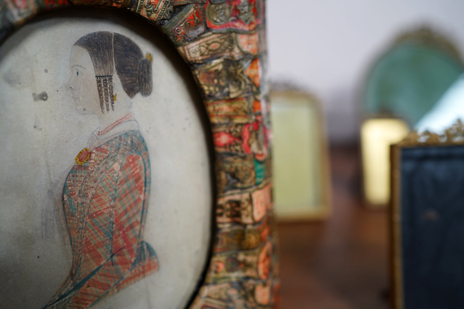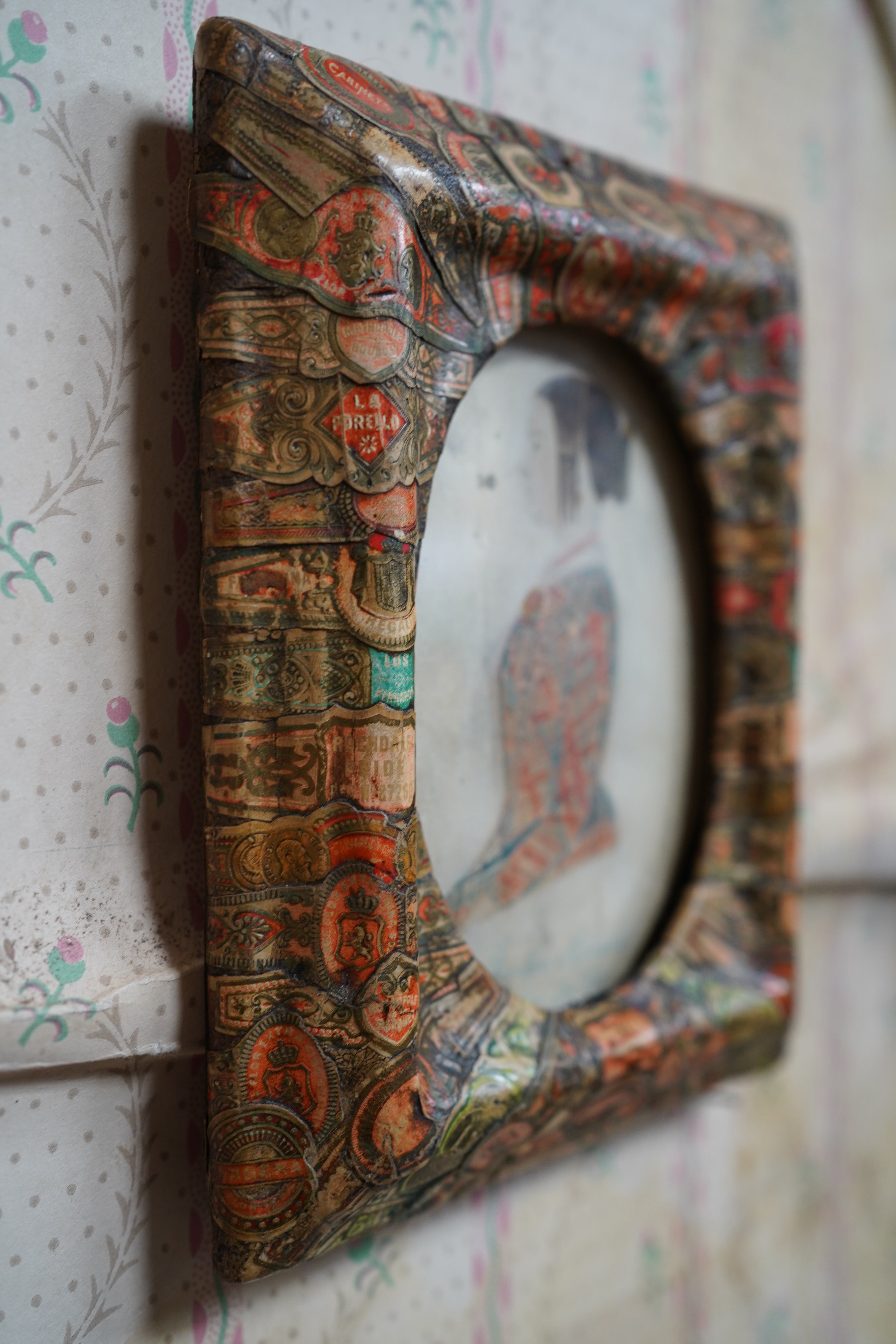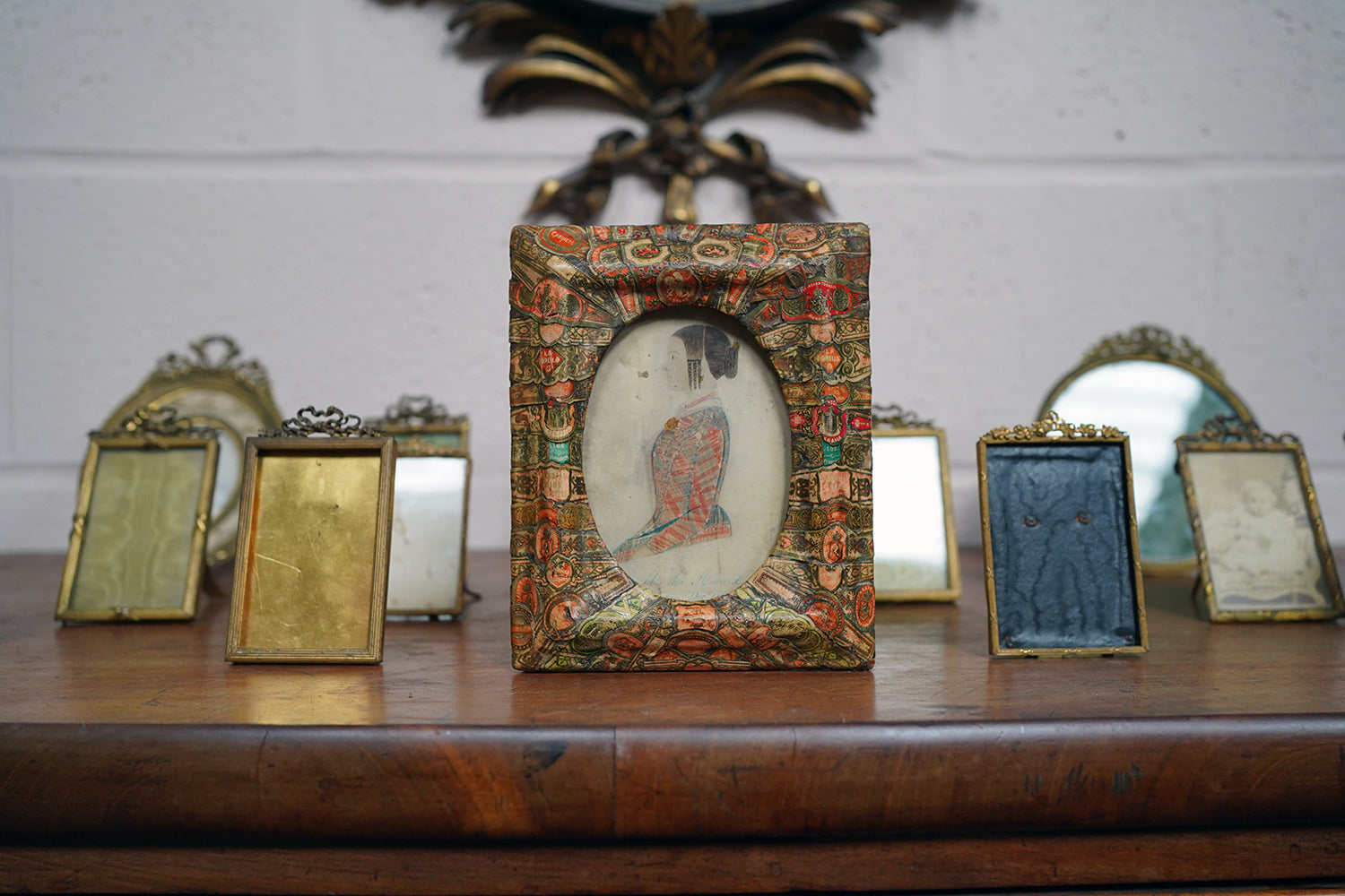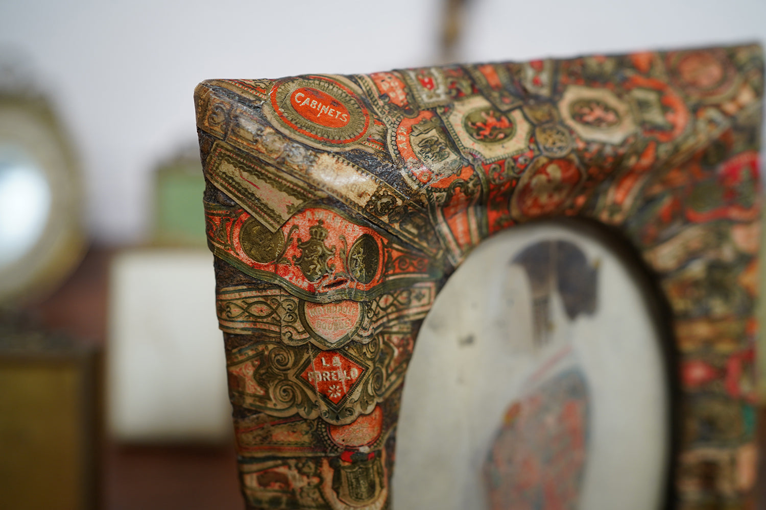 The rather unusual mid nineteenth century naïve Scottish portrait miniature crafted in watercolours and pen and ink on card; showing a lady in profile inscribed beneath in contemporary hand "Martha Howard - Taken Dec 1848", the sitter shown in crisp profile, her hair arranged in side ringlets and a back knot, and wearing a vividly rendered red tartan Highland-revival dress with a coral-beaded necklace and brooch, the whole presented in its original and wonderfully eccentric frame, applied all over with mid-19th-century cigar labels, with oval aperture, the reverse of the portrait with pencil inscriptions and surviving from the very early Victorian period.