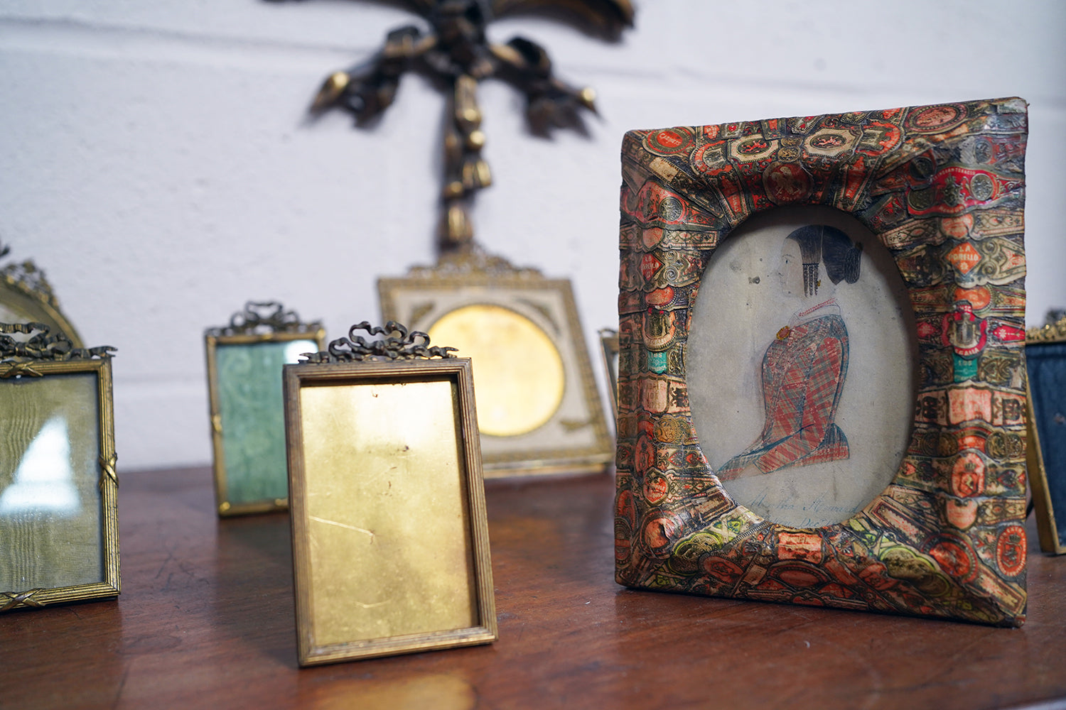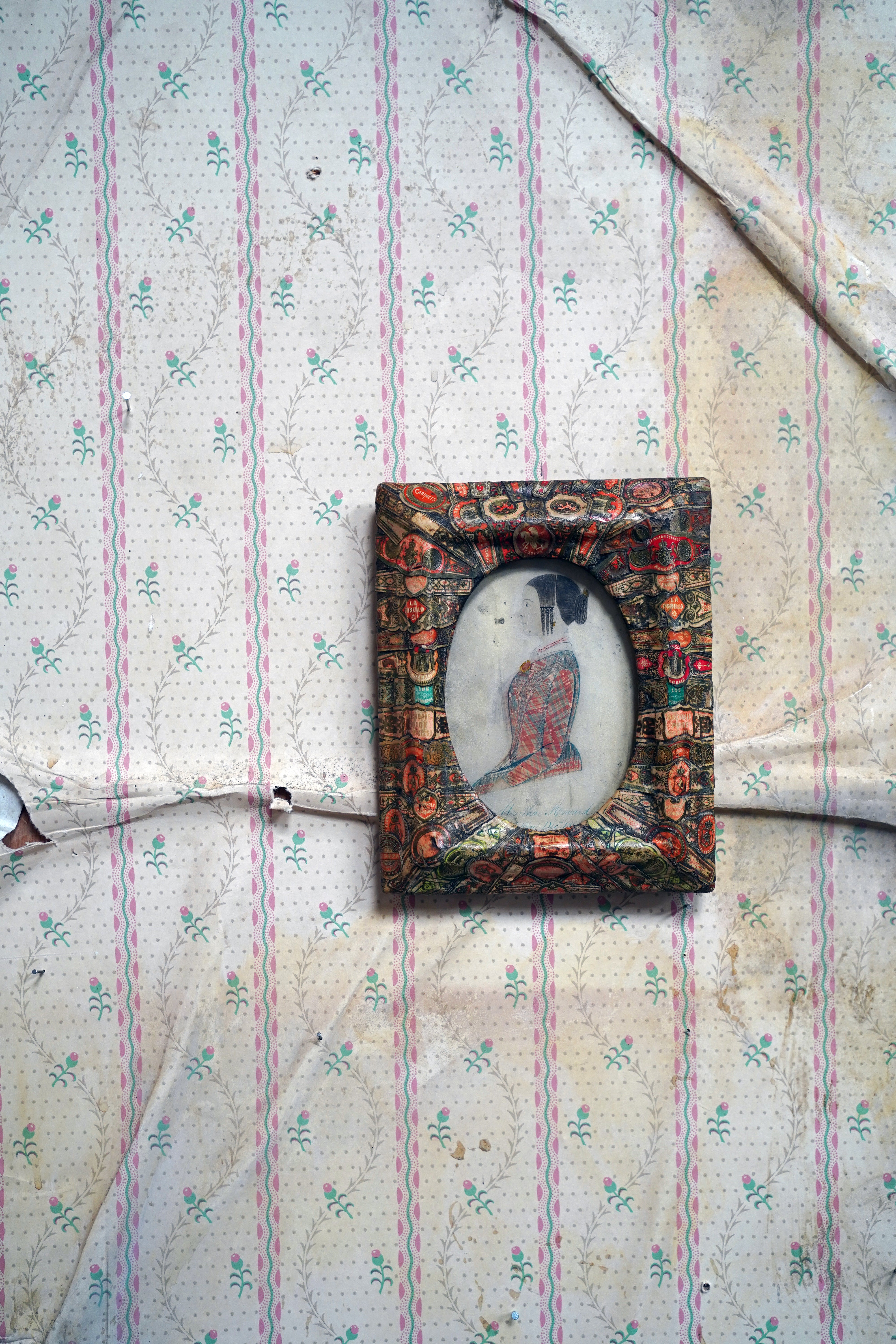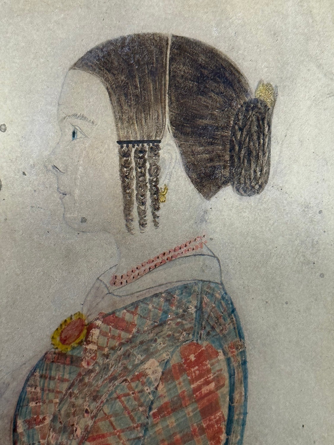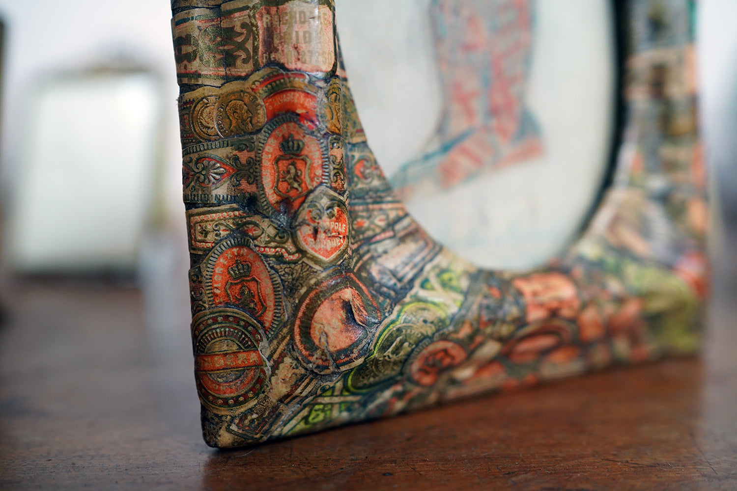 The rather unusual mid nineteenth century naïve Scottish portrait miniature crafted in watercolours and pen and ink on card; showing a lady in profile inscribed beneath in contemporary hand "Martha Howard - Taken Dec 1848", the sitter shown in crisp profile, her hair arranged in side ringlets and a back knot, and wearing a vividly rendered red tartan Highland-revival dress with a coral-beaded necklace and brooch, the whole presented in its original and wonderfully eccentric frame, applied all over with mid-19th-century cigar labels, with oval aperture, the reverse of the portrait with pencil inscriptions and surviving from the very early Victorian period.