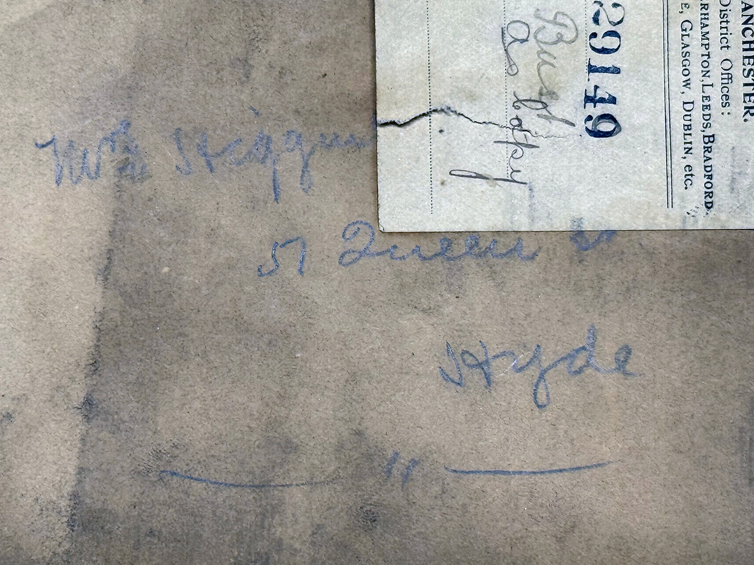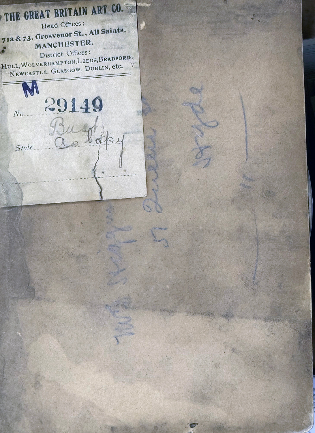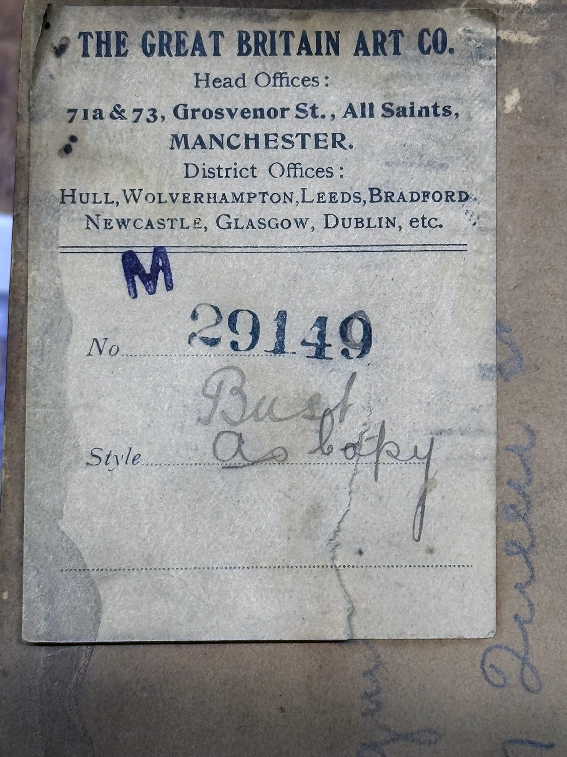 The picture has not been restored in any way with some expected surface toning and scattered marks to the card and age-related wear to the cigar-label collage with a pleasing time-worn texture. The reverse shows a Scottish postal address in Hyde and a later label for The Great Britian Art Co. numbered 29149 and style as bust as baby.