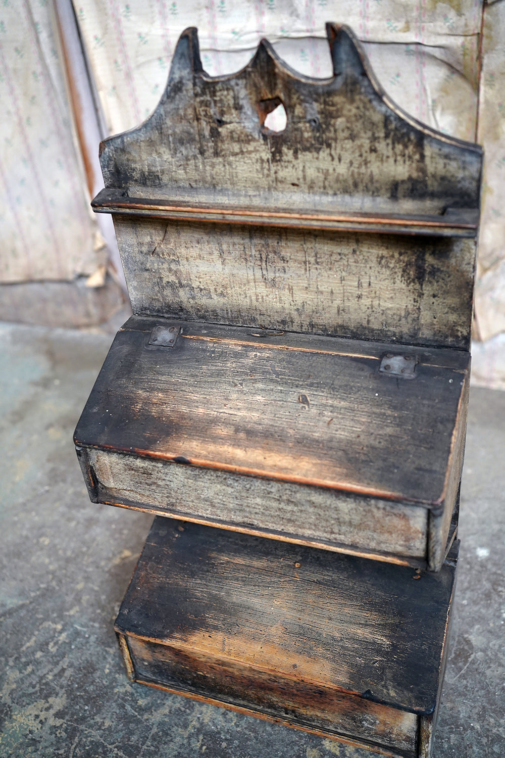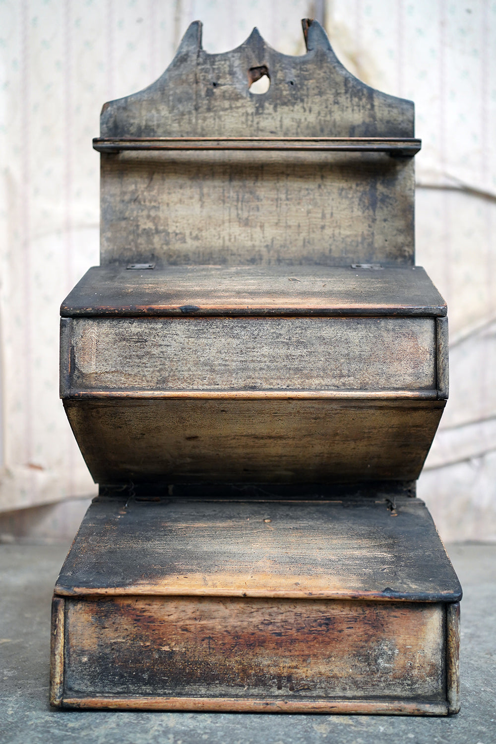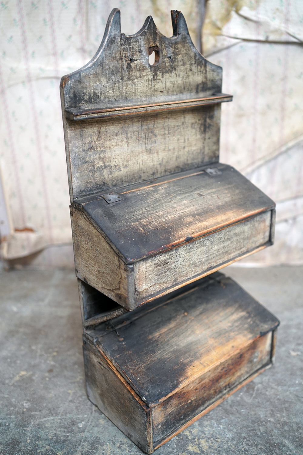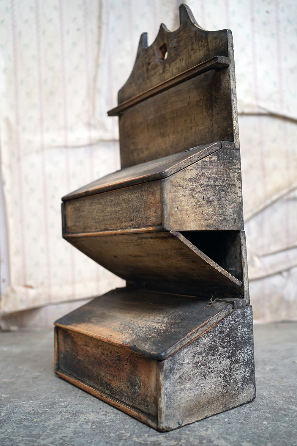 The painted pine carcass with three pronged cresting showing the wonderful original textured surface of original Georgian period pea green paint now worn and burnished to charcoal in many areas, worn thoroughly and consistently with age, having an attractive and unusual concertina shaped design, incorporating a spoon rack over a double cutlery box to hinged lids with leather and wire mounts, the whole surviving from the zeniths of eighteenth century England.