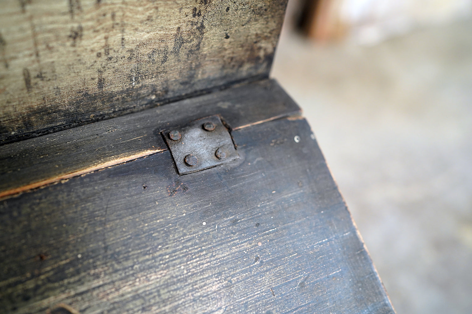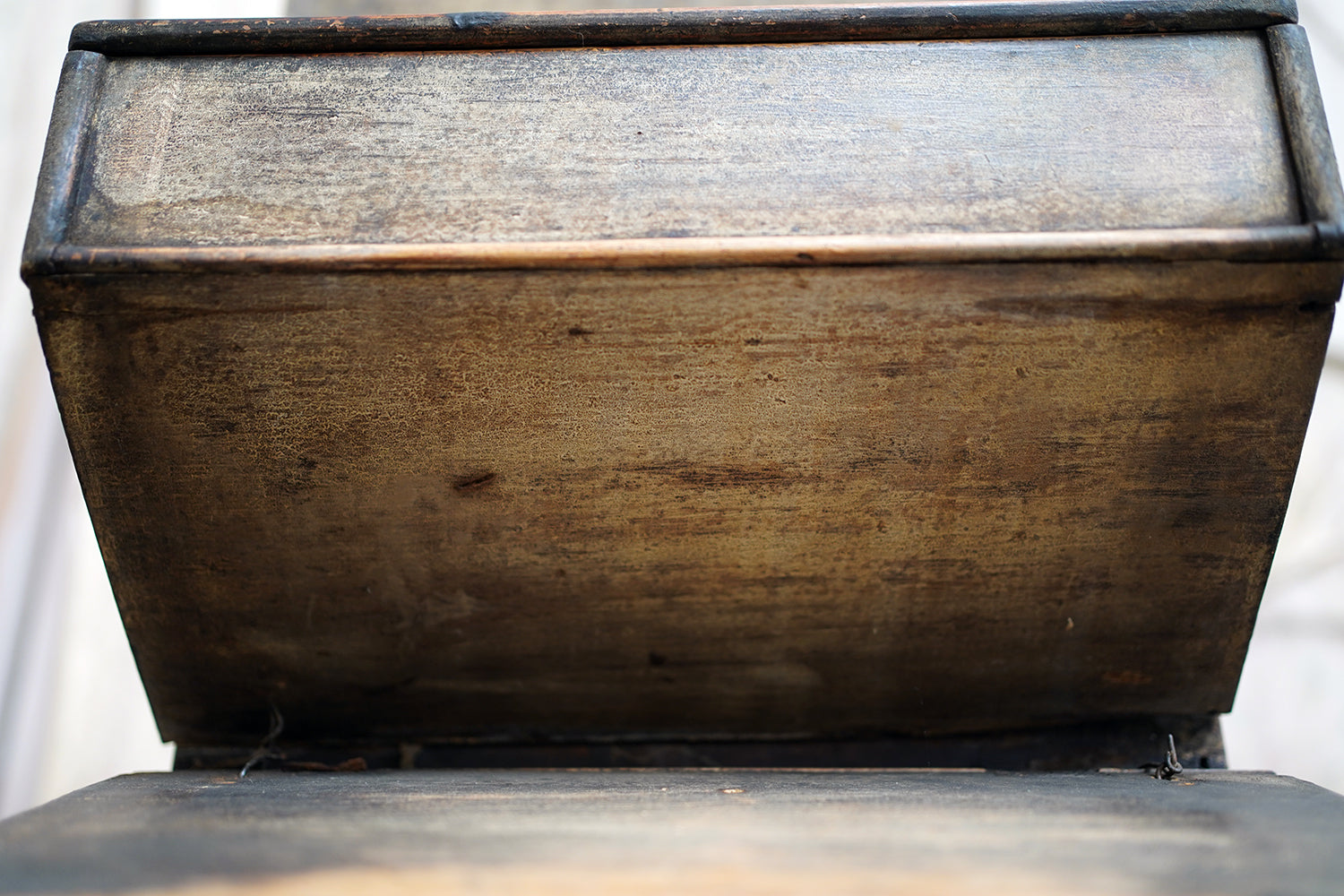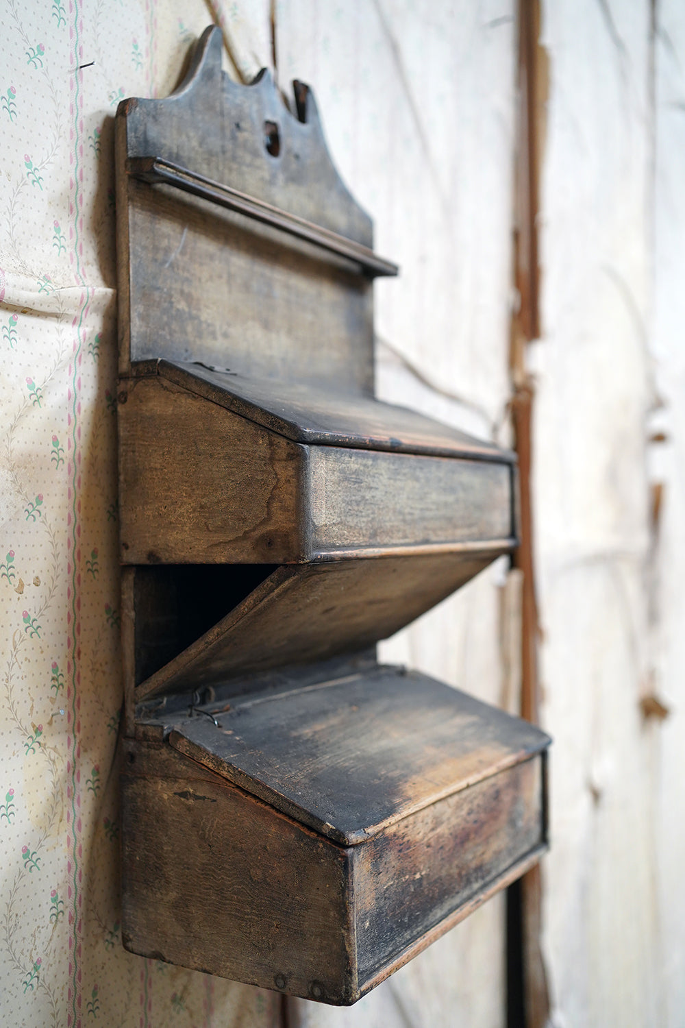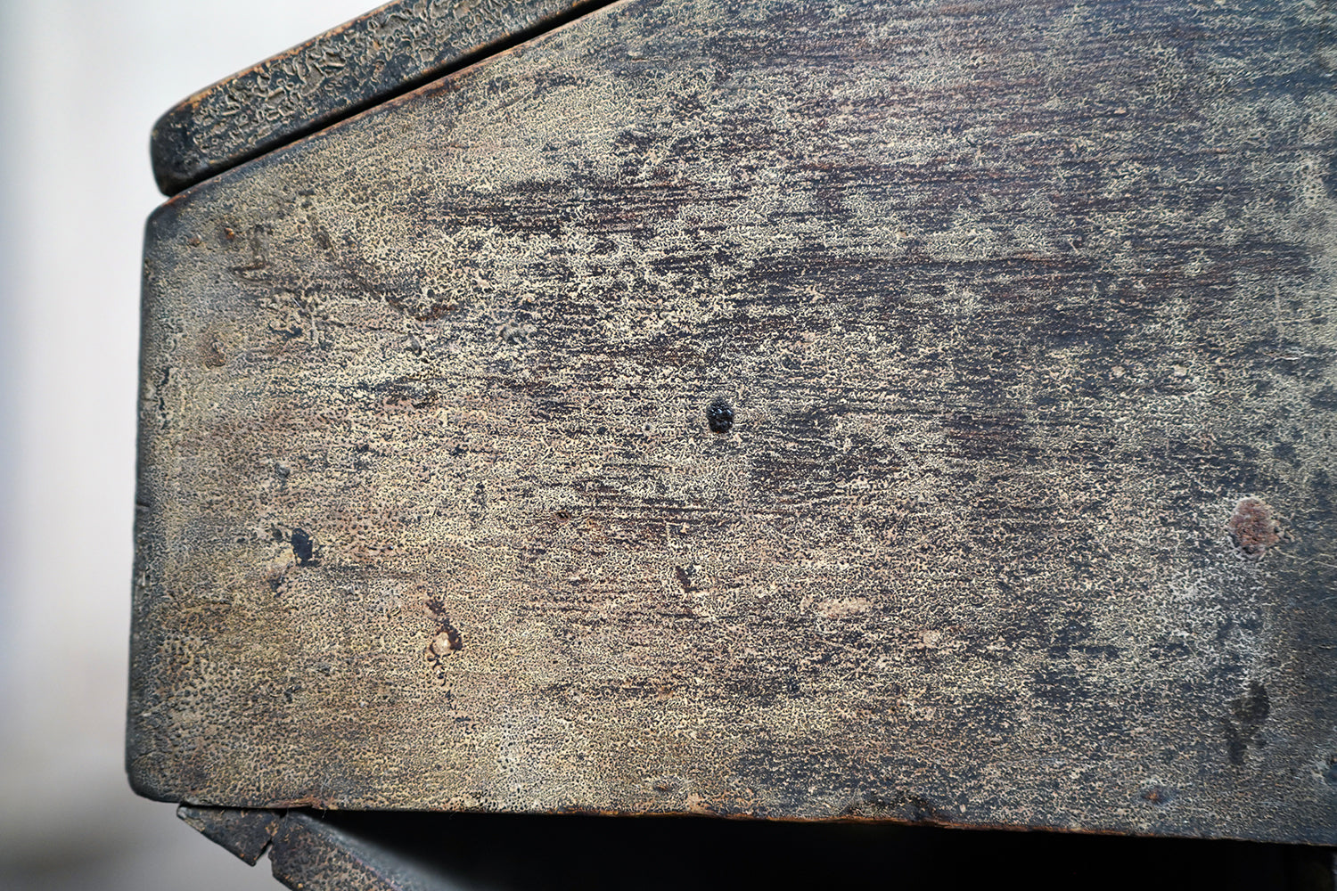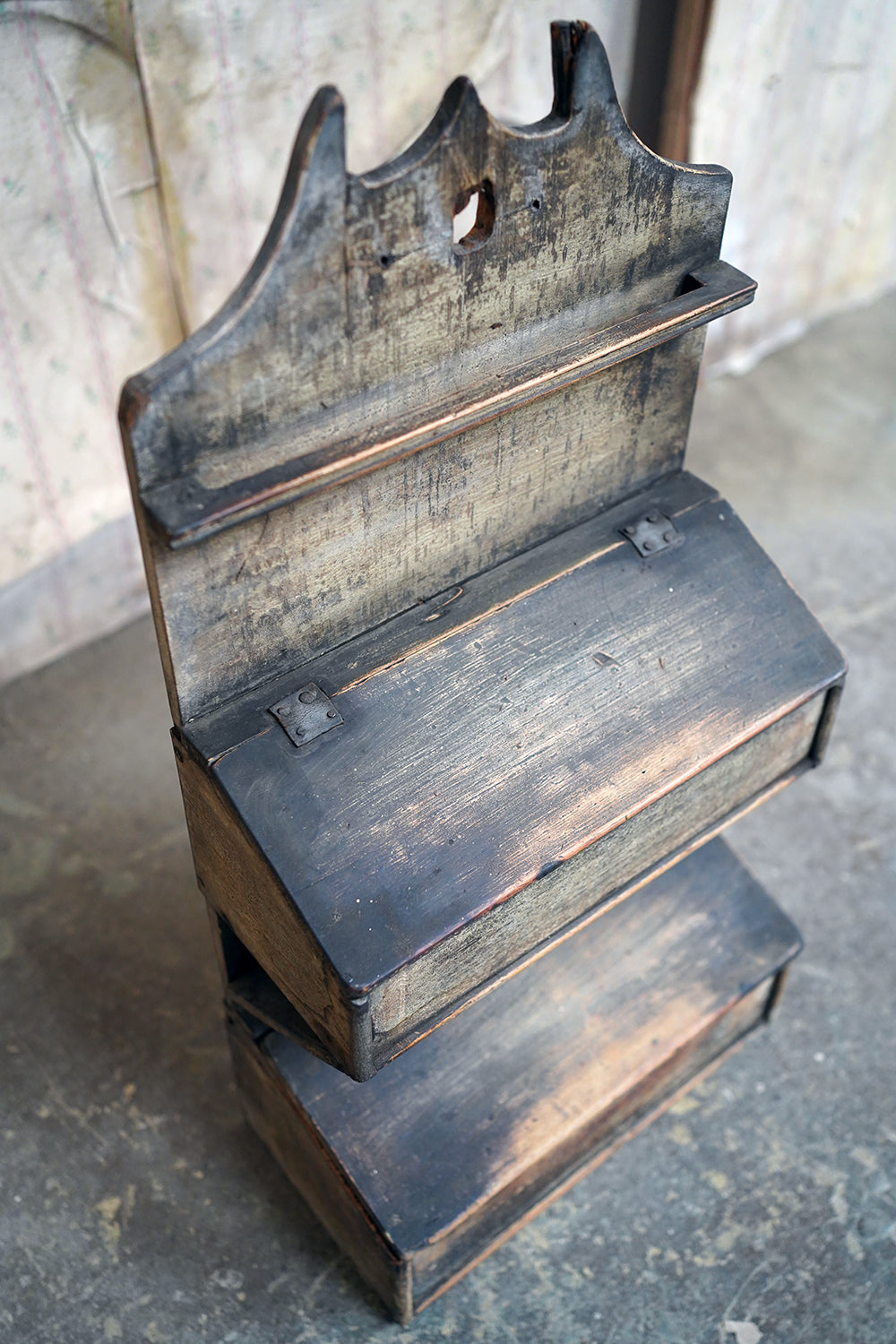 The painted pine carcass with three pronged cresting showing the wonderful original textured surface of original Georgian period pea green paint now worn and burnished to charcoal in many areas, worn thoroughly and consistently with age, having an attractive and unusual concertina shaped design, incorporating a spoon rack over a double cutlery box to hinged lids with leather and wire mounts, the whole surviving from the zeniths of eighteenth century England.