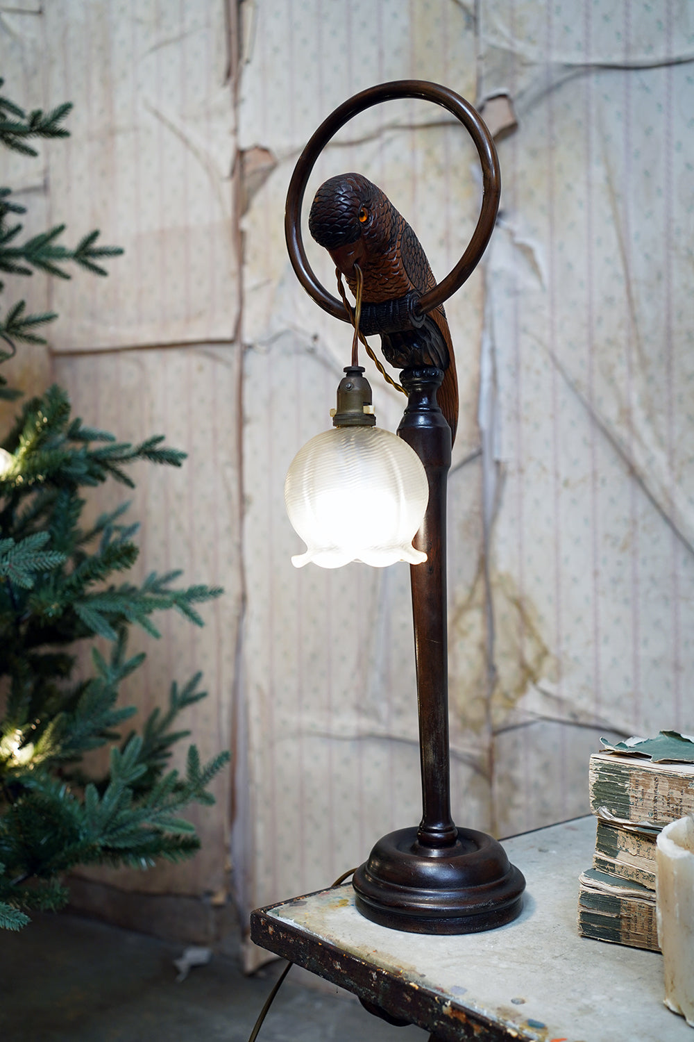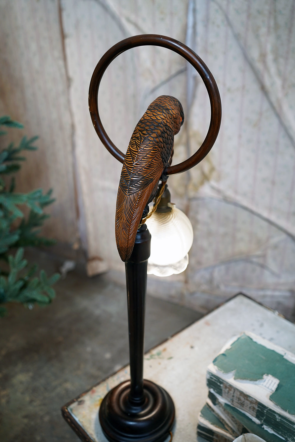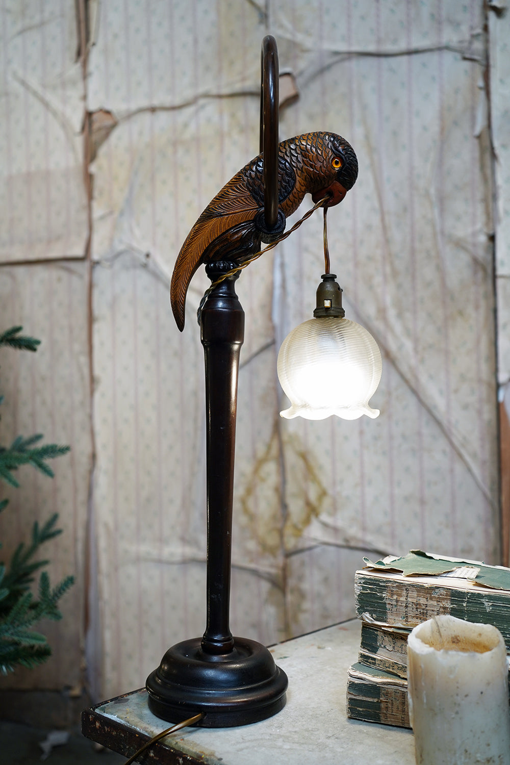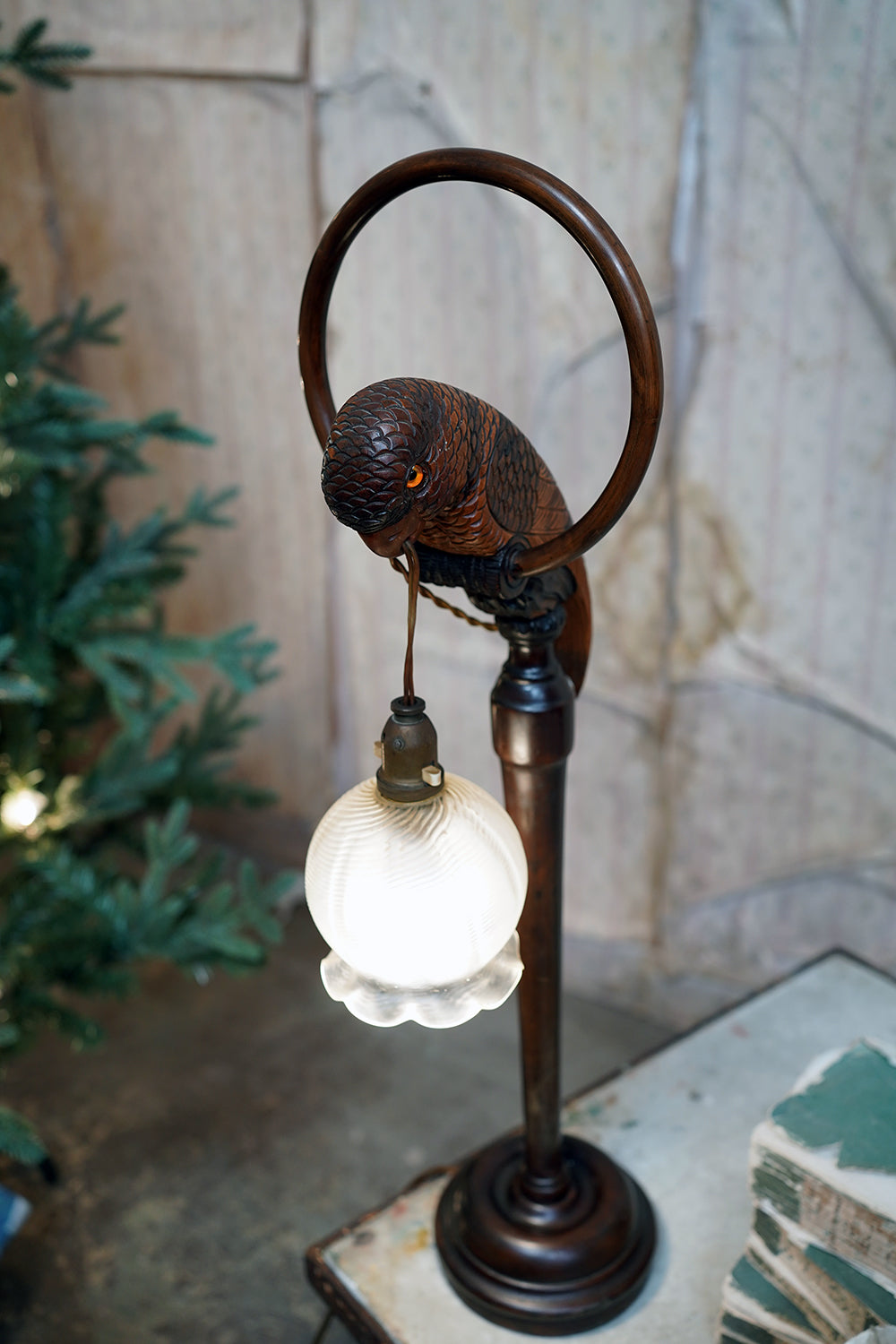 The unusual, and probably unique table lamp, having a naturalistically modelled parrot beautifully hand-carved with overlapping feathers and original polychrome decoration, perched upon a turned wooden hooped pedestal whilst grasping the flex in its beak, surviving with its original scalloped frosted glass shade, the whole surviving from the first quarter of the twentieth century and likely Germany.