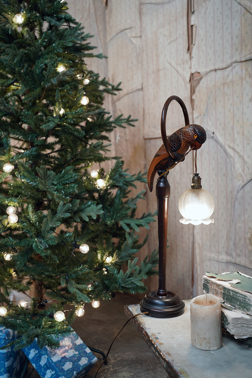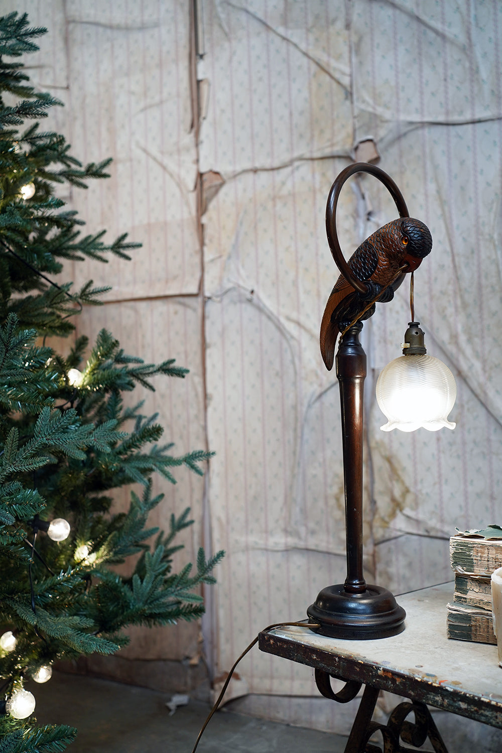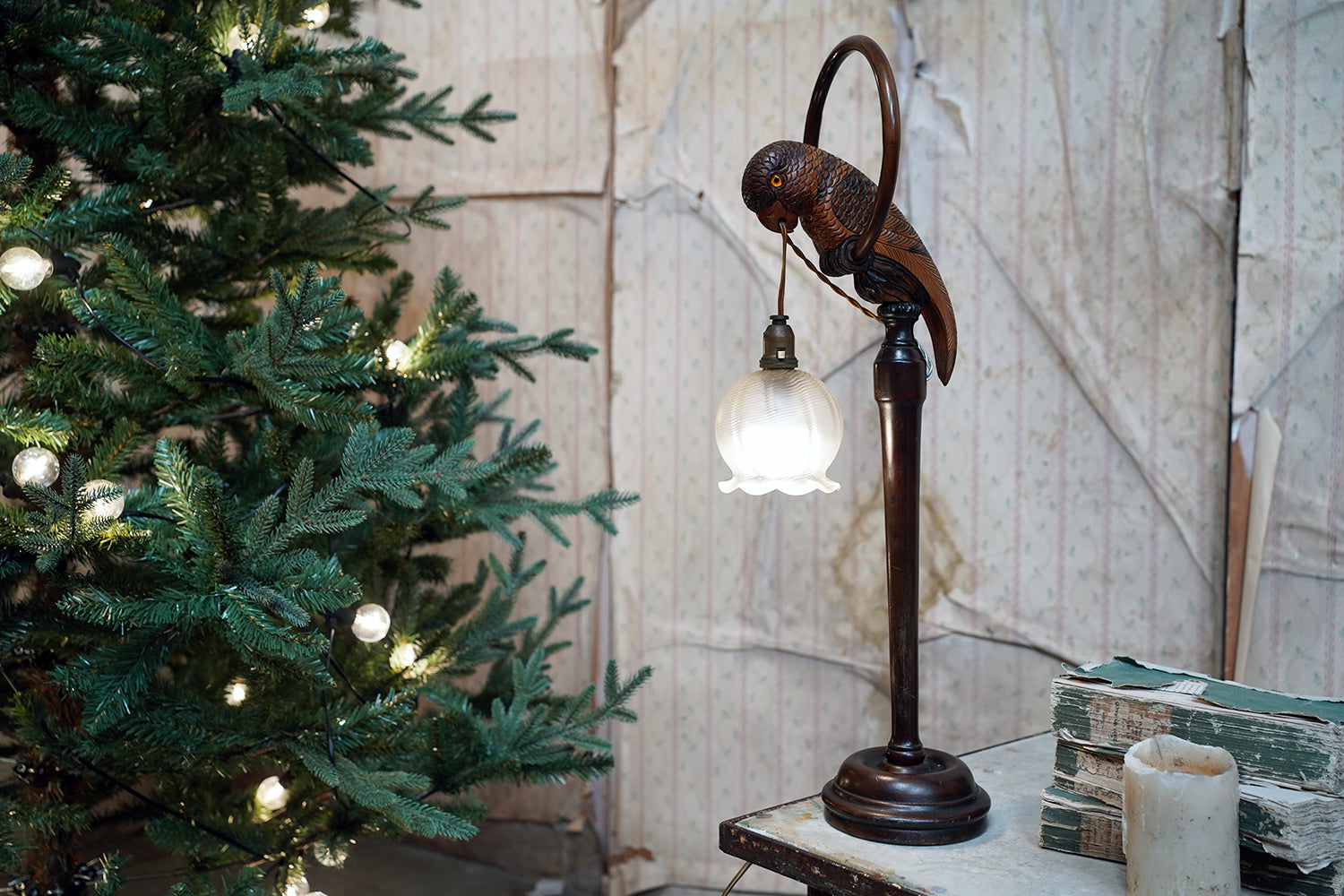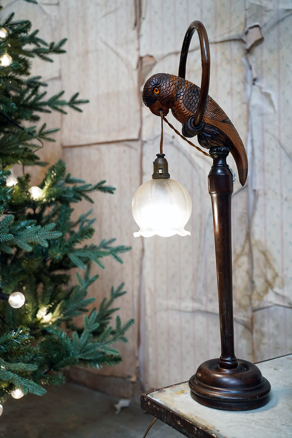The unusual, and probably unique table lamp, having a naturalistically modelled parrot beautifully hand-carved with overlapping feathers and original polychrome decoration, perched upon a turned wooden hooped pedestal whilst grasping the flex in its beak, surviving with its original scalloped frosted glass shade, the whole surviving from the first quarter of the twentieth century and likely Germany.