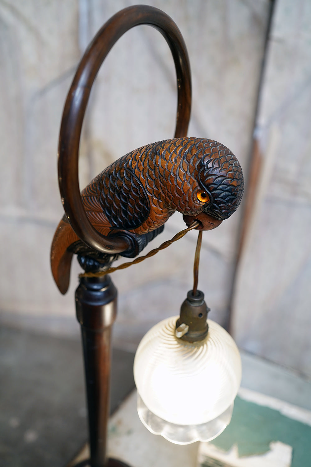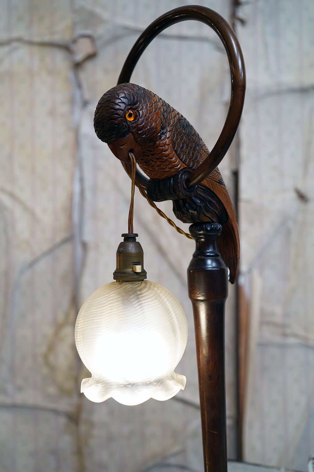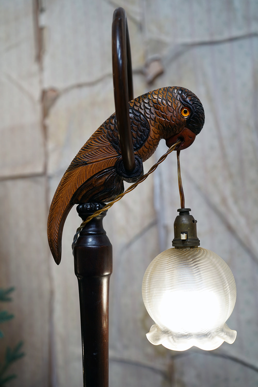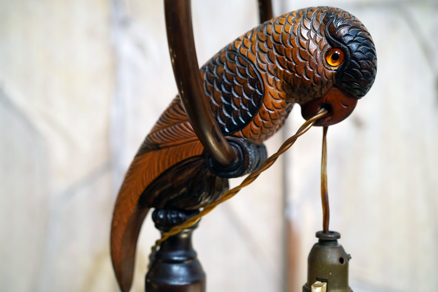 The carving is unusually expressive, the parrot’s plumage rendered with layered scale-like detail and subtle tonal variations from warm ochres to deeper umbered highlights. The lamp retains its original period fittings and wiring route, with the flex intentionally threaded through the beak — a charming piece of whimsy characteristic of early continental novelty lighting but executed here with far greater skill than typically encountered.