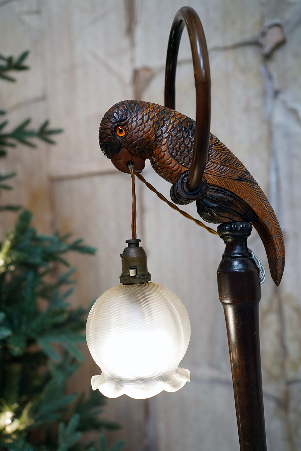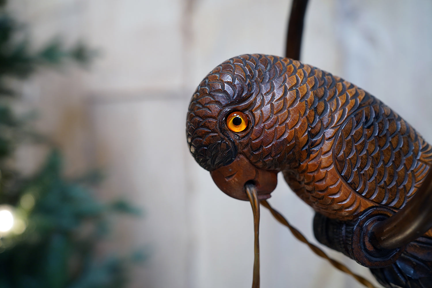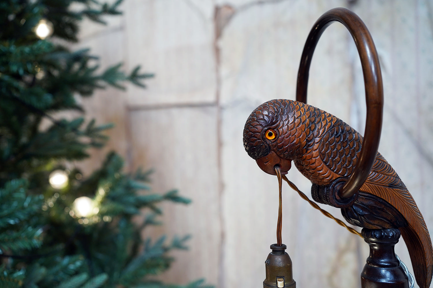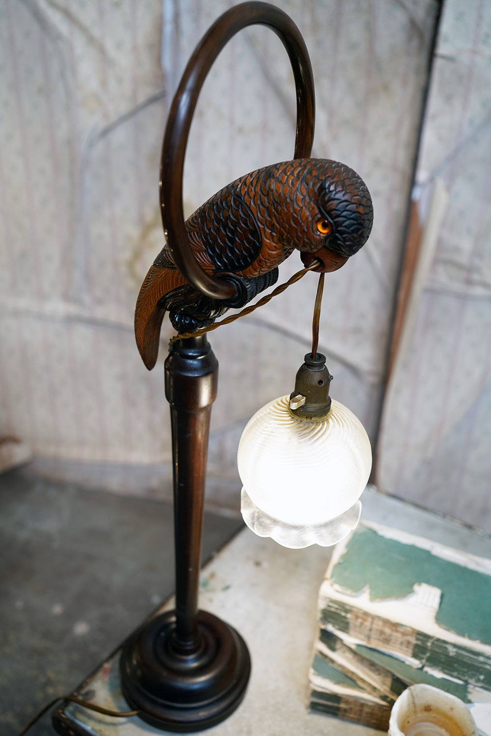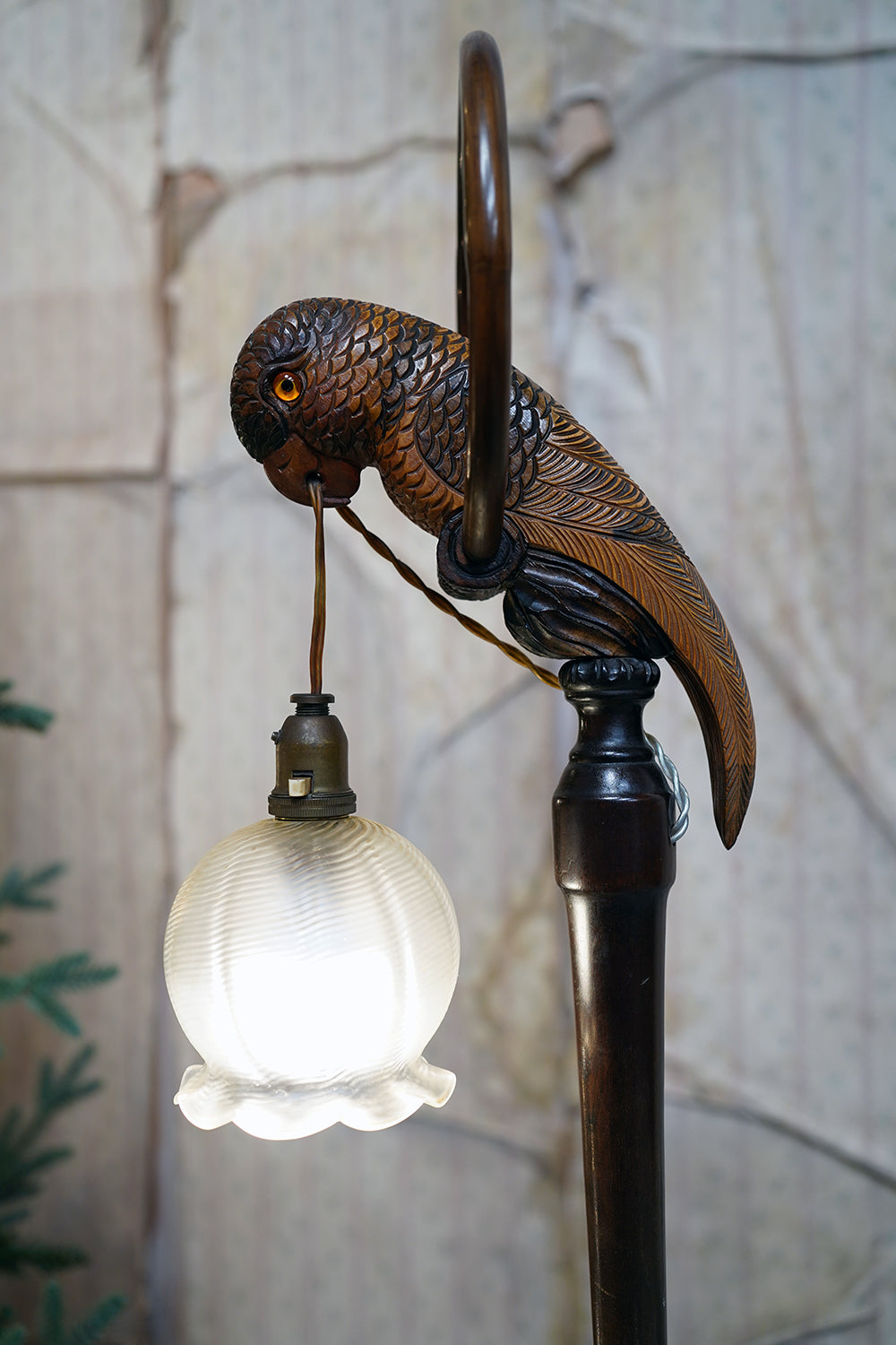 The carving is unusually expressive, the parrot’s plumage rendered with layered scale-like detail and subtle tonal variations from warm ochres to deeper umbered highlights. The lamp retains its original period fittings and wiring route, with the flex intentionally threaded through the beak — a charming piece of whimsy characteristic of early continental novelty lighting but executed here with far greater skill than typically encountered.