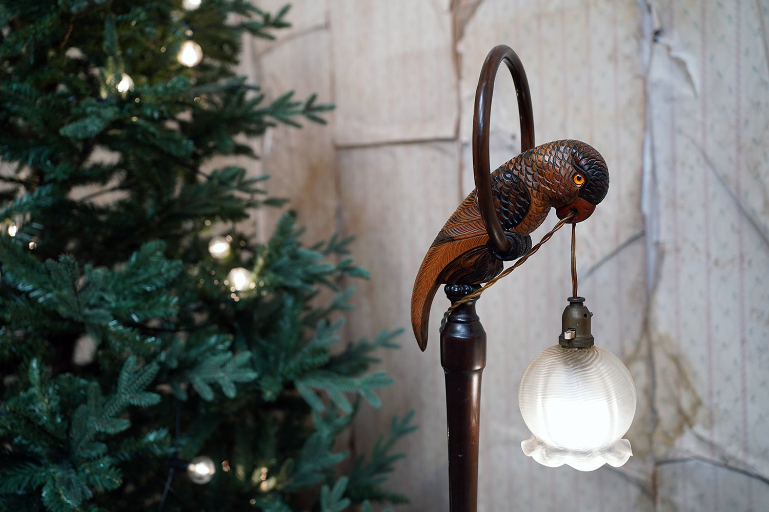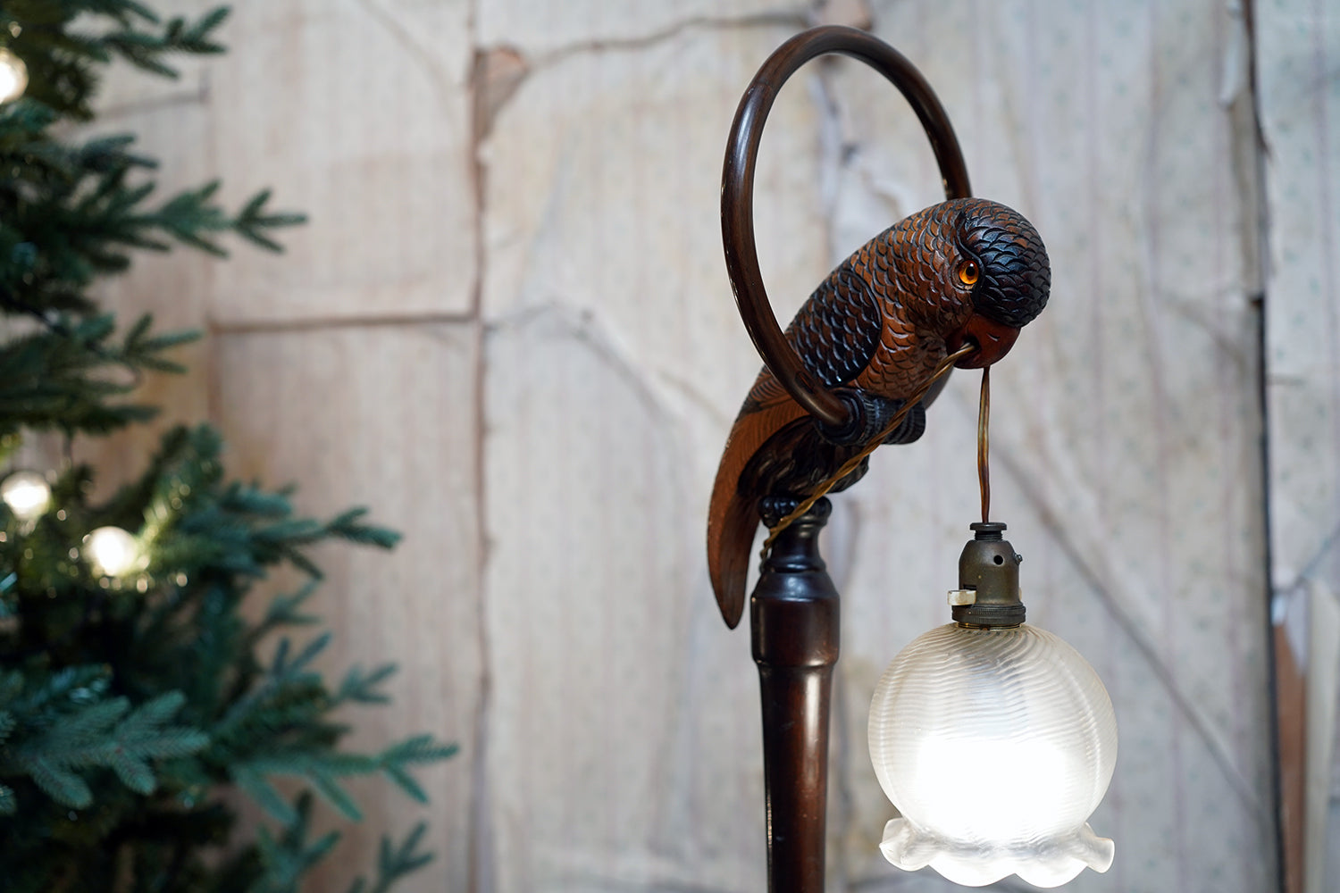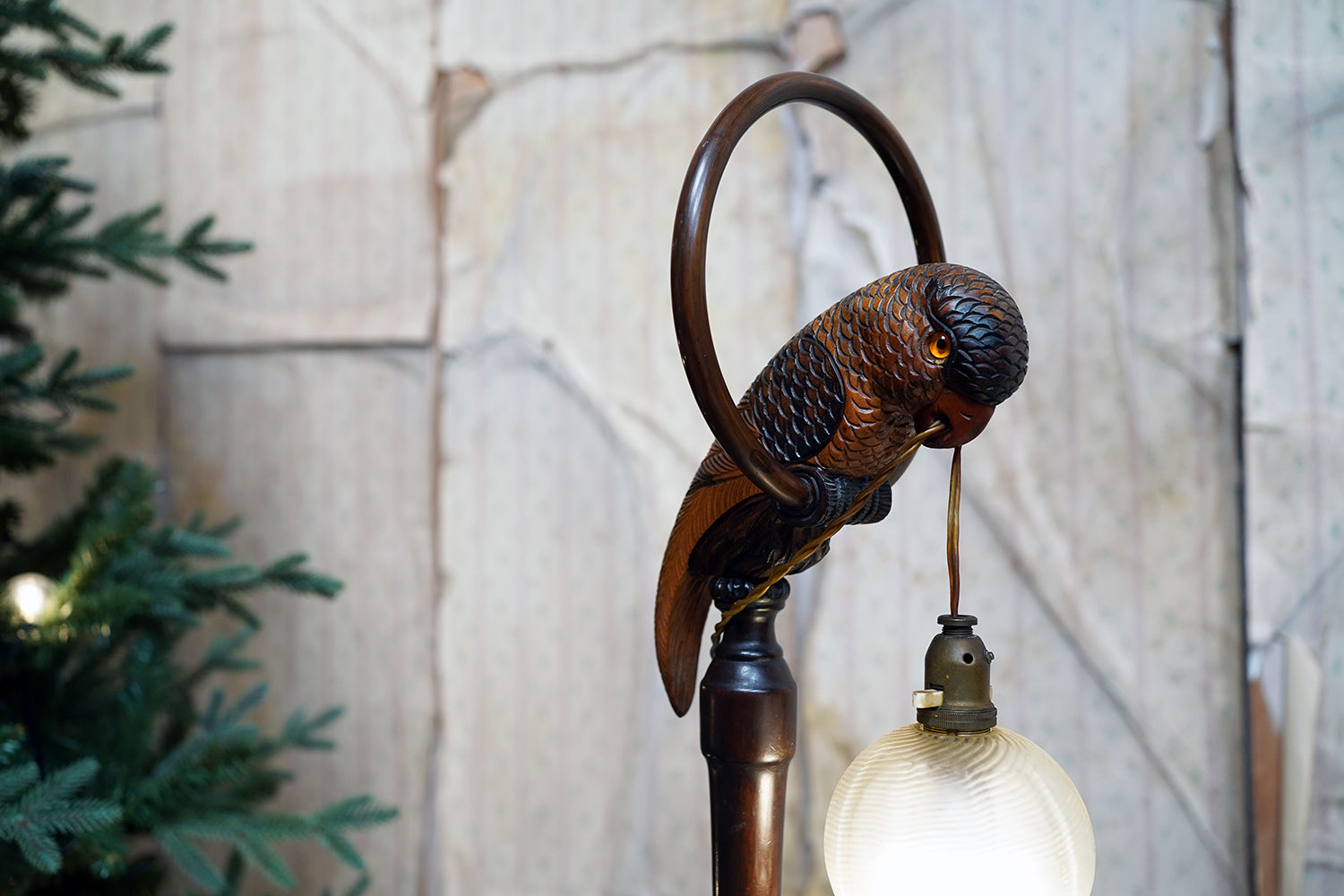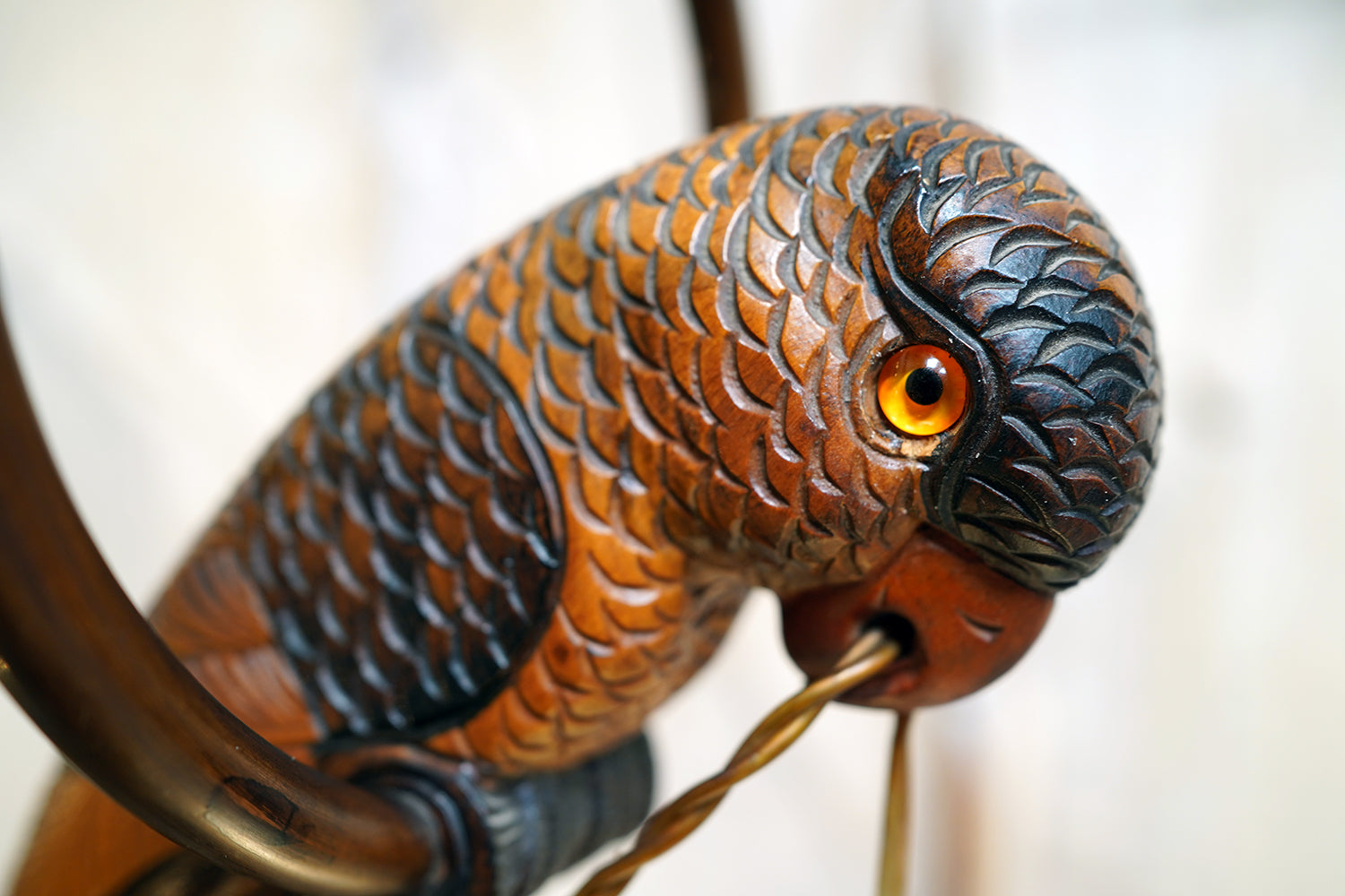 The carving is unusually expressive, the parrot’s plumage rendered with layered scale-like detail and subtle tonal variations from warm ochres to deeper umbered highlights. The lamp retains its original period fittings and wiring route, with the flex intentionally threaded through the beak — a charming piece of whimsy characteristic of early continental novelty lighting but executed here with far greater skill than typically encountered.