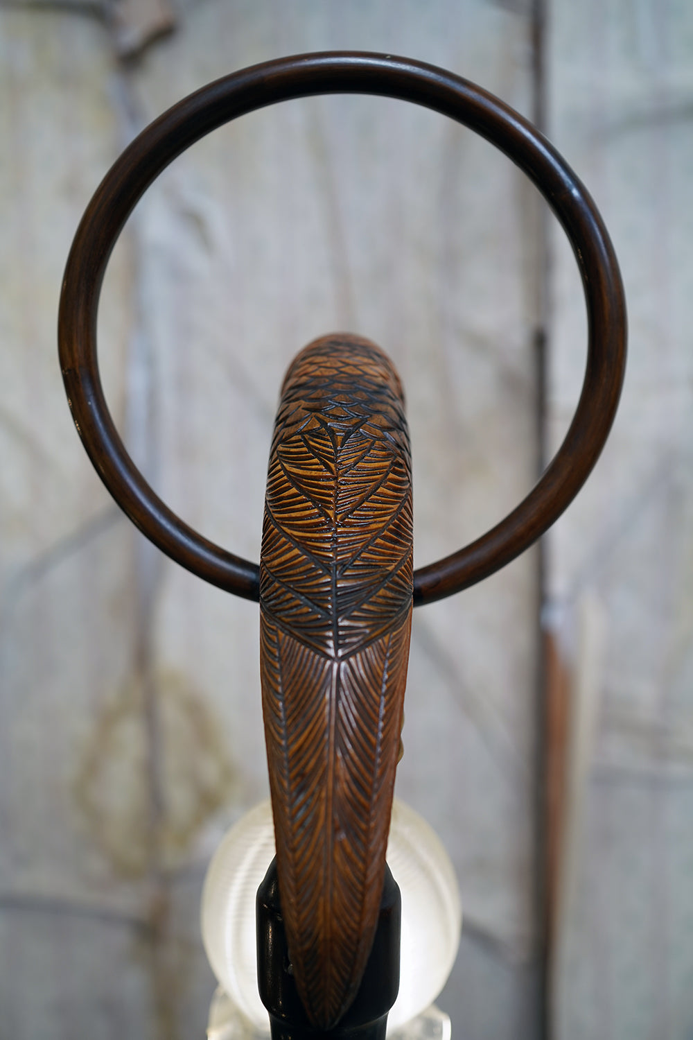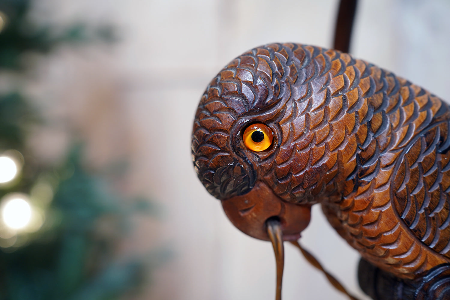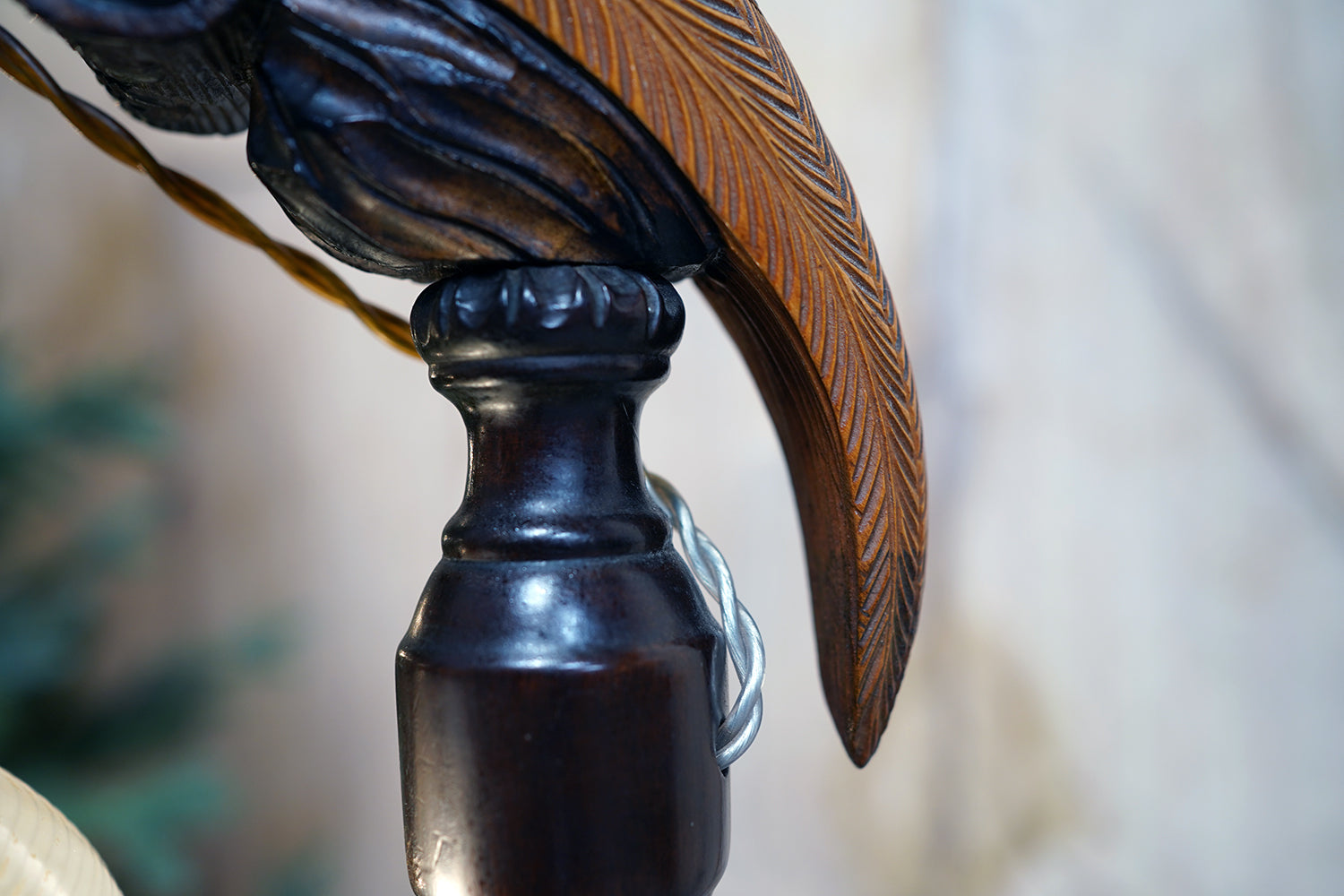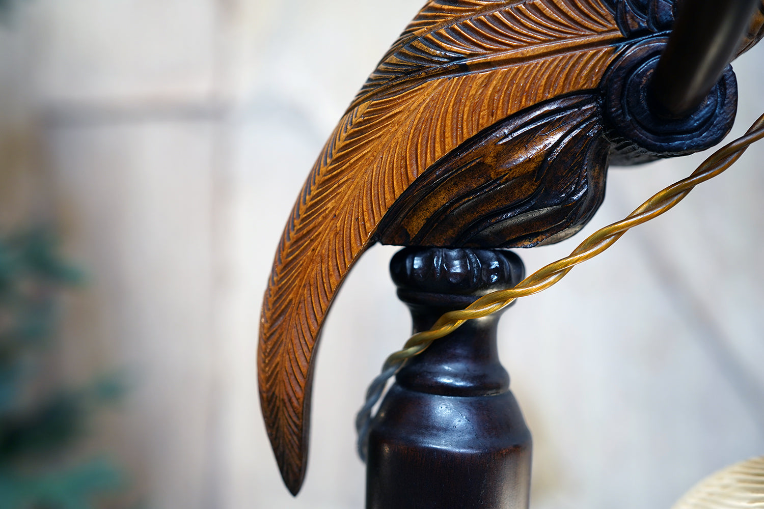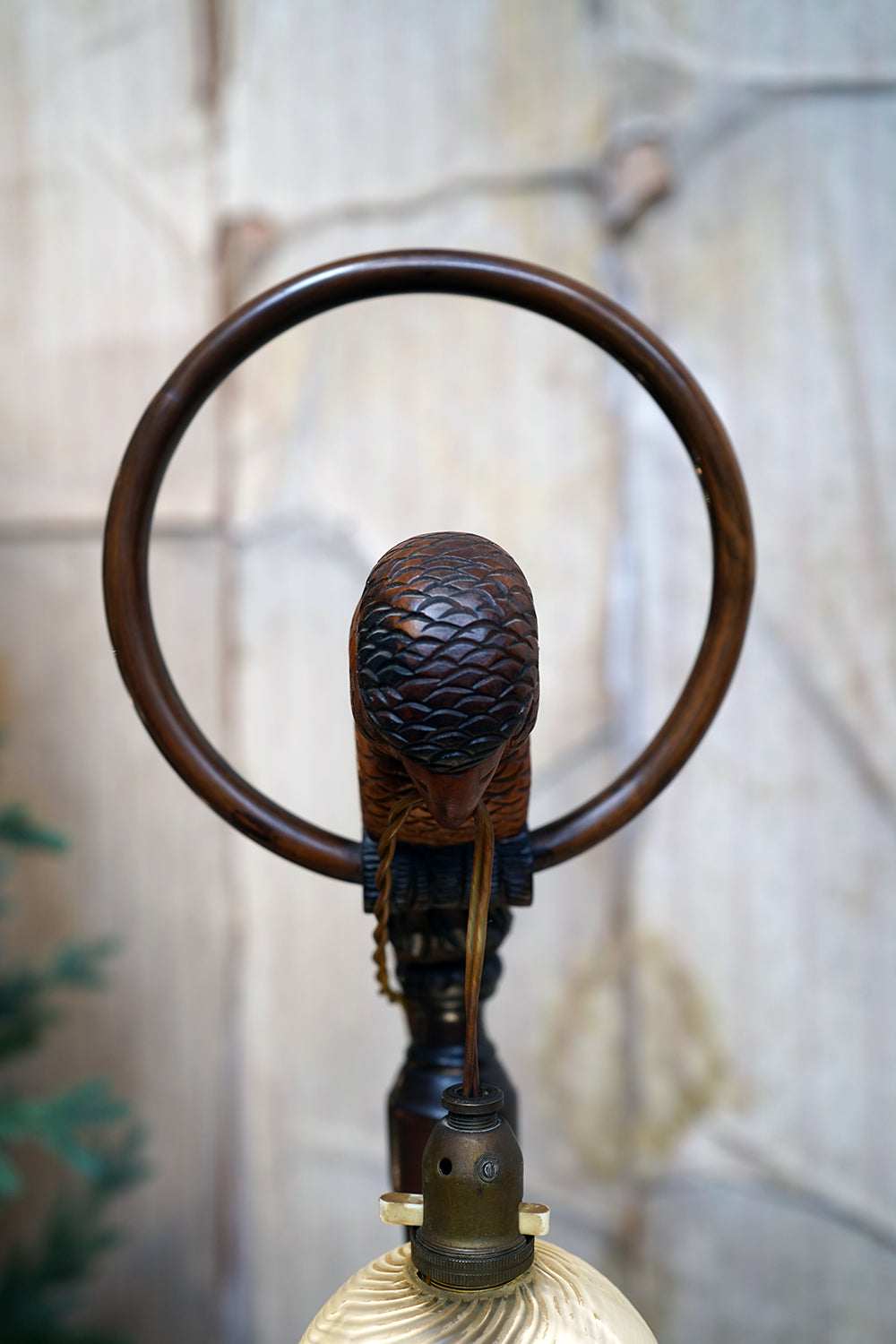 The carving is unusually expressive, the parrot’s plumage rendered with layered scale-like detail and subtle tonal variations from warm ochres to deeper umbered highlights. The lamp retains its original period fittings and wiring route, with the flex intentionally threaded through the beak — a charming piece of whimsy characteristic of early continental novelty lighting but executed here with far greater skill than typically encountered.