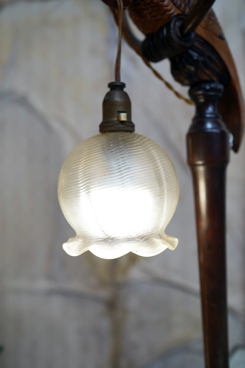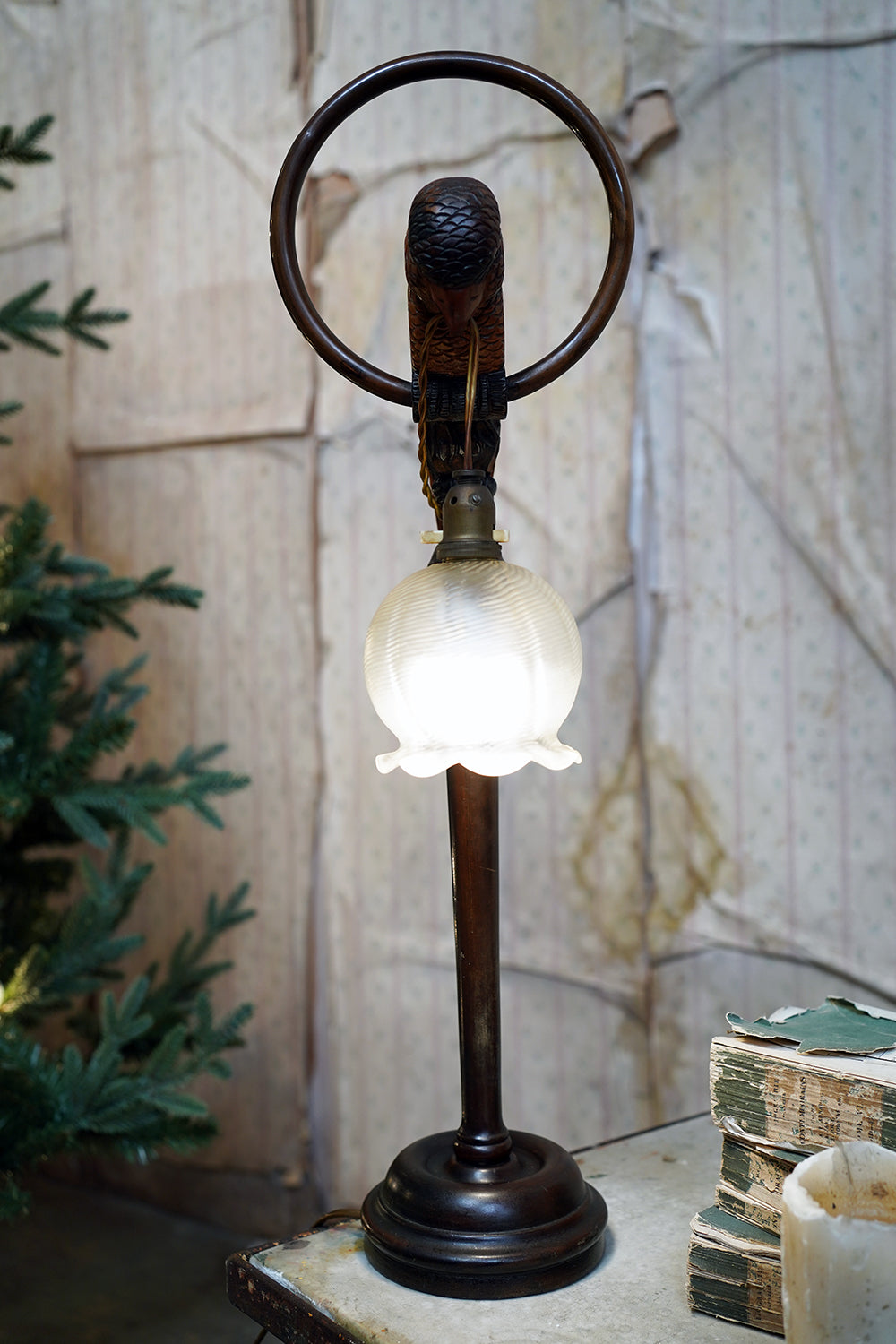 Examples of carved-bird lamps of this scale and sculptural quality scarcely appear, and this model does not correspond to any commercial catalogue lighting of the period, suggesting it may have been a one-off workshop or artisan piece, possibly Black Forest-influenced or made for a specific interior or theatrical setting. The turned column and weighted base, both in dark-stained hardwood, further root the piece in the 1910–1930 period and these dates there was also a strong German and Swiss export market for carved animal lamps, often sold through Paris, London and New York retailers