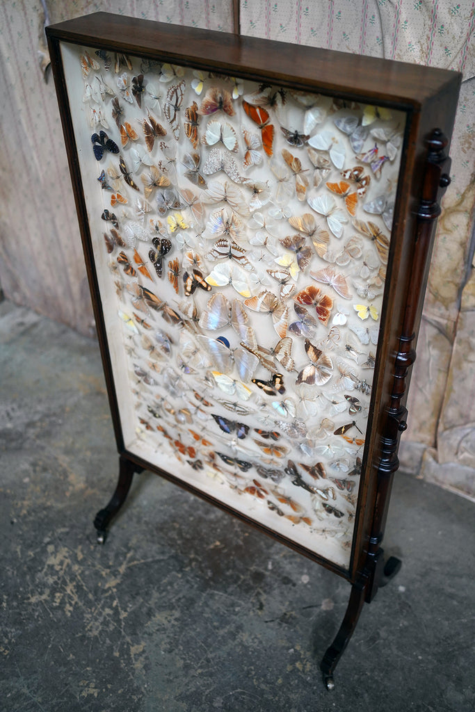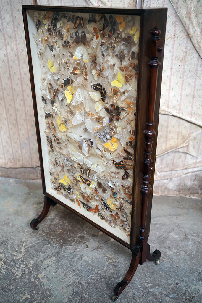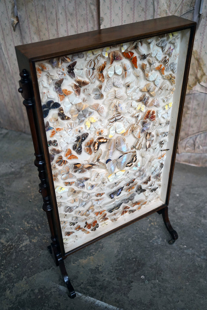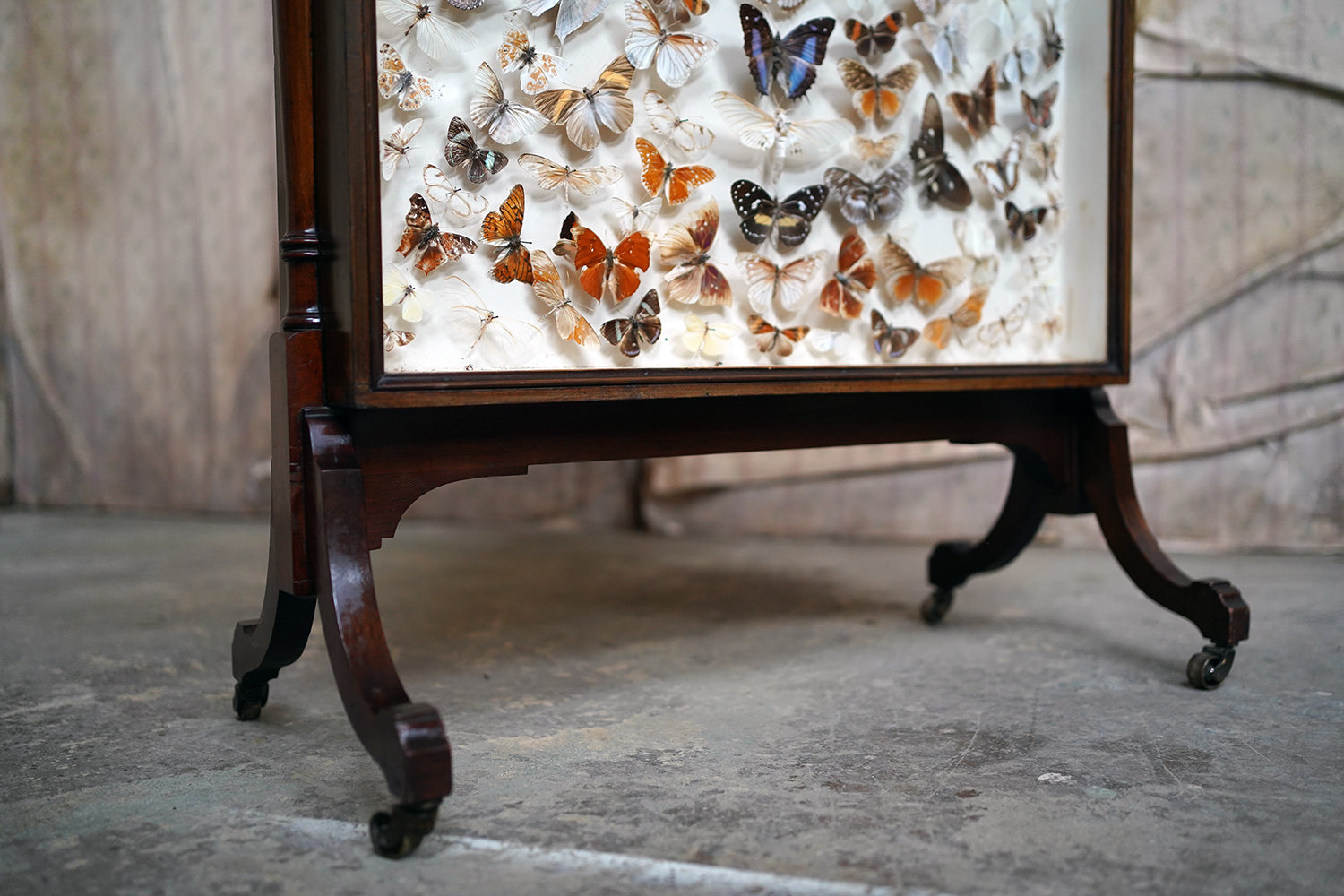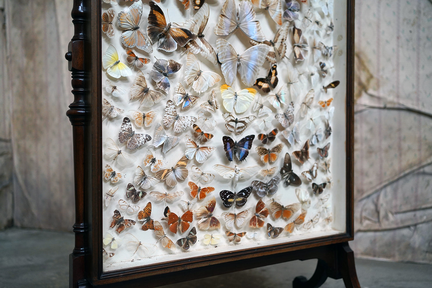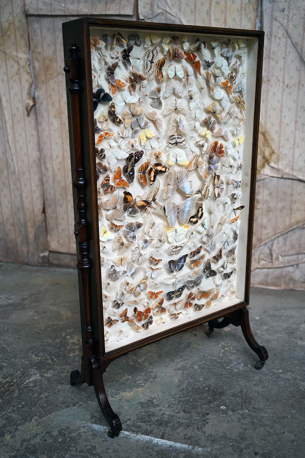 Such decorative screens reflect the late Victorian and Edwardian fascination with natural history, with examples often supplied by specialist dealers such as Henry R. Hope & Co. or Watkins & Doncaster, who prepared butterfly cases for both high-end domestic interiors and museum display. In terms of cabinetmaking style, the turned supports and splayed legs on castors are very much in line with mid–late 19th century English cabinet work, not dissimilar to Gillows-inspired furniture.