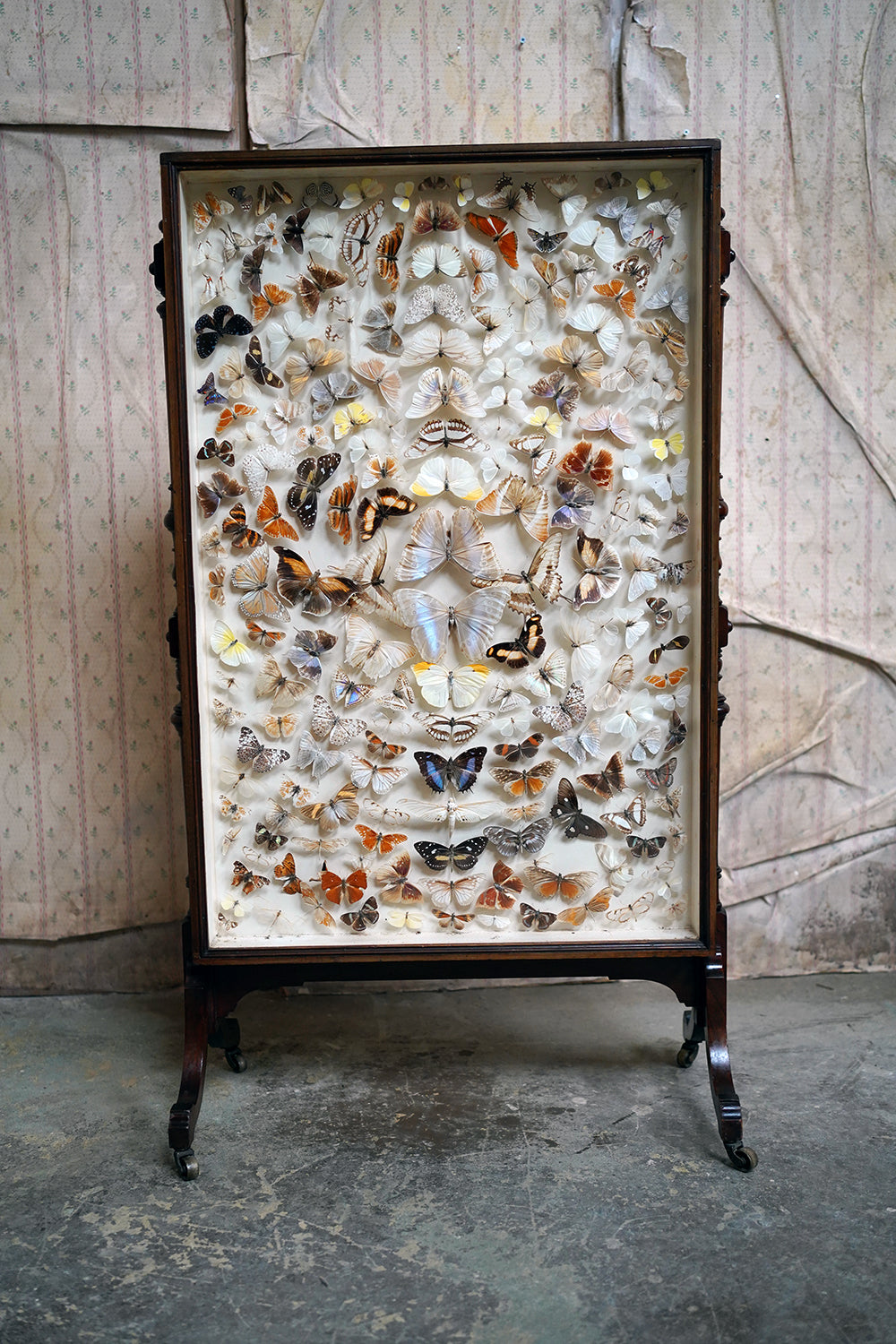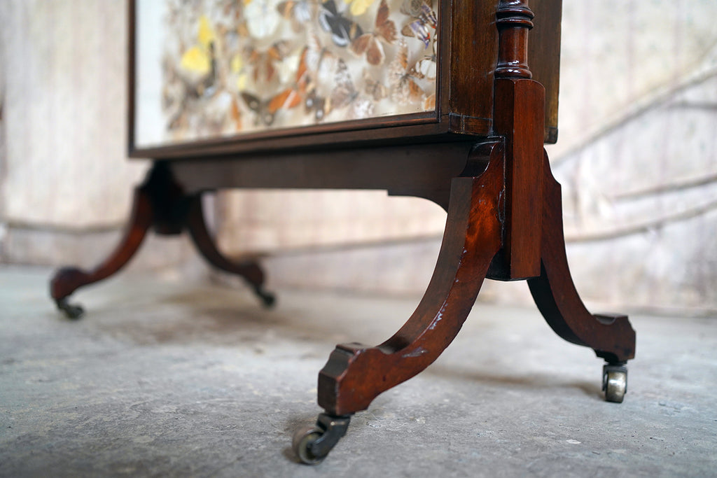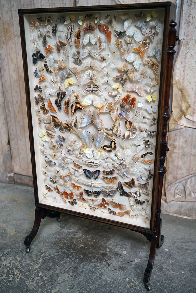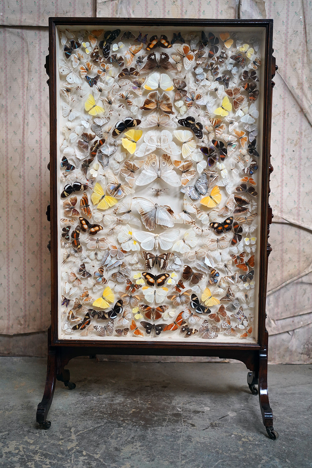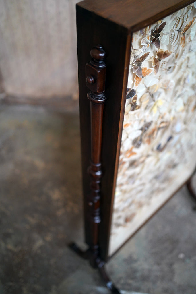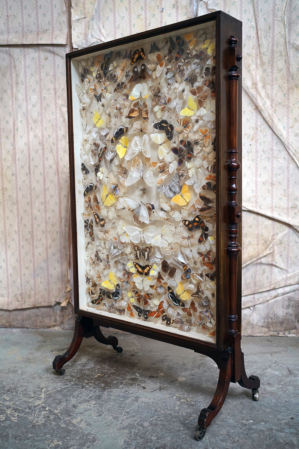 Such decorative screens reflect the late Victorian and Edwardian fascination with natural history, with examples often supplied by specialist dealers such as Henry R. Hope & Co. or Watkins & Doncaster, who prepared butterfly cases for both high-end domestic interiors and museum display. In terms of cabinetmaking style, the turned supports and splayed legs on castors are very much in line with mid–late 19th century English cabinet work, not dissimilar to Gillows-inspired furniture.