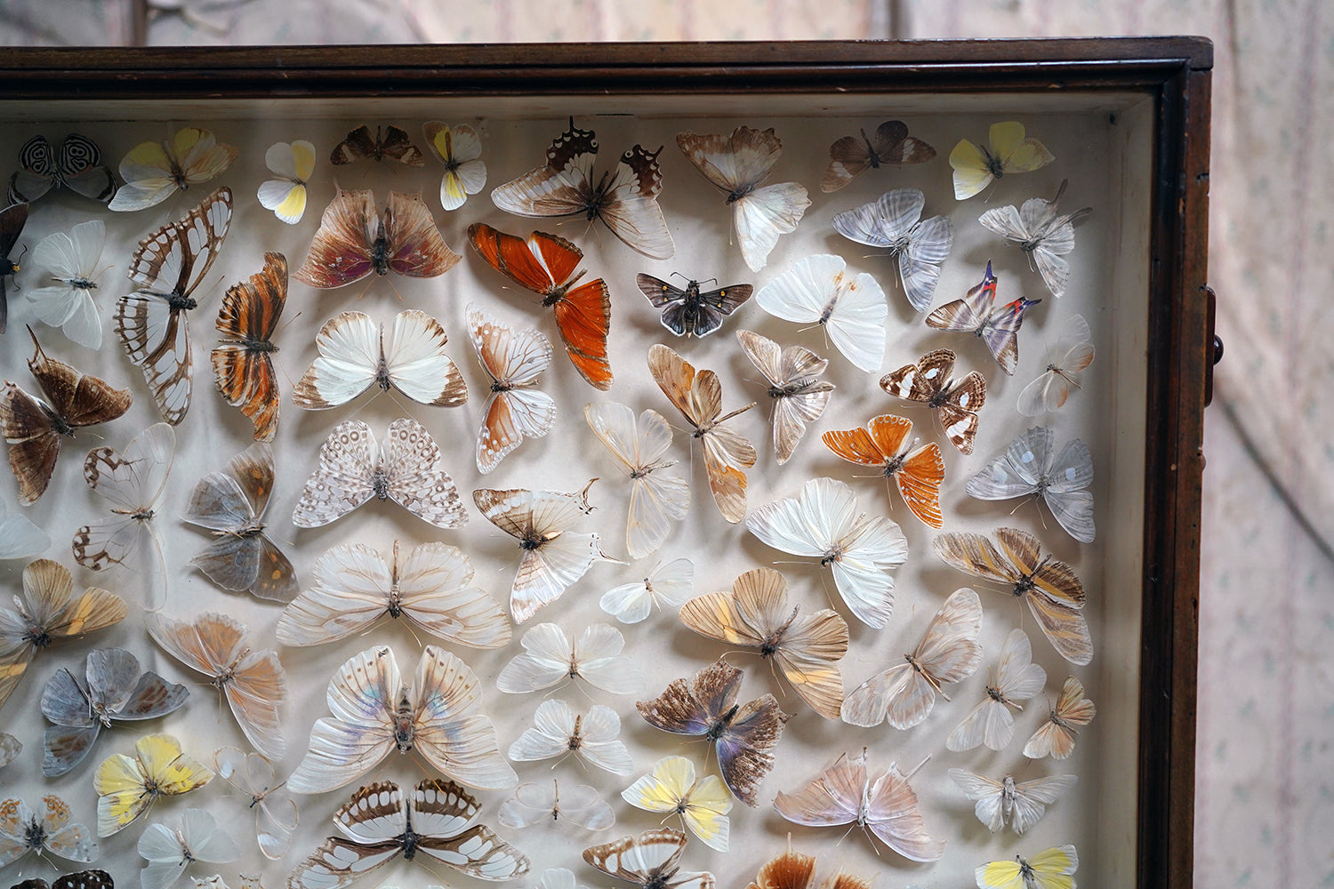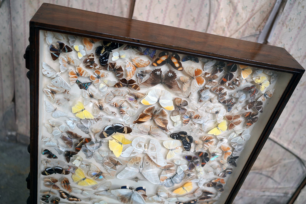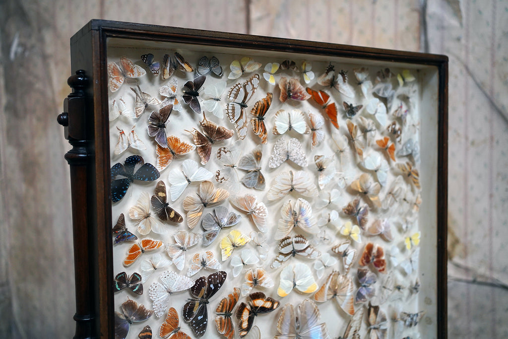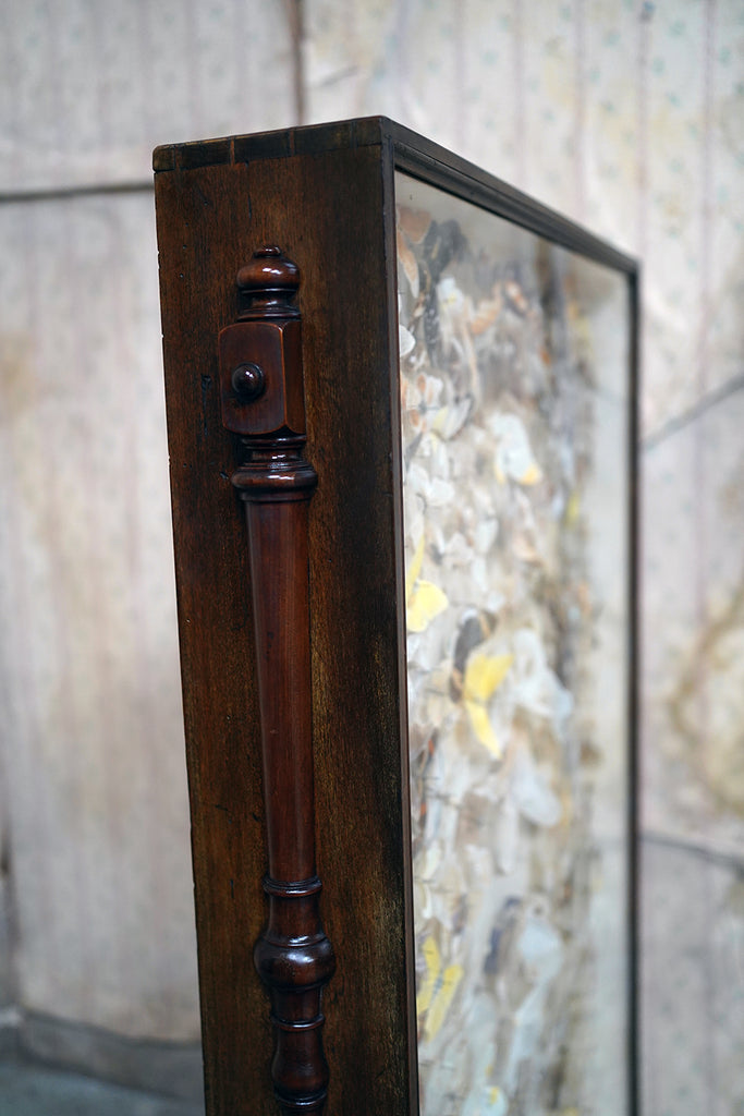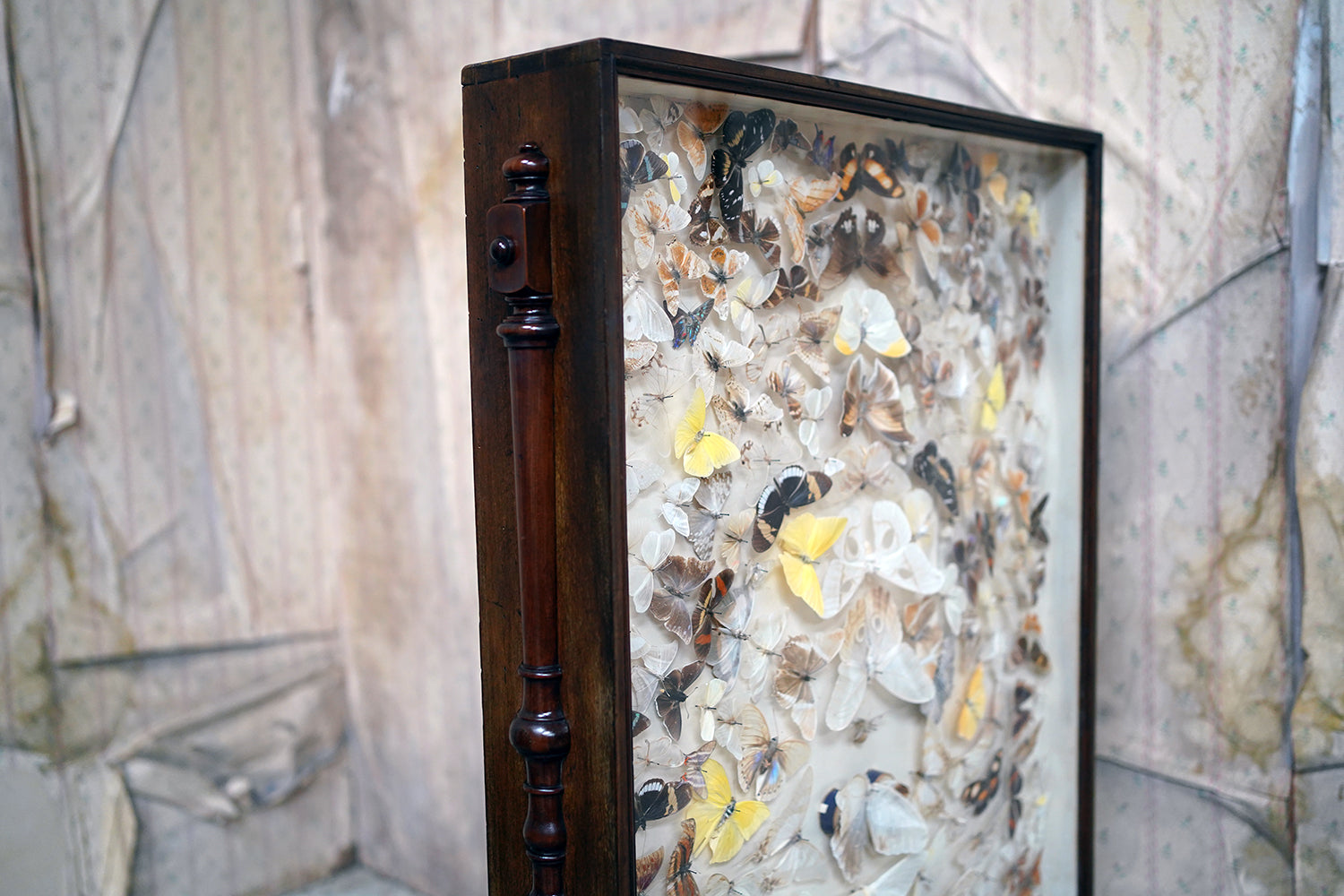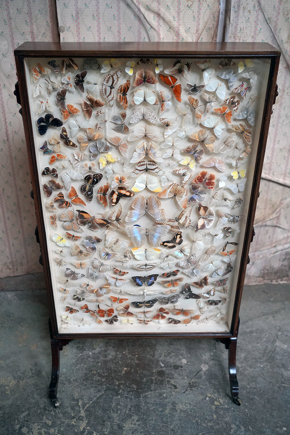 Such decorative screens reflect the late Victorian and Edwardian fascination with natural history, with examples often supplied by specialist dealers such as Henry R. Hope & Co. or Watkins & Doncaster, who prepared butterfly cases for both high-end domestic interiors and museum display. In terms of cabinetmaking style, the turned supports and splayed legs on castors are very much in line with mid–late 19th century English cabinet work, not dissimilar to Gillows-inspired furniture.