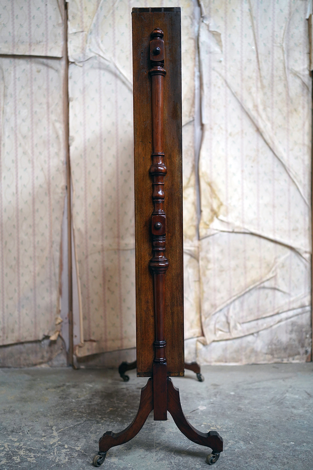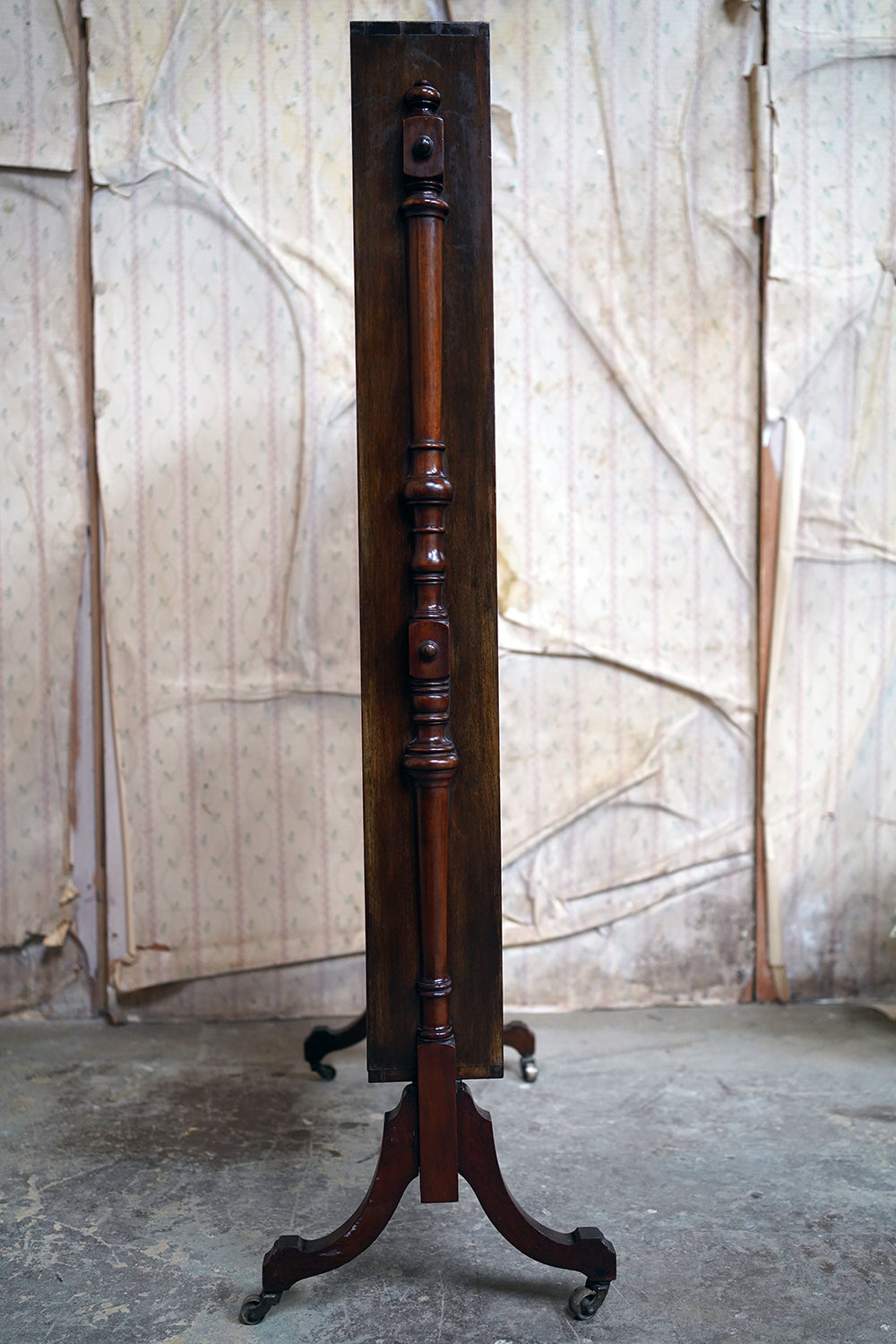 The exquisite quality rectangular double-sided cheval fire screen or room divider, inset with symmetrical arrangements of exotic butterflies and moths, totalling over five hundred specimens, the collection being glazed to a minimalist museum ivory buff ground within a dovetailed solid mahogany frame with balustrade mouldings, raised on turned supports and splayed legs with brass castors in the manner of Gillows, the whole surviving from the Pitt Rivers Museum collection and the zeniths of the nineteenth century.