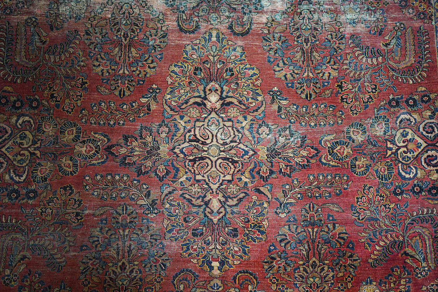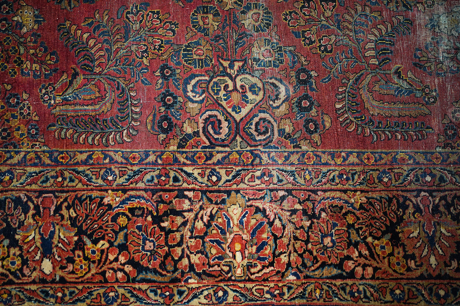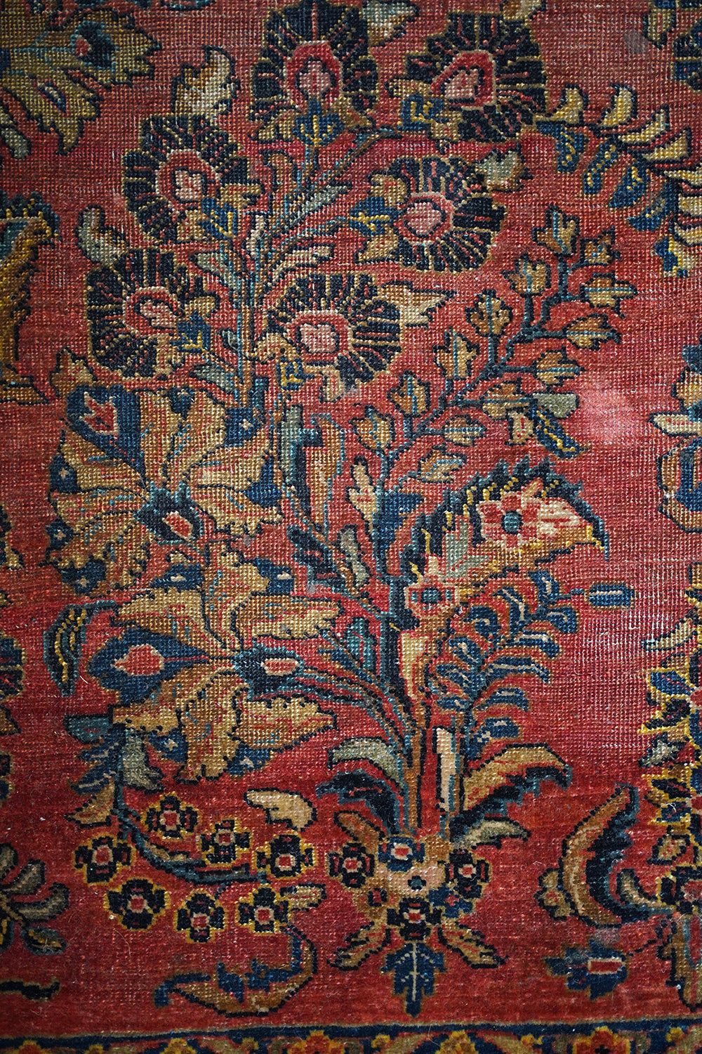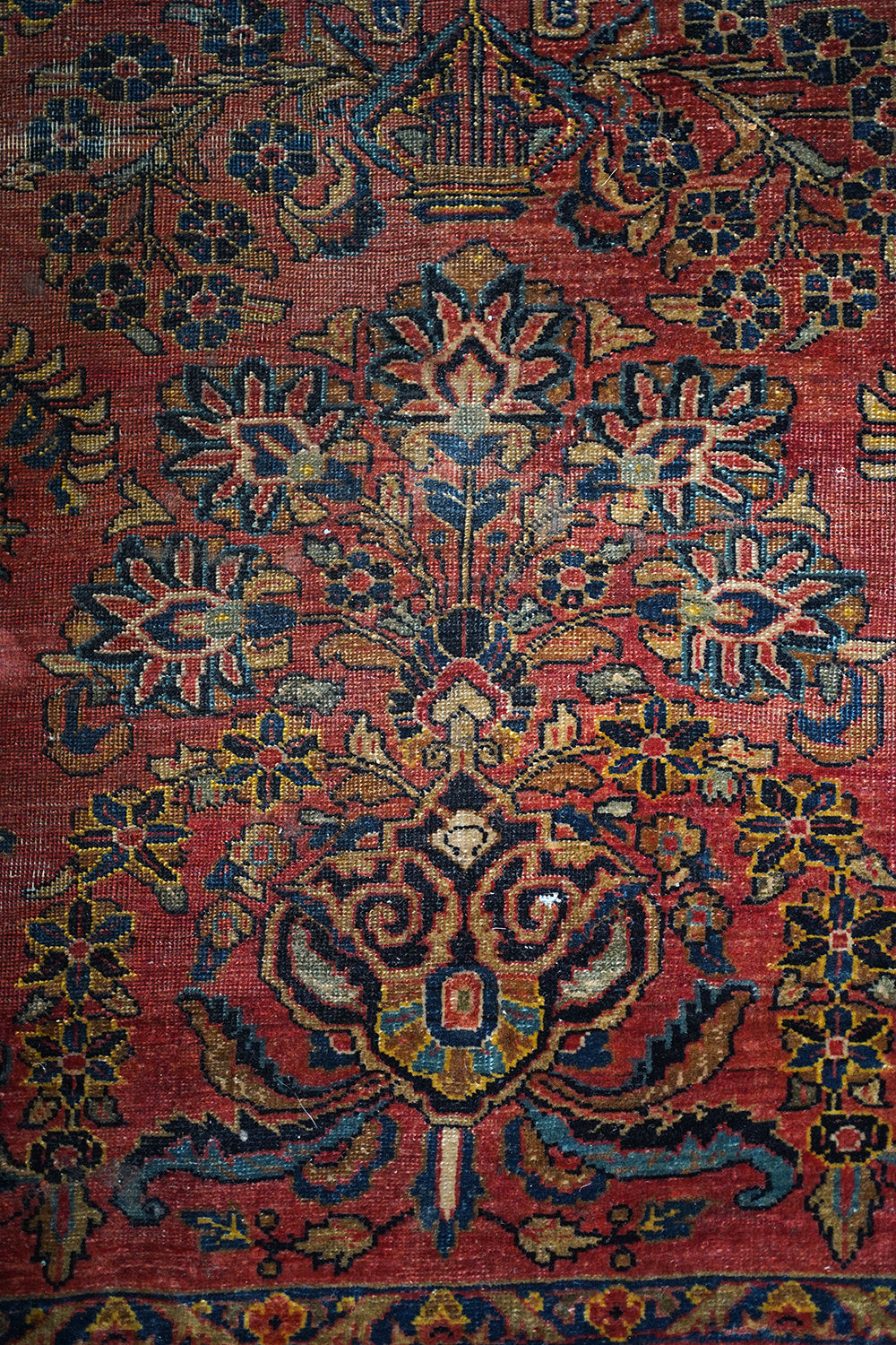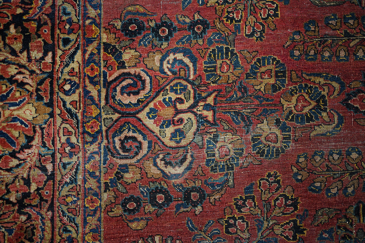 Sarouk (sometimes spelt Saroukh) is a city west of Kashan. They are fine, bold rugs with hard backs; and it’s not unusual to find them with breaks and tears because of this hardness. The colours are usually strong, contrasts great. They are made with a Sehna knot and are usually very fine. The Sarouk and Kashan may be distinguished from all others by their short velvety nap; dark rich colours; fields of graceful, foliated stalks and floral forms resting on concentric medallions; and the fine, firm texture of the weave.