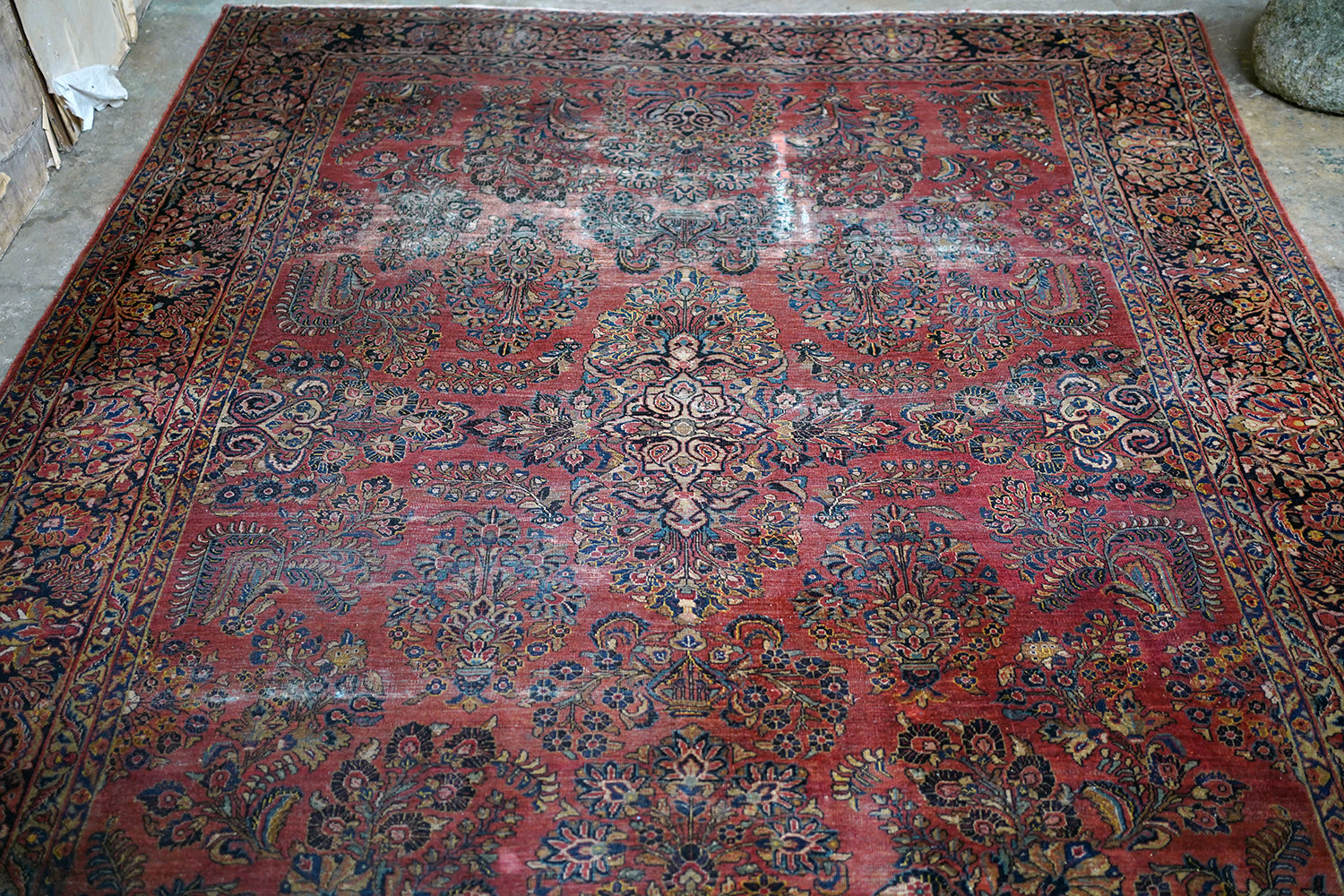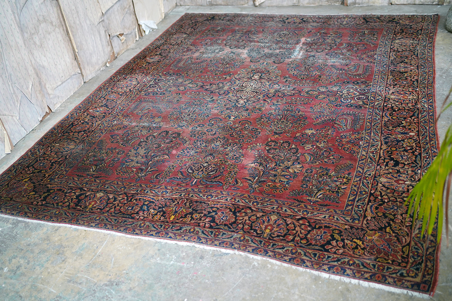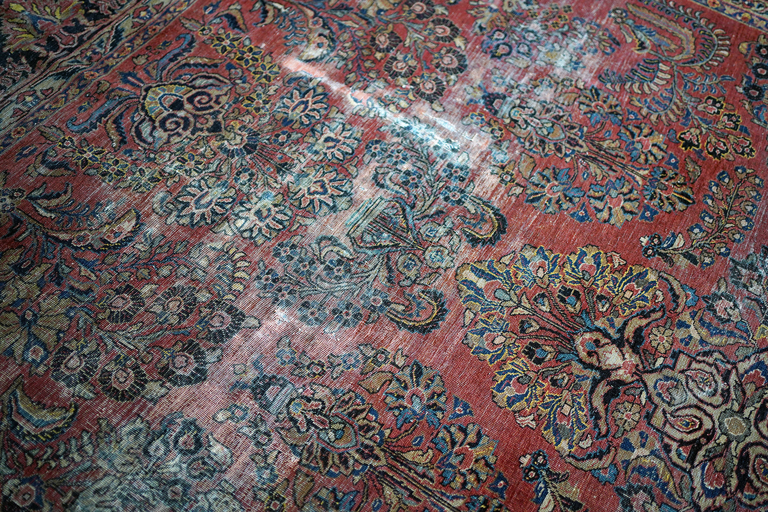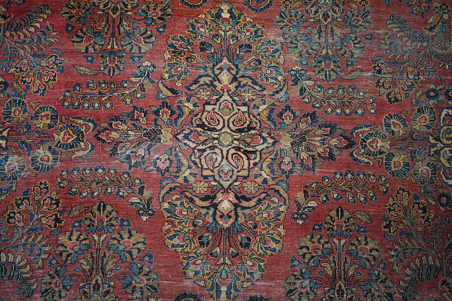 Sarouk (sometimes spelt Saroukh) is a city west of Kashan. They are fine, bold rugs with hard backs; and it’s not unusual to find them with breaks and tears because of this hardness. The colours are usually strong, contrasts great. They are made with a Sehna knot and are usually very fine. The Sarouk and Kashan may be distinguished from all others by their short velvety nap; dark rich colours; fields of graceful, foliated stalks and floral forms resting on concentric medallions; and the fine, firm texture of the weave.