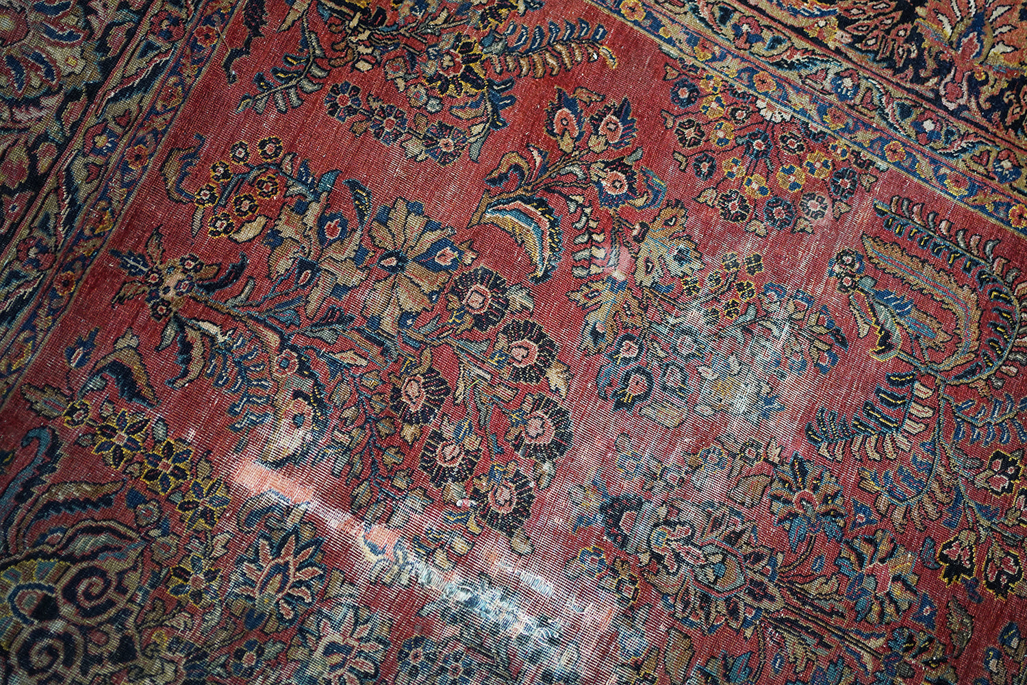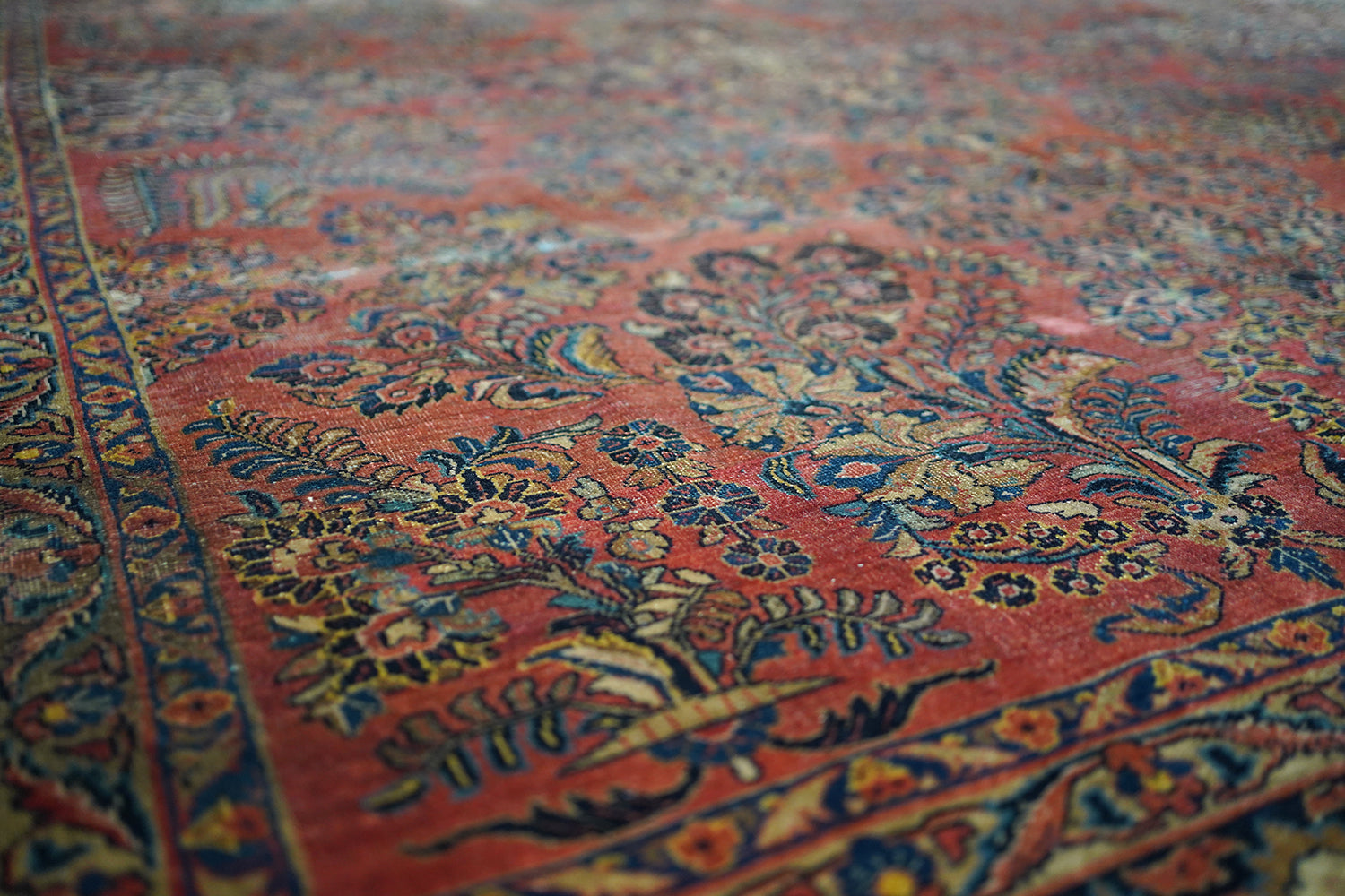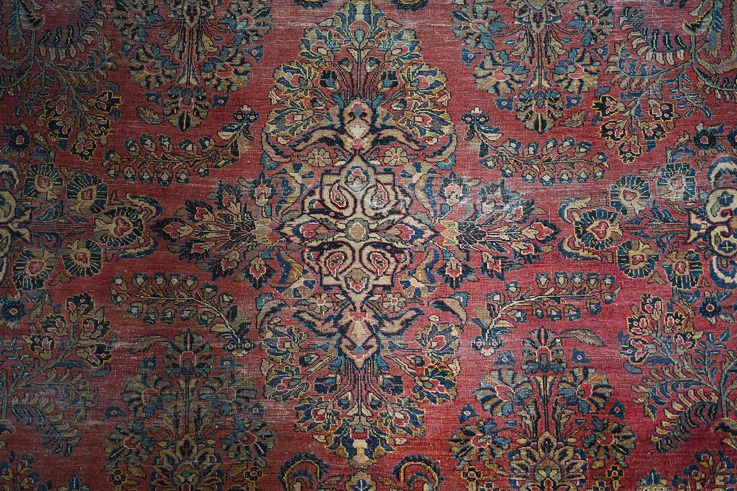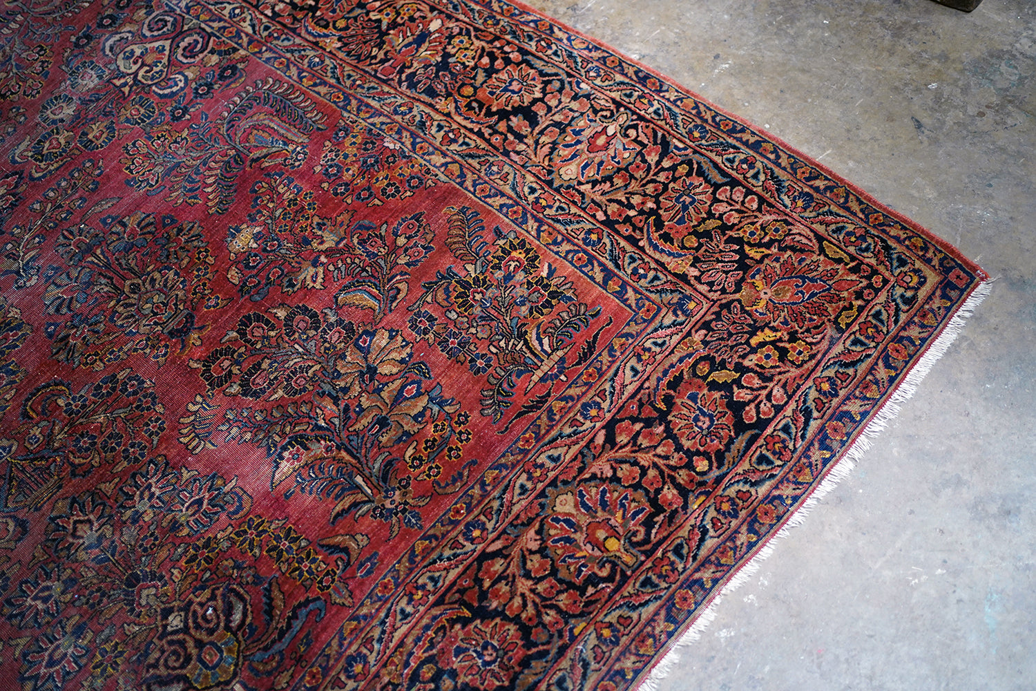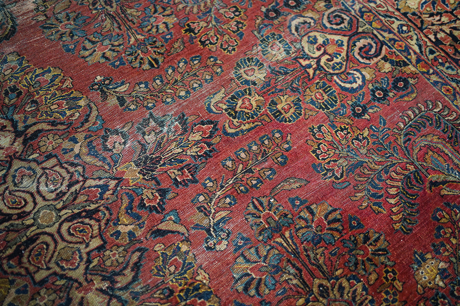 Sarouk (sometimes spelt Saroukh) is a city west of Kashan. They are fine, bold rugs with hard backs; and it’s not unusual to find them with breaks and tears because of this hardness. The colours are usually strong, contrasts great. They are made with a Sehna knot and are usually very fine. The Sarouk and Kashan may be distinguished from all others by their short velvety nap; dark rich colours; fields of graceful, foliated stalks and floral forms resting on concentric medallions; and the fine, firm texture of the weave.