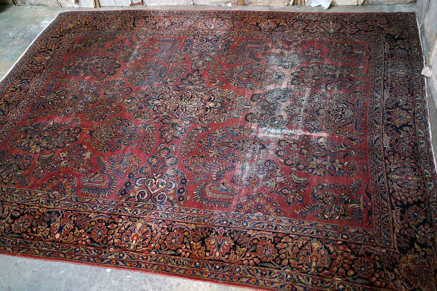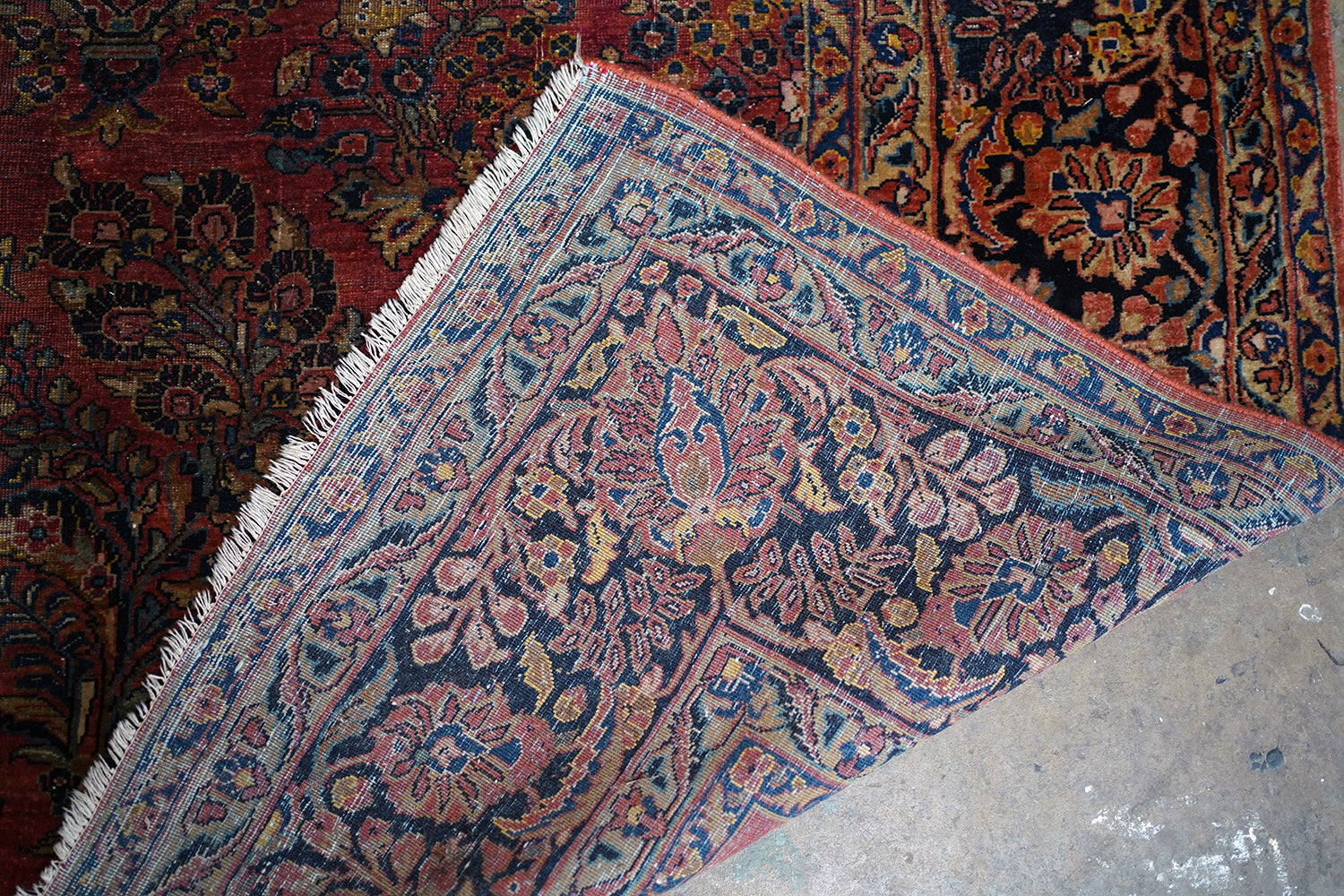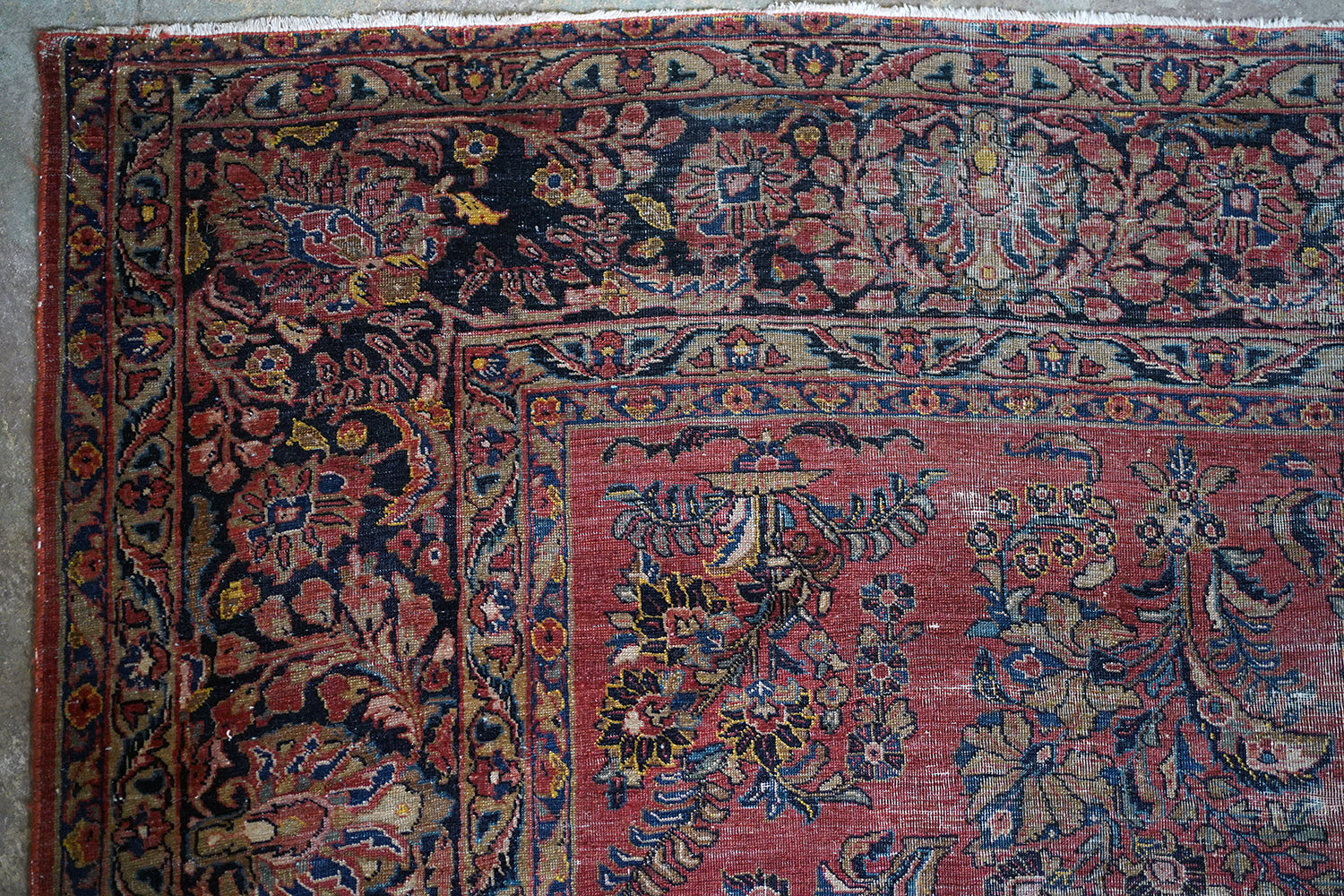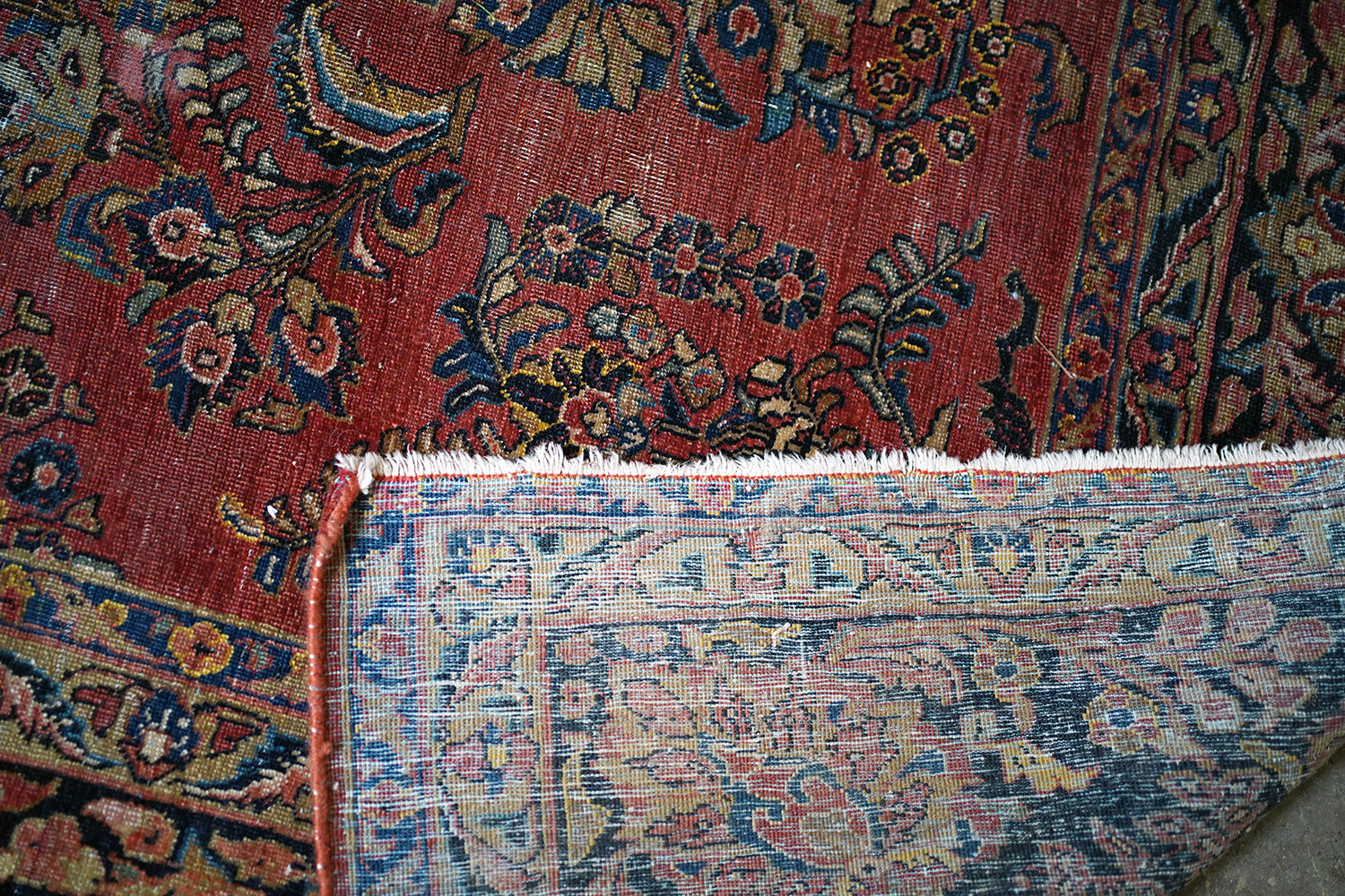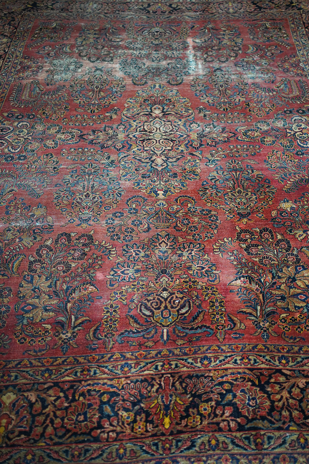 Sarouk (sometimes spelt Saroukh) is a city west of Kashan. They are fine, bold rugs with hard backs; and it’s not unusual to find them with breaks and tears because of this hardness. The colours are usually strong, contrasts great. They are made with a Sehna knot and are usually very fine. The Sarouk and Kashan may be distinguished from all others by their short velvety nap; dark rich colours; fields of graceful, foliated stalks and floral forms resting on concentric medallions; and the fine, firm texture of the weave.
