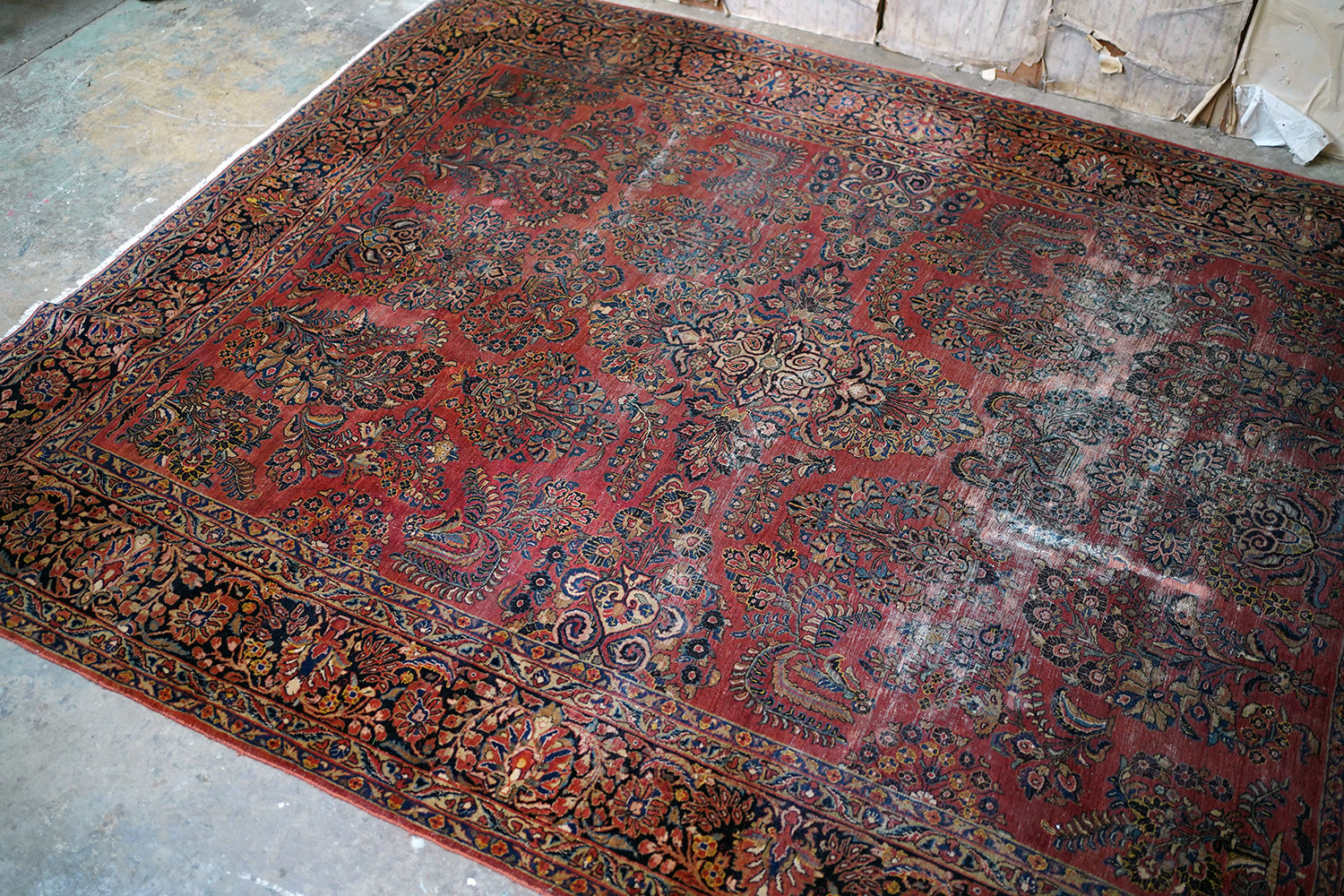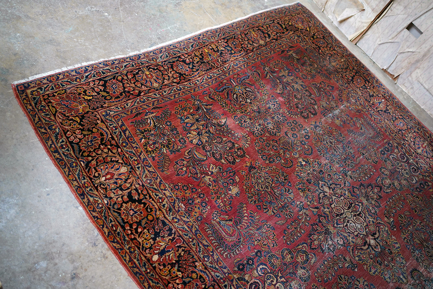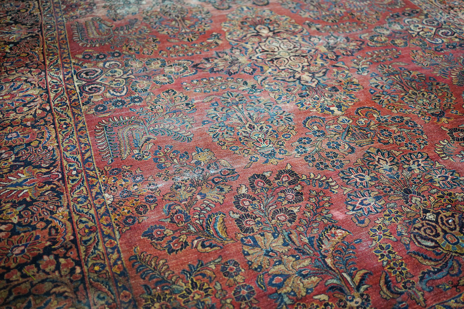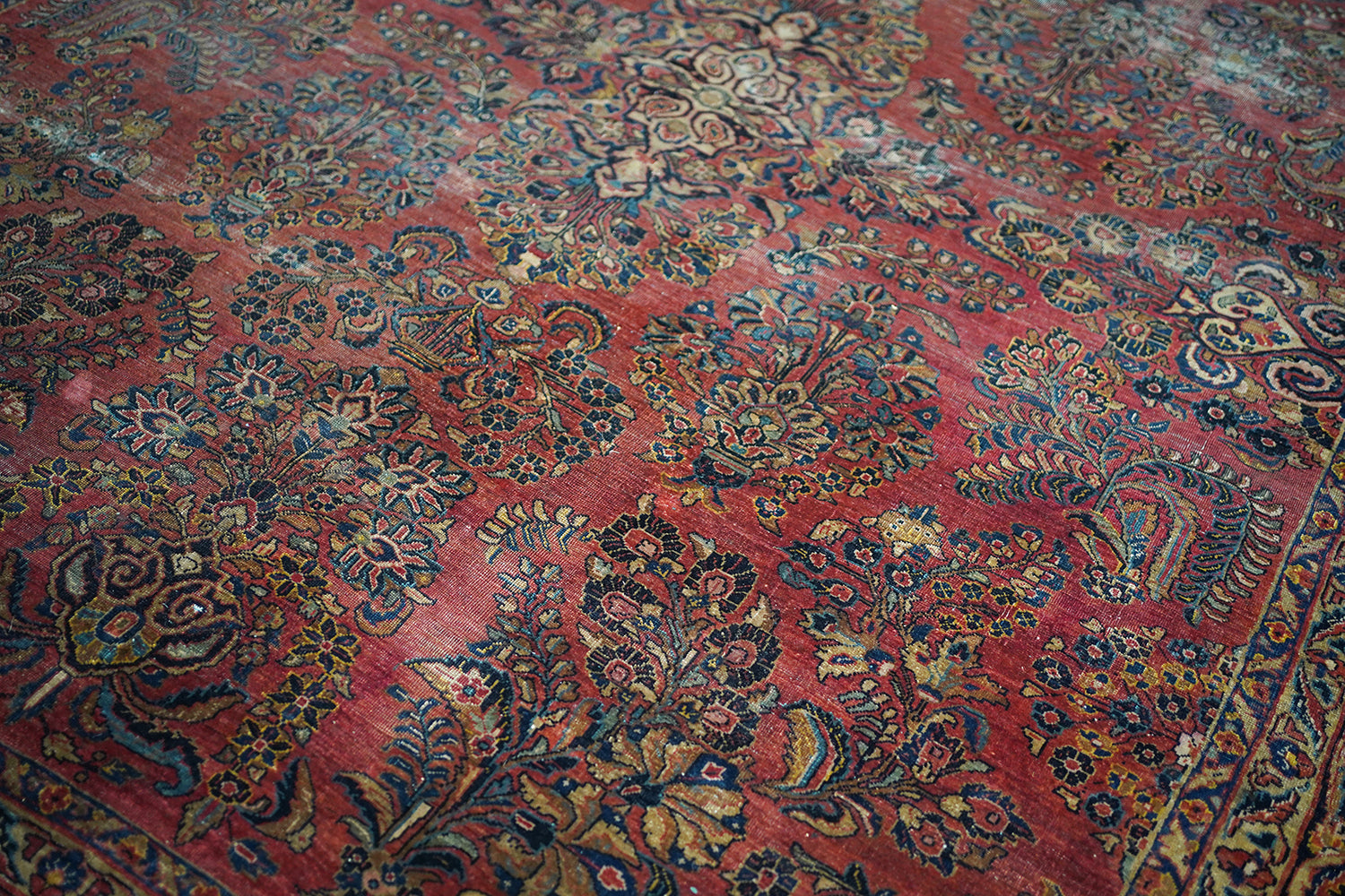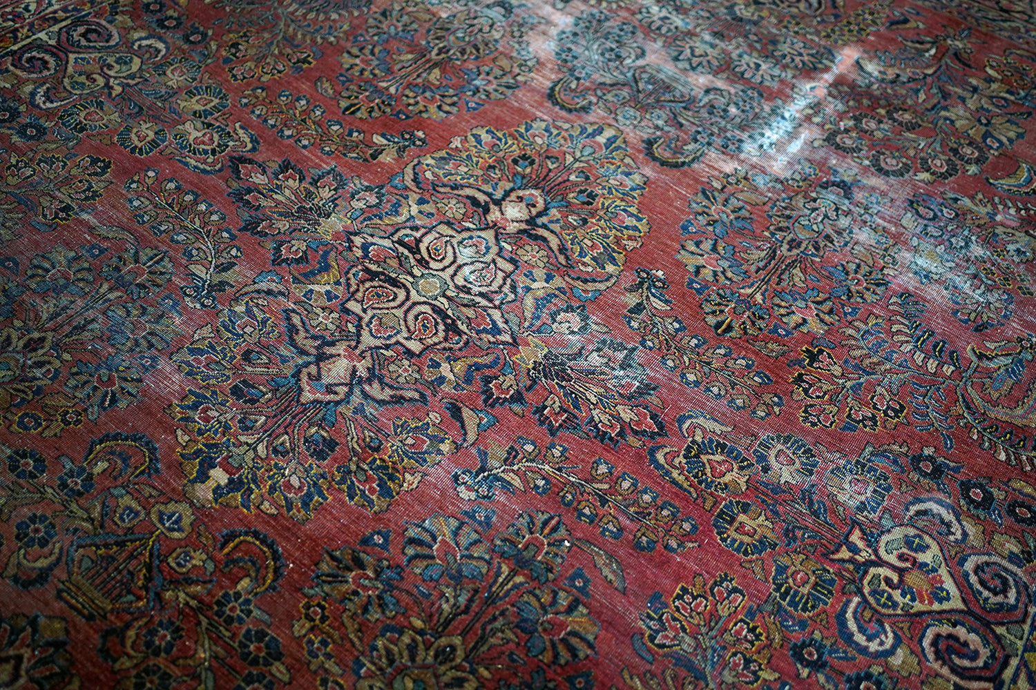 Sarouk (sometimes spelt Saroukh) is a city west of Kashan. They are fine, bold rugs with hard backs; and it’s not unusual to find them with breaks and tears because of this hardness. The colours are usually strong, contrasts great. They are made with a Sehna knot and are usually very fine. The Sarouk and Kashan may be distinguished from all others by their short velvety nap; dark rich colours; fields of graceful, foliated stalks and floral forms resting on concentric medallions; and the fine, firm texture of the weave.