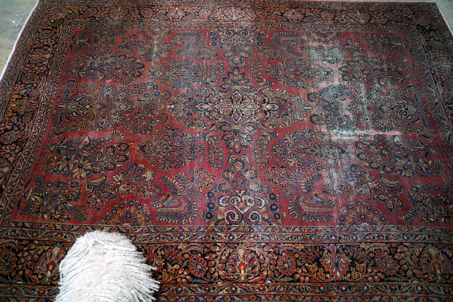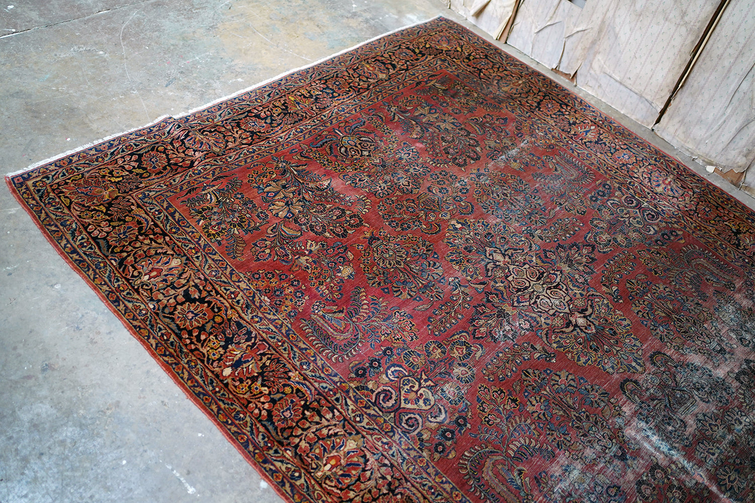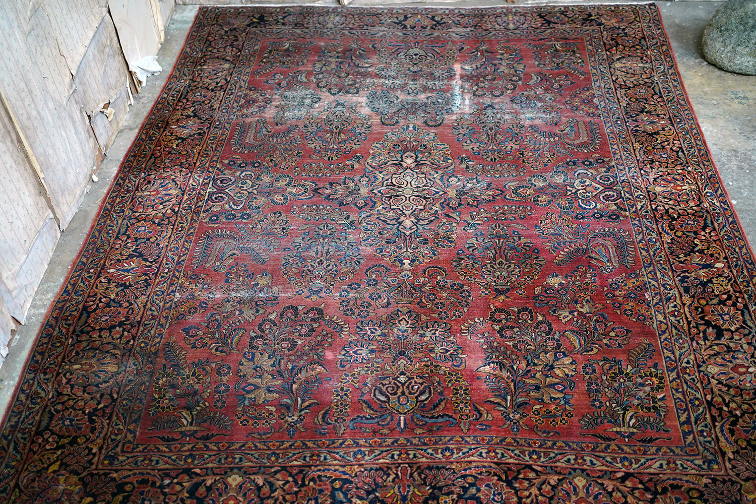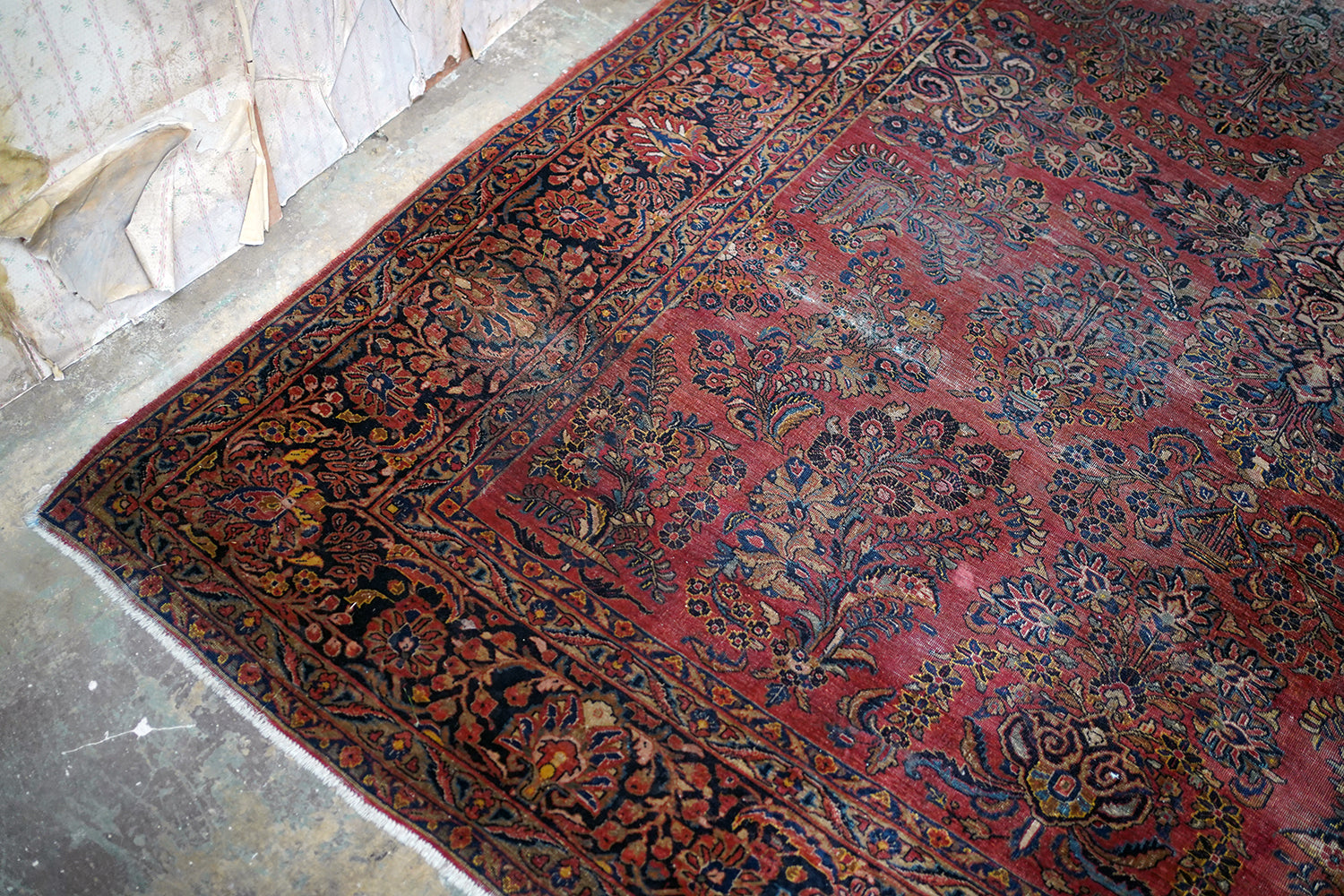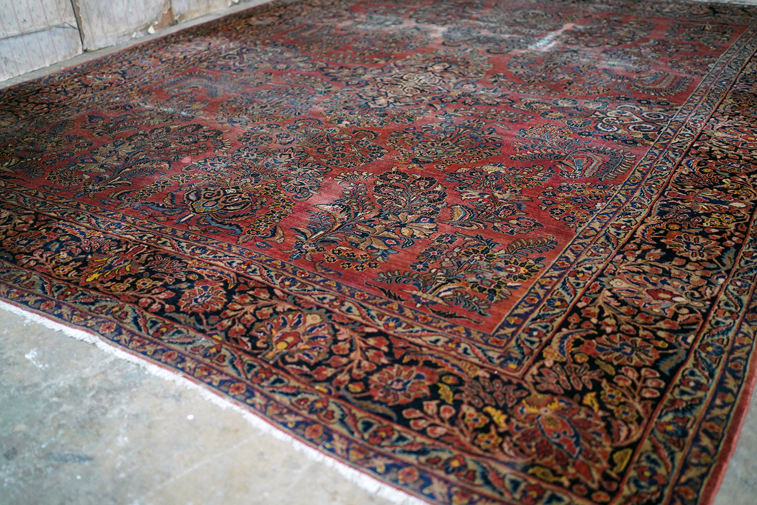 Sarouk (sometimes spelt Saroukh) is a city west of Kashan. They are fine, bold rugs with hard backs; and it’s not unusual to find them with breaks and tears because of this hardness. The colours are usually strong, contrasts great. They are made with a Sehna knot and are usually very fine. The Sarouk and Kashan may be distinguished from all others by their short velvety nap; dark rich colours; fields of graceful, foliated stalks and floral forms resting on concentric medallions; and the fine, firm texture of the weave.