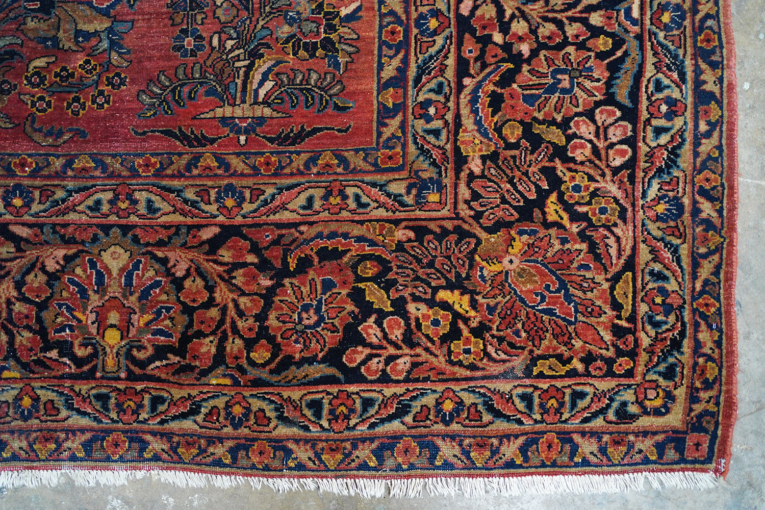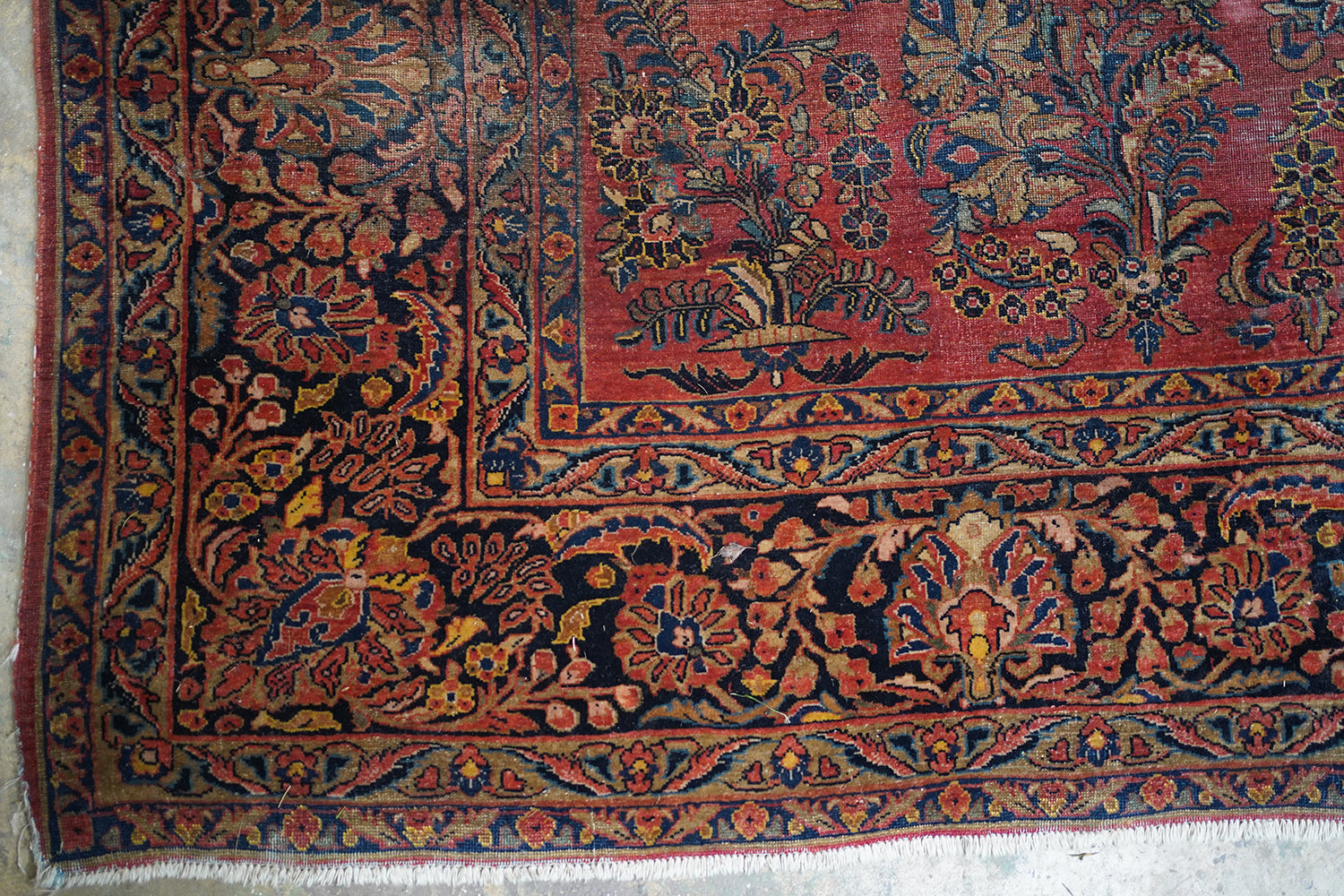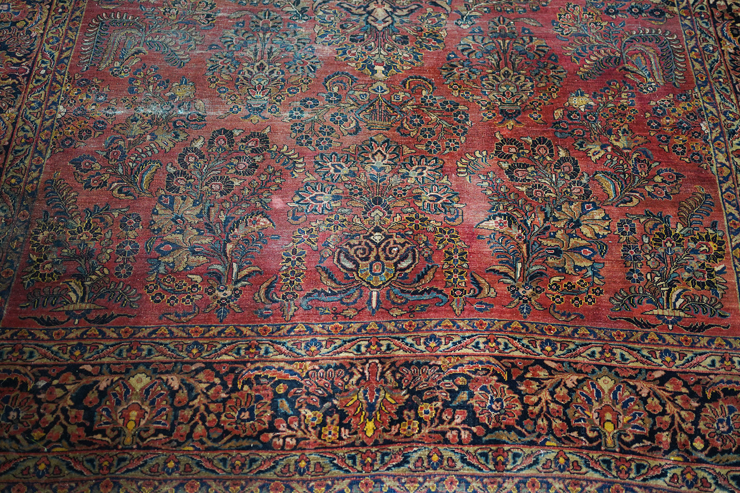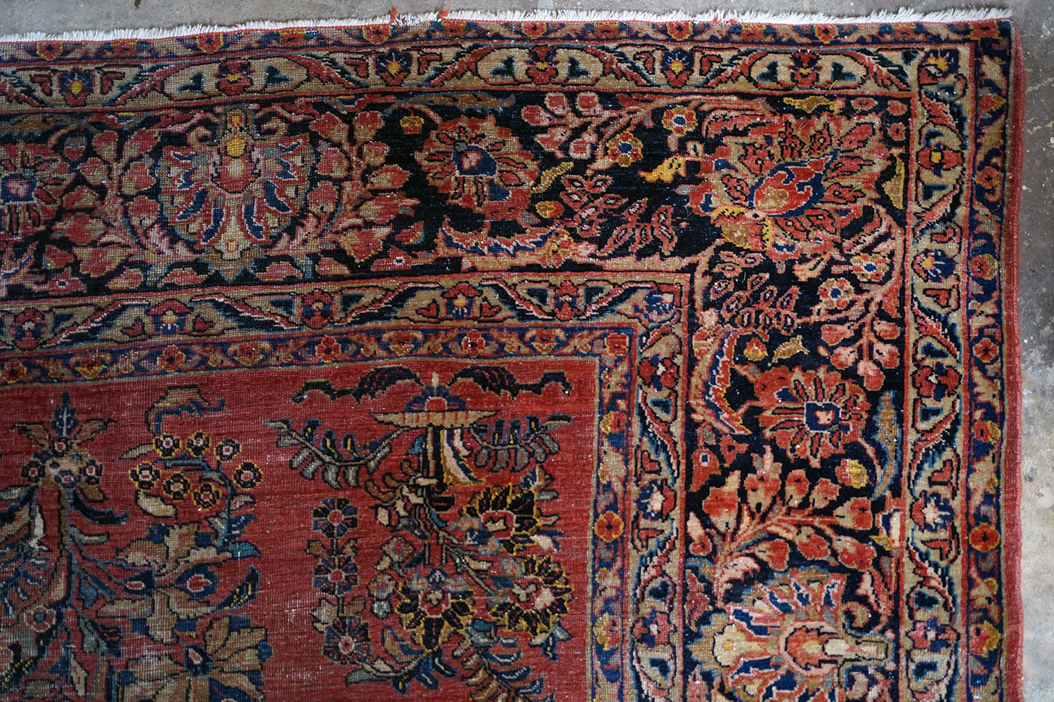 The sarouk carpet of good size at over eleven feet long, having a terracotta field centred by a cruciform medallion surrounded by floral sprays, the whole enclosed by indigo borders of meandering vines and surviving from the second quarter of the twentieth century.