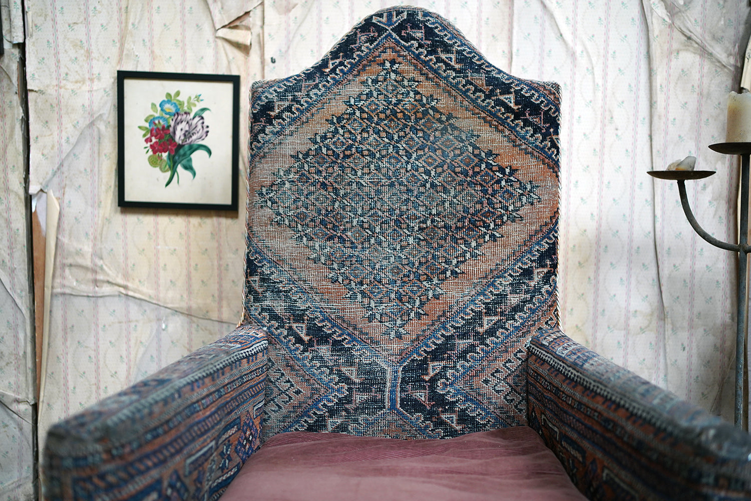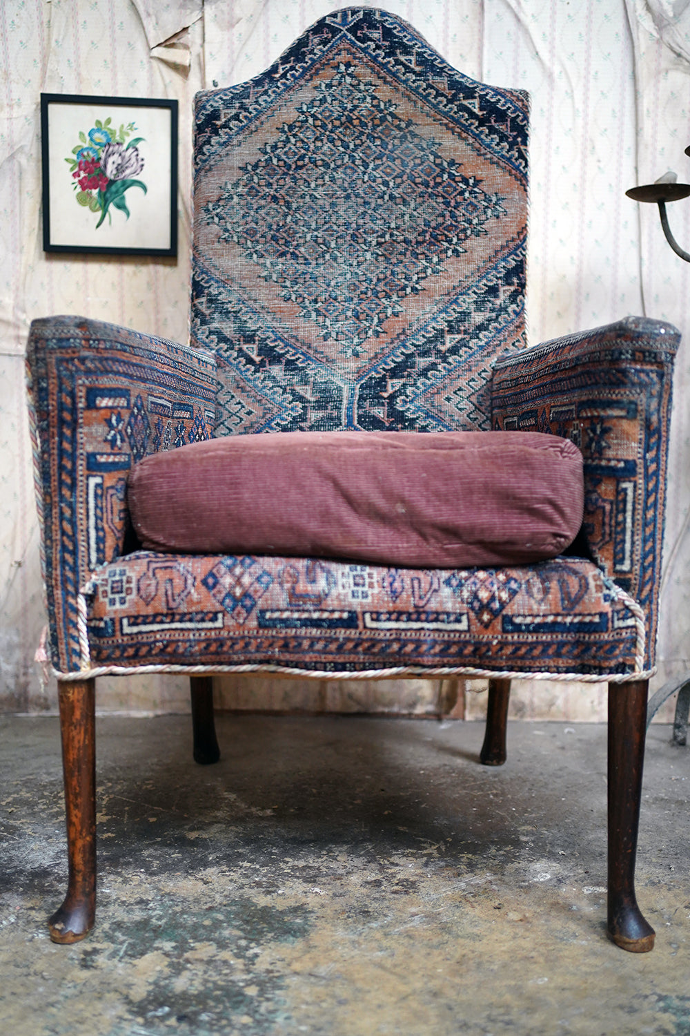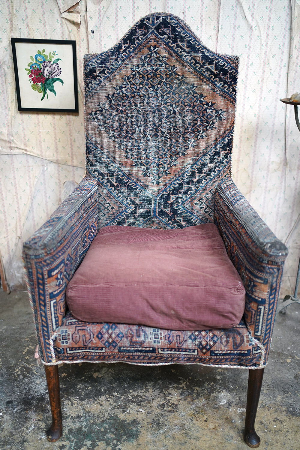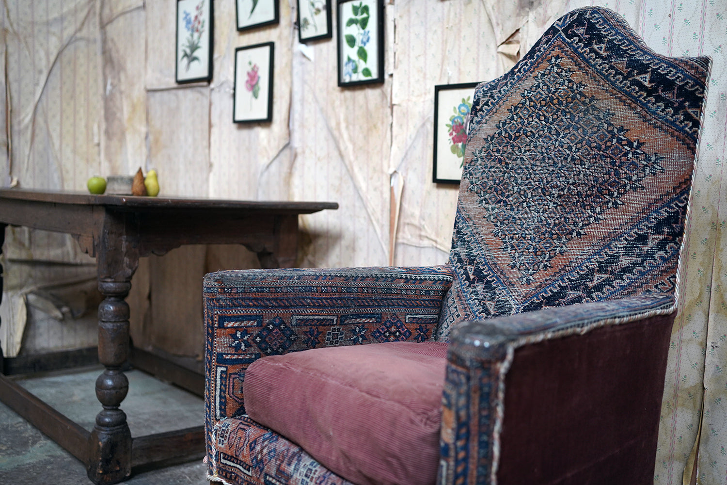 A rare and sleepy armchair, its appeal lying in its honest wear, striking silhouette and the rich, painterly surface of its kilim covering that sits comfortably in both country house and contemporary interiors, offering texture, history and an unmistakable sense of age.