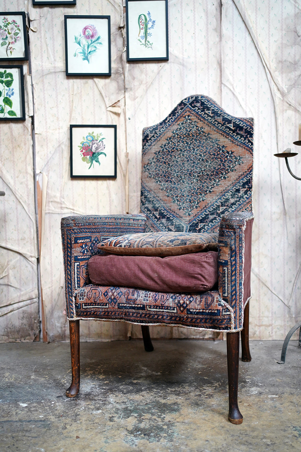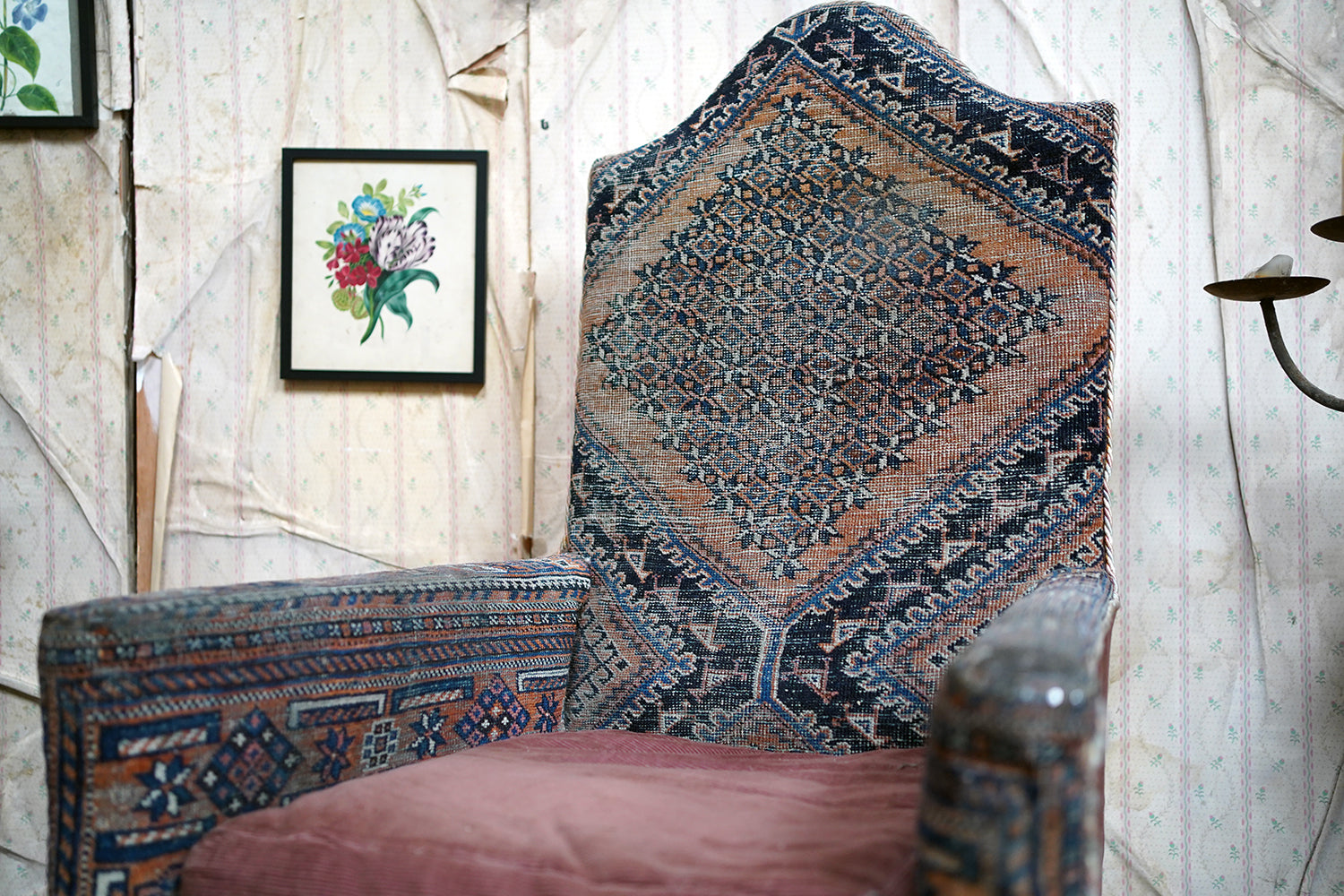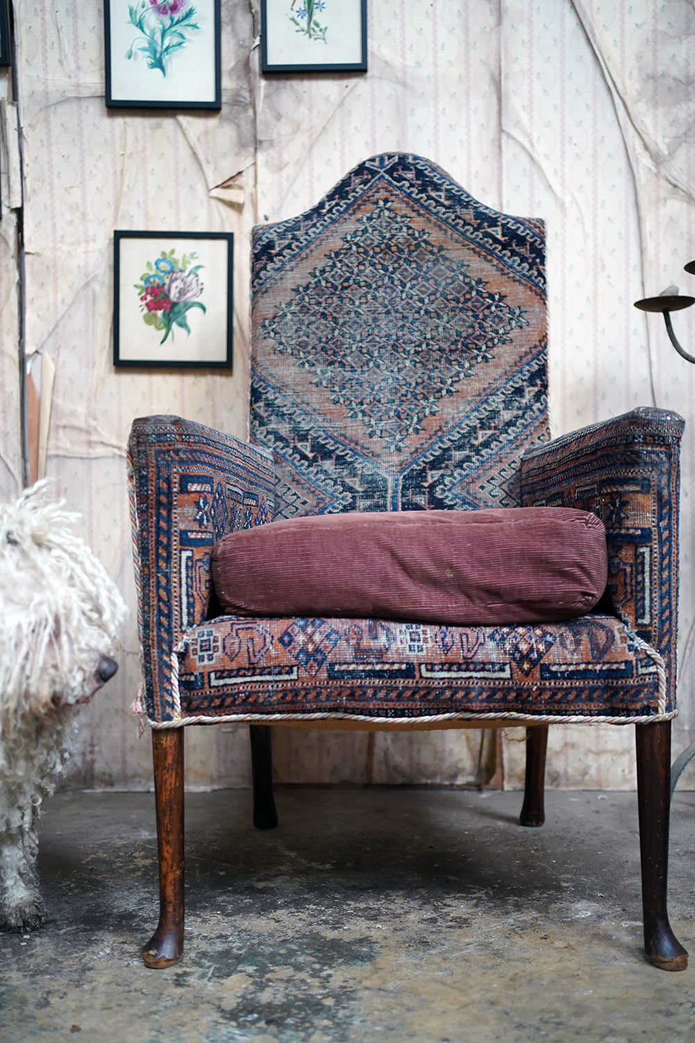 A rare and sleepy armchair, its appeal lying in its honest wear, striking silhouette and the rich, painterly surface of its kilim covering that sits comfortably in both country house and contemporary interiors, offering texture, history and an unmistakable sense of age.