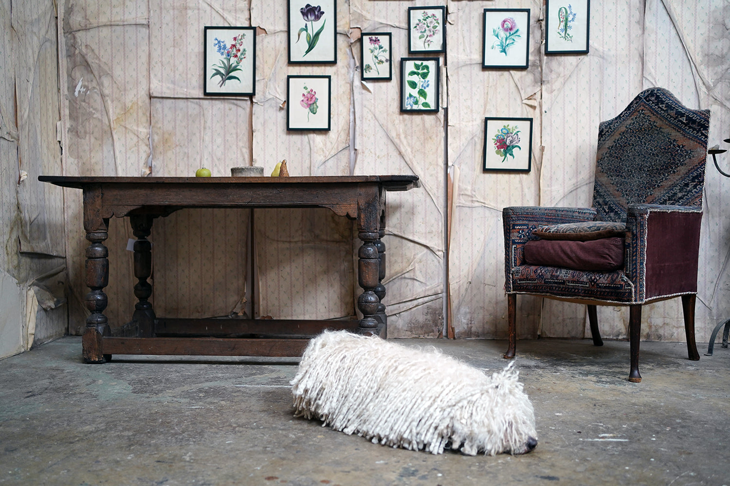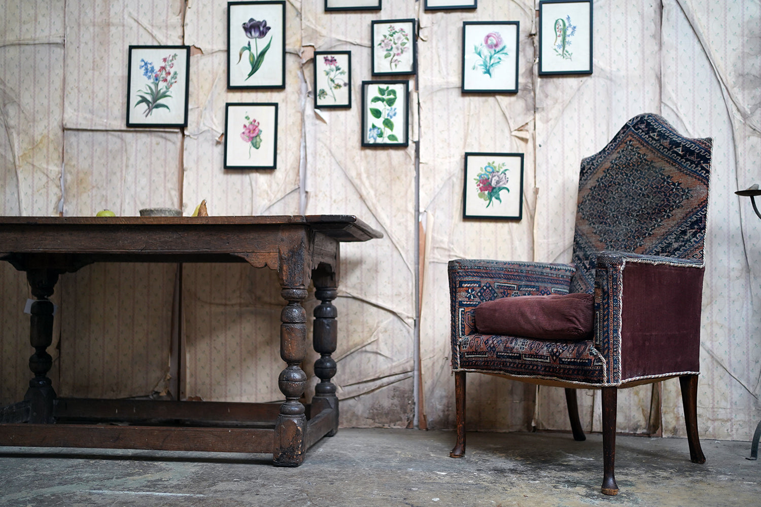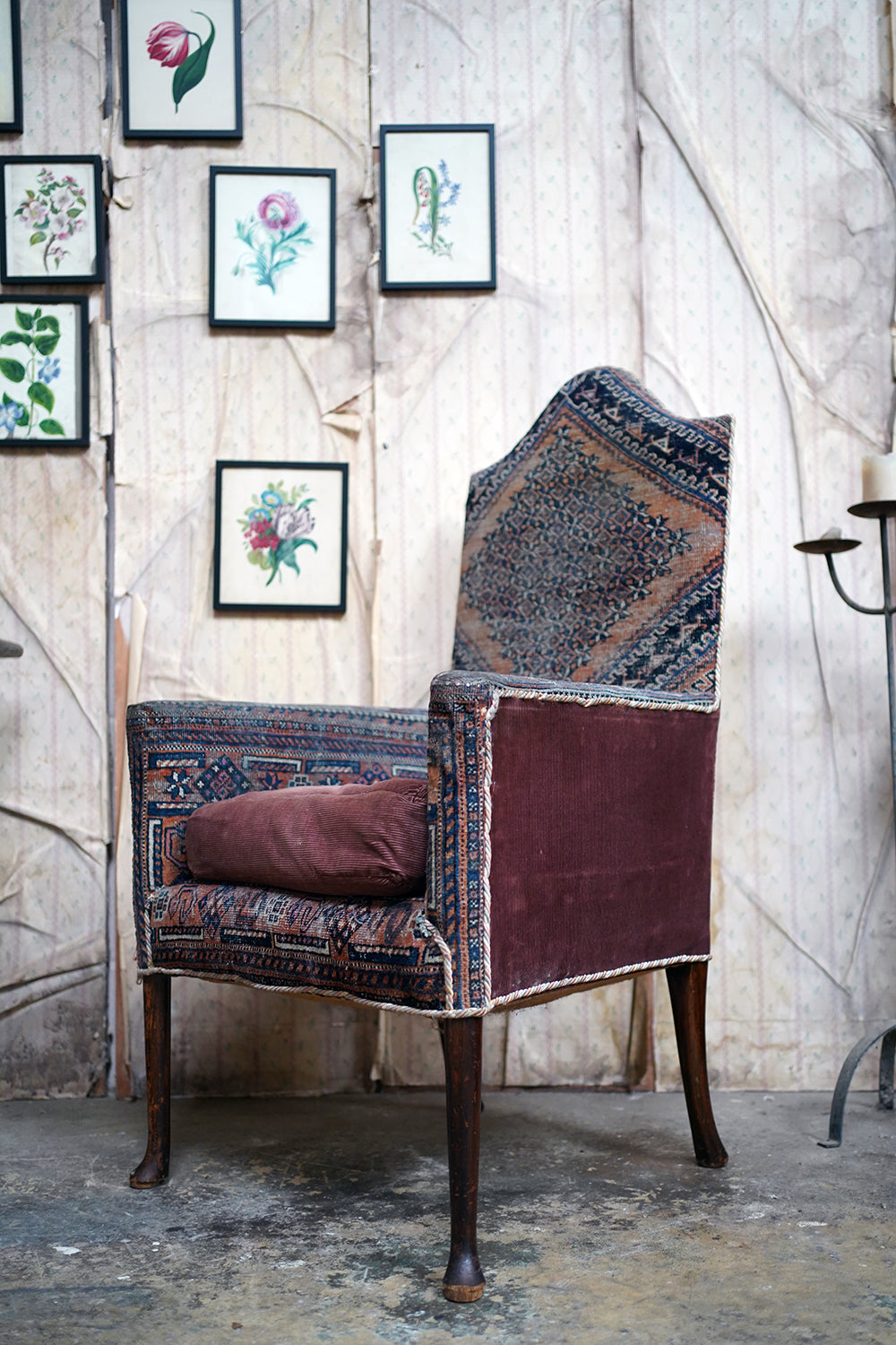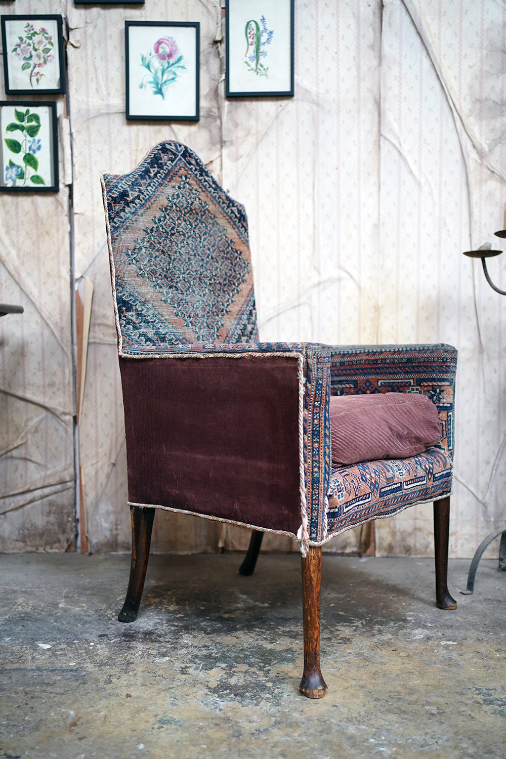 A rare and sleepy armchair, its appeal lying in its honest wear, striking silhouette and the rich, painterly surface of its kilim covering that sits comfortably in both country house and contemporary interiors, offering texture, history and an unmistakable sense of age.