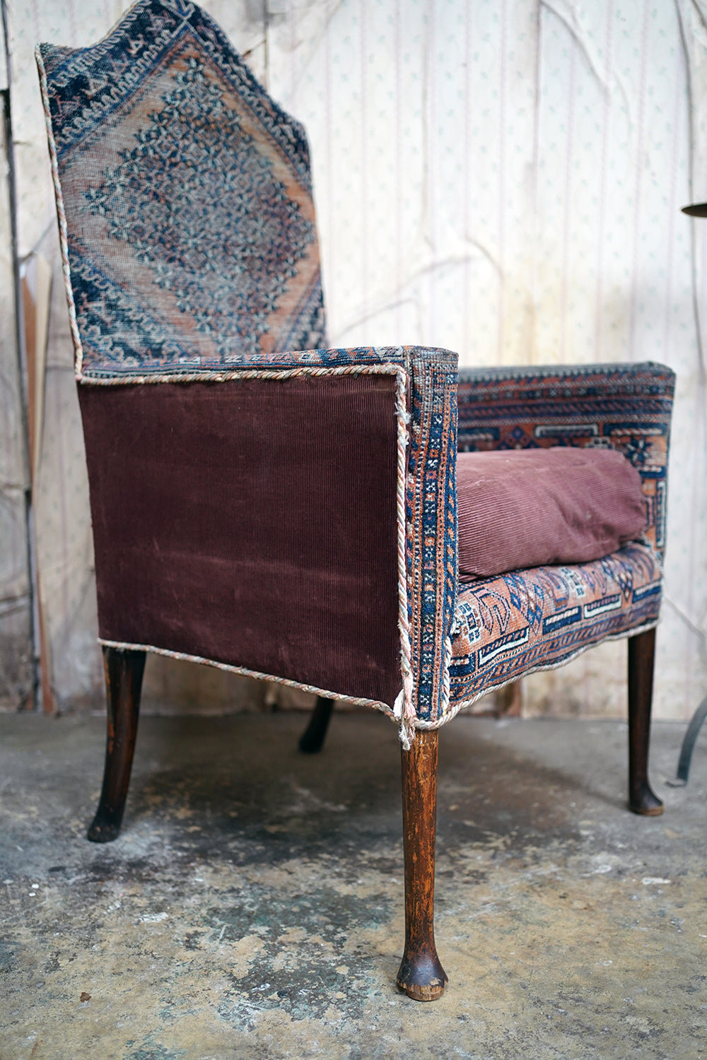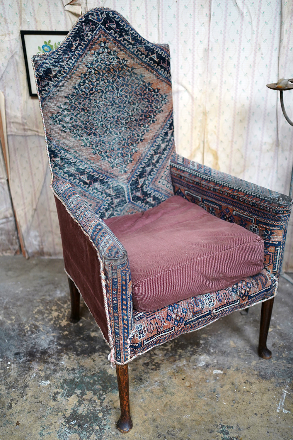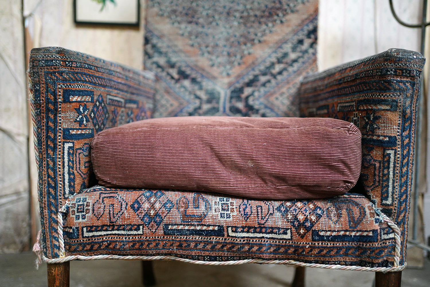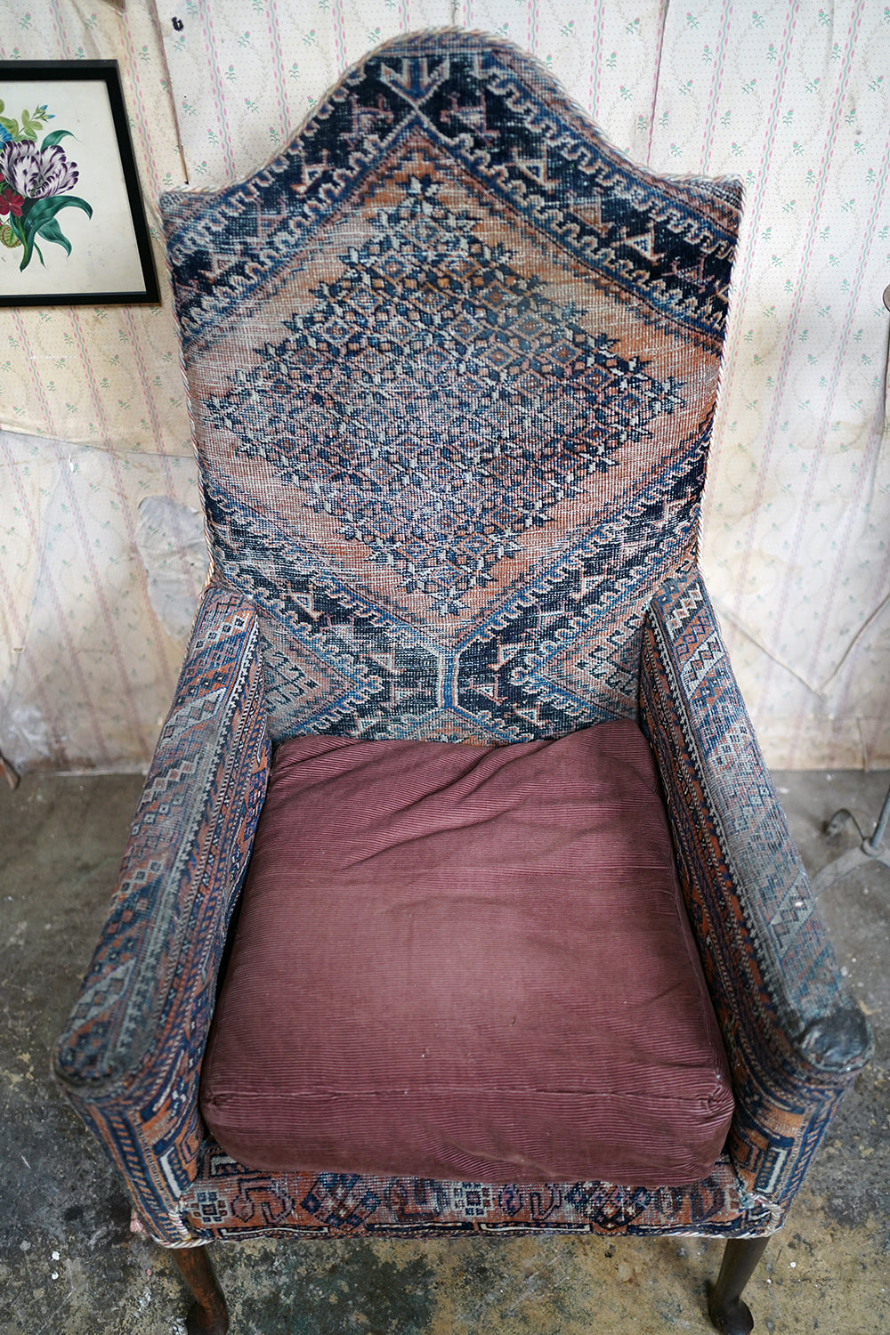 The chair is in lovely country house condition making it hugely appealing with wear consistent with age and long use throughout. The kilim covering is heavily worn in places, with thinning, fading and areas of softness to the weave, all entirely commensurate with its age and adding to its character rather than detracting. The corduroy seat cushion shows surface wear. The timber frame remains structurally sound with some wobble to one arm and with wear to the legs and feet. Overall, a piece valued for its surface, texture and authenticity rather than perfection.