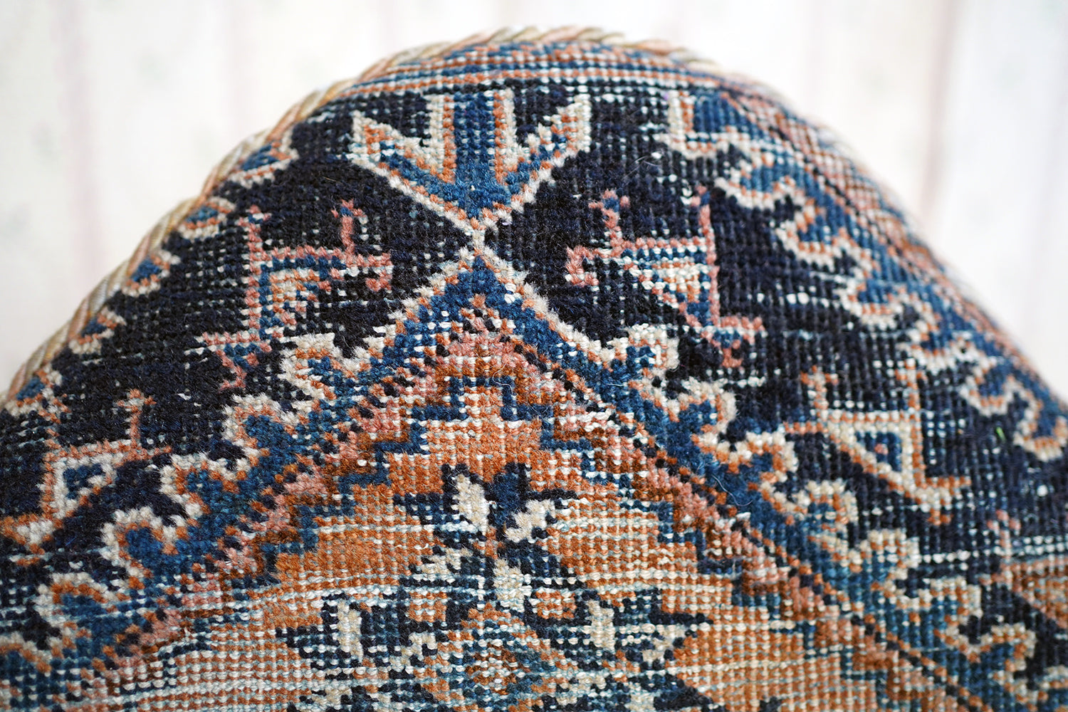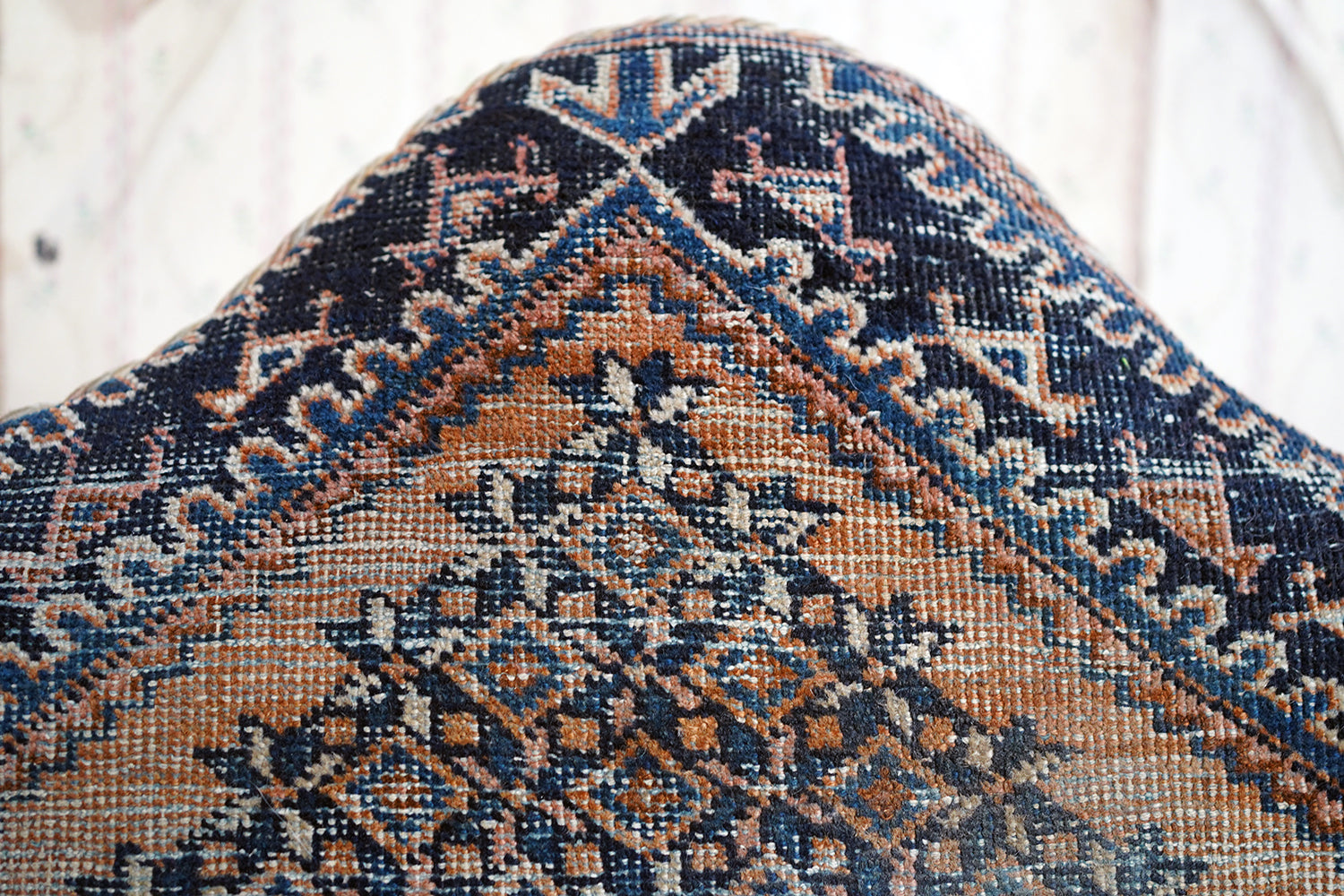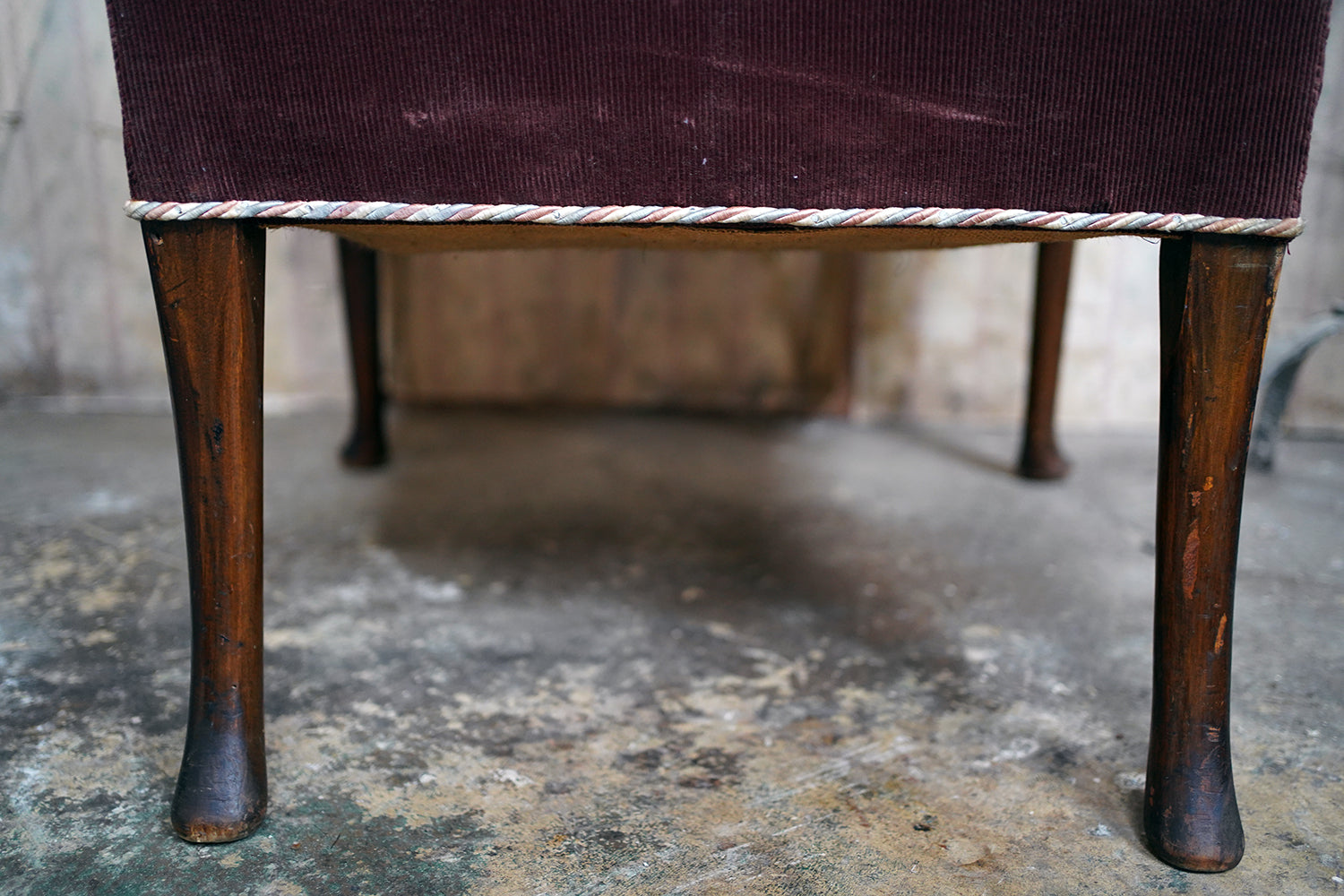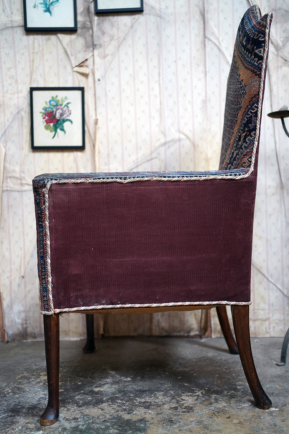 The chair is in lovely country house condition making it hugely appealing with wear consistent with age and long use throughout. The kilim covering is heavily worn in places, with thinning, fading and areas of softness to the weave, all entirely commensurate with its age and adding to its character rather than detracting. The corduroy seat cushion shows surface wear. The timber frame remains structurally sound with some wobble to one arm and with wear to the legs and feet. Overall, a piece valued for its surface, texture and authenticity rather than perfection.