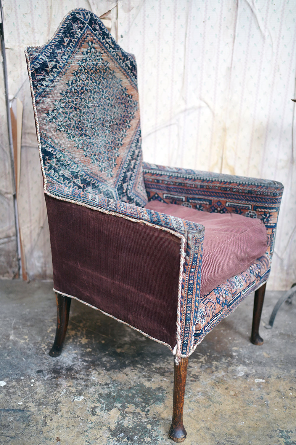 The late eighteenth century armchair, with a high gently shaped back and enclosed arms, raised on slender tapering legs, upholstered in an early hand-woven kilim textile, the back and arms worked with geometric medallions and border motifs in muted ochres, indigo blues, umber and soft charcoal, the seat cushion and back finished in a later burgundy plum corduroy, the whole on pad feet and surviving from the last quarter of the eighteenth century.