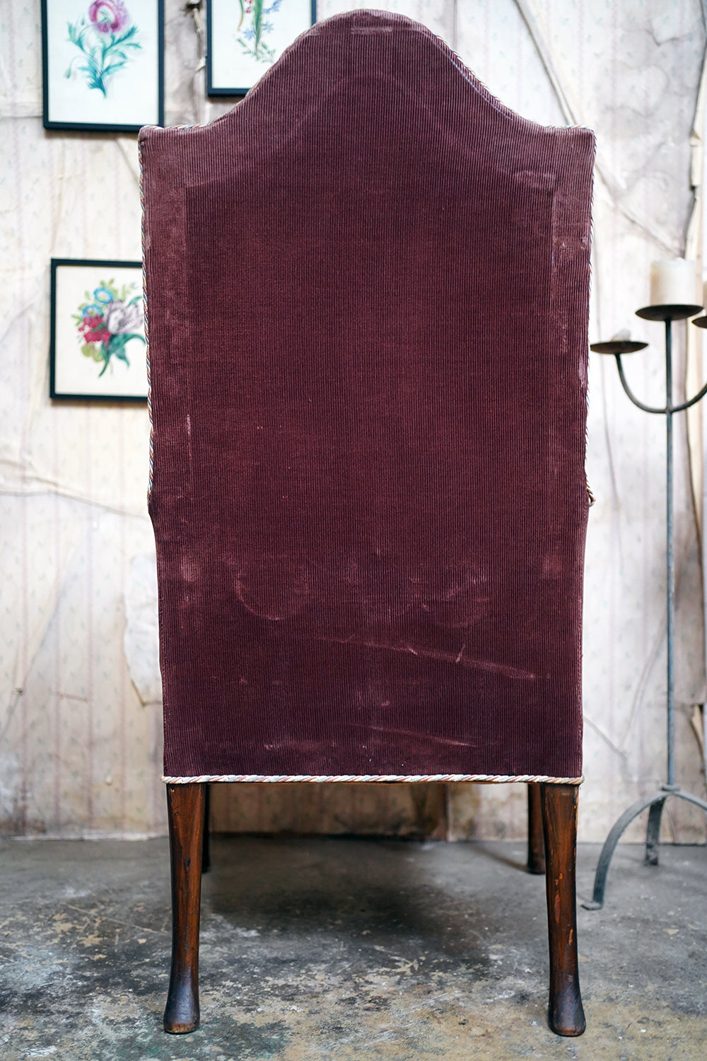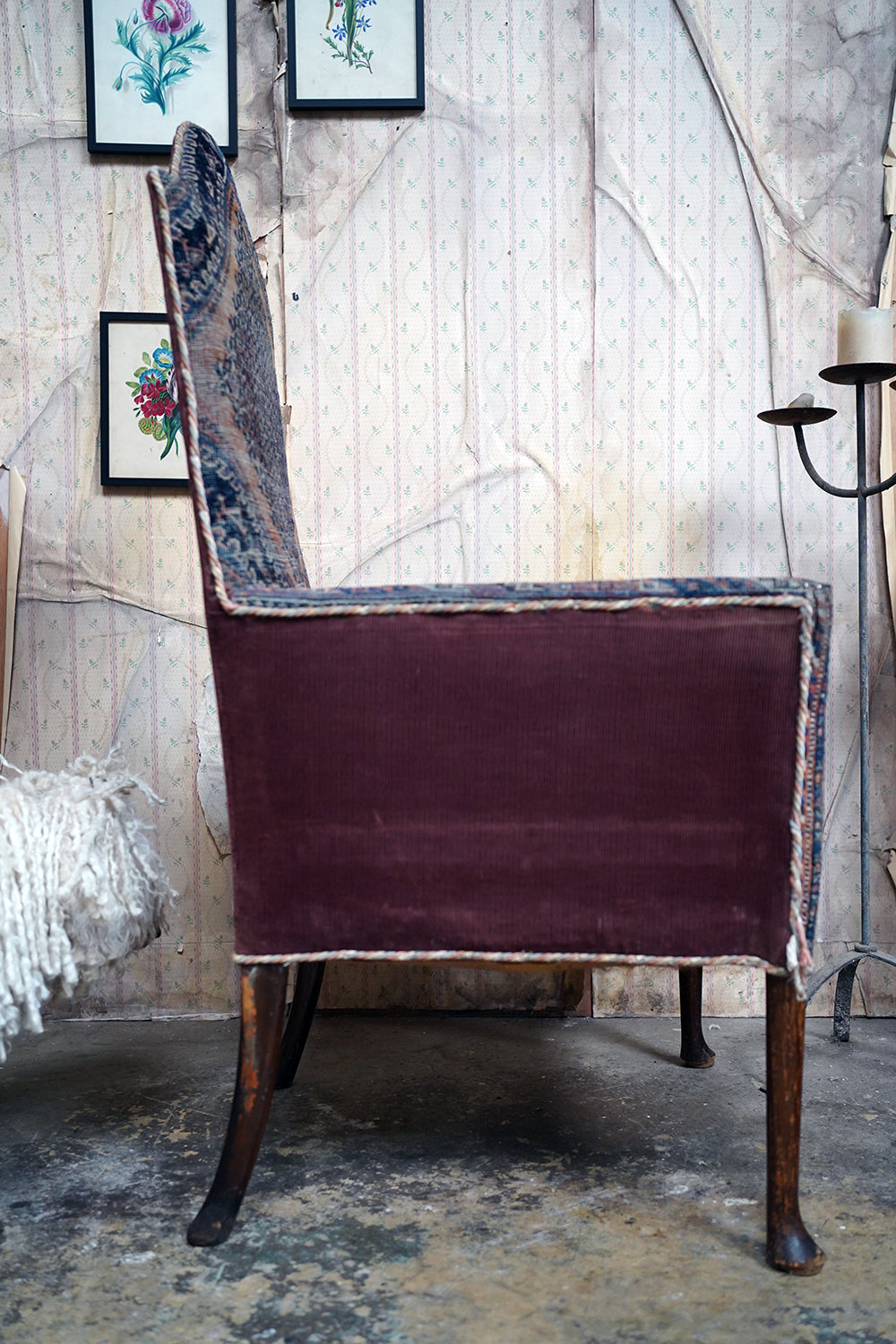 Armchairs of this form belong firmly to the late eighteenth century, their tall backs and enclosed arms designed for warmth and comfort within draughty interiors. The use of kilim textiles, flat-woven rugs traditionally produced across Anatolia, the Caucasus and parts of the Middle East, reflects a long history of European interiors incorporating imported or recycled textiles, often repurposed from floor coverings or wall hangings. Such chairs were frequently re-covered during their working lives, resulting in unique, one-off survivals where vernacular furniture and nomadic weaving intersect.