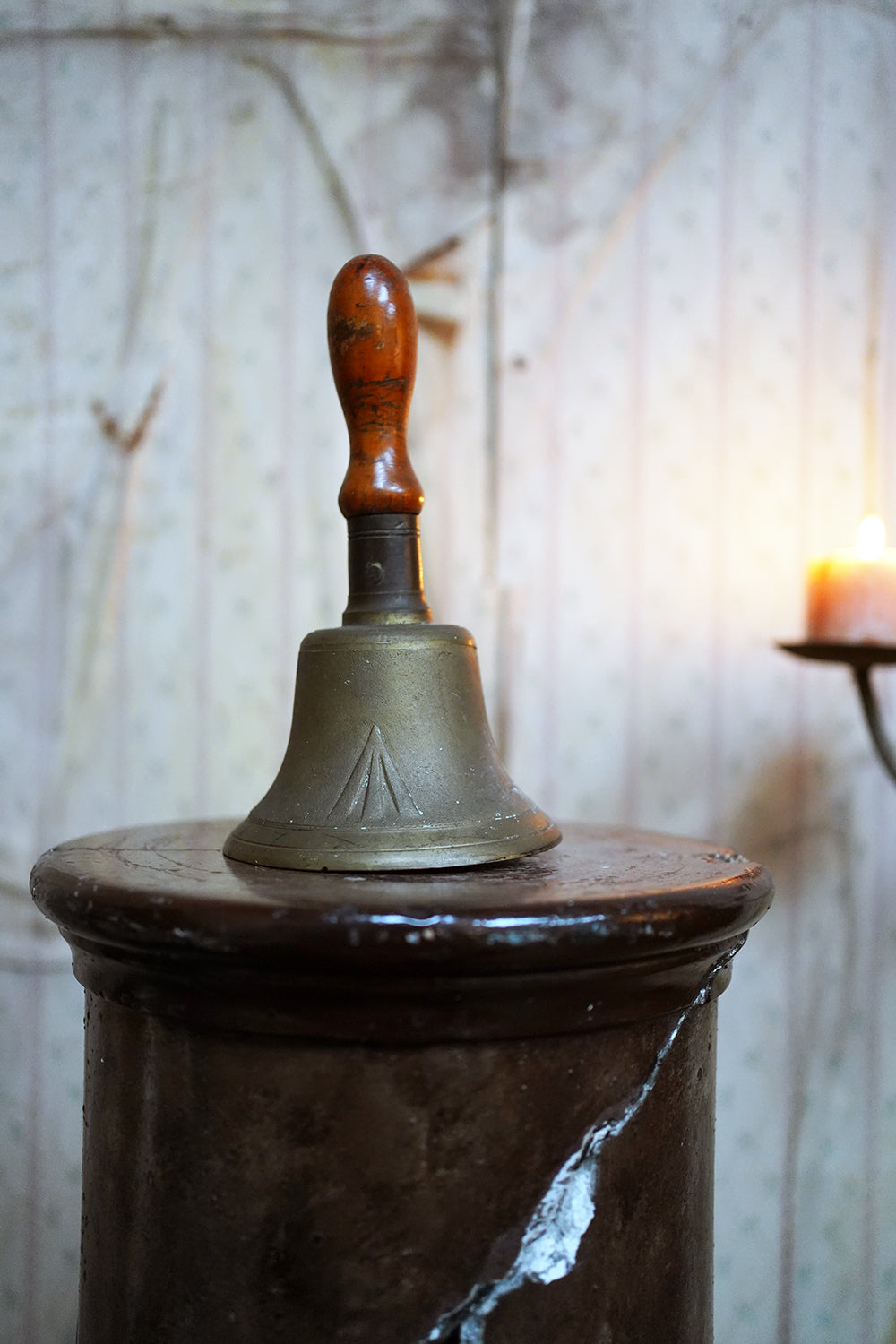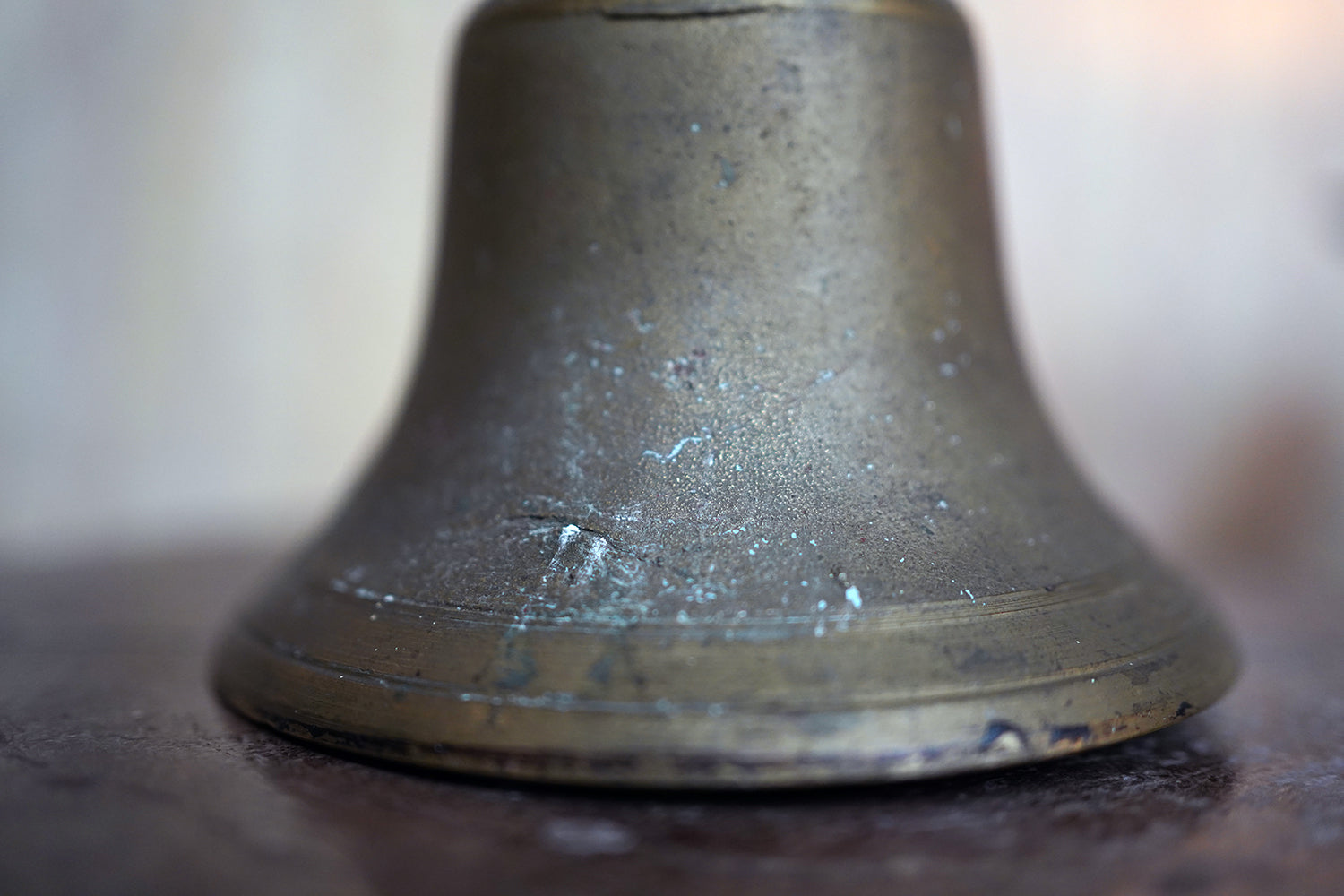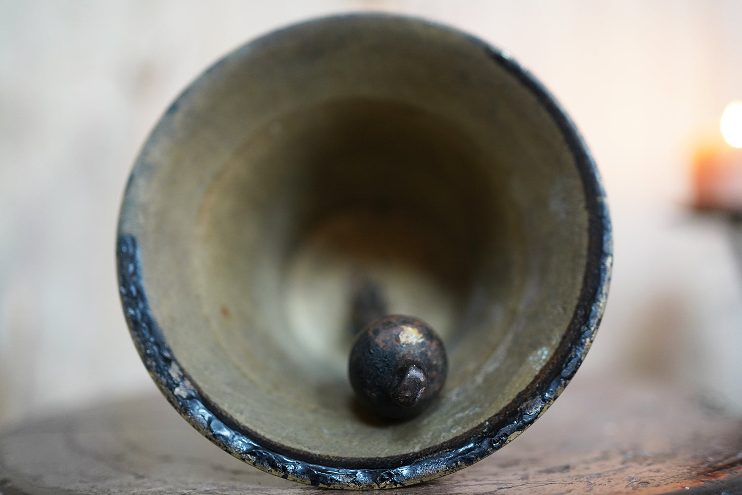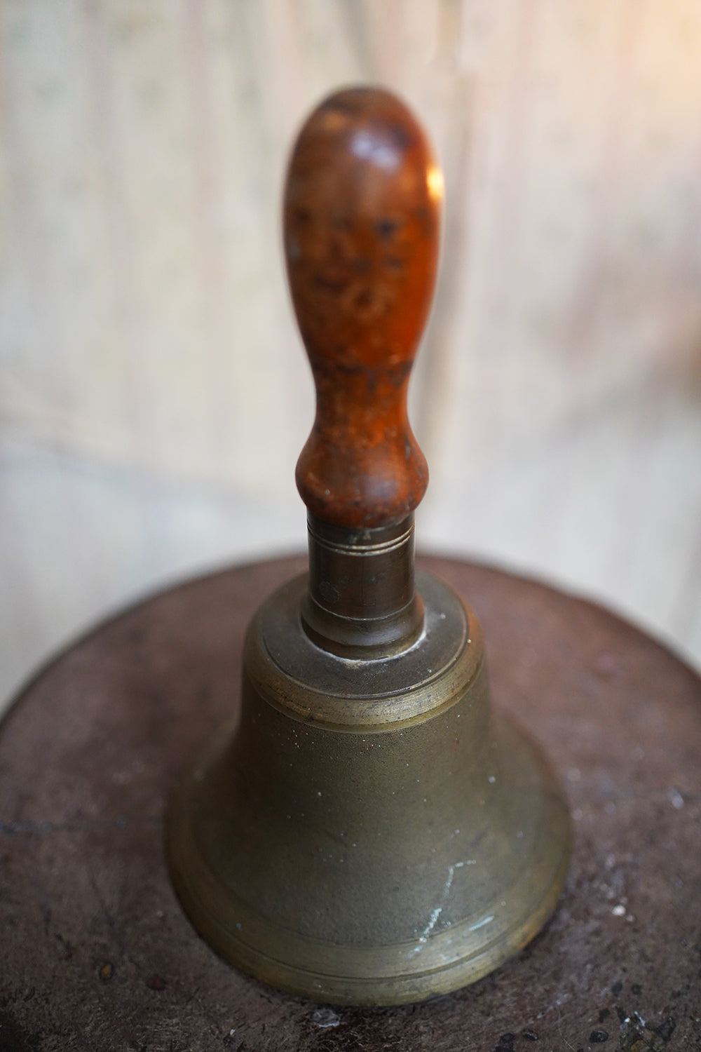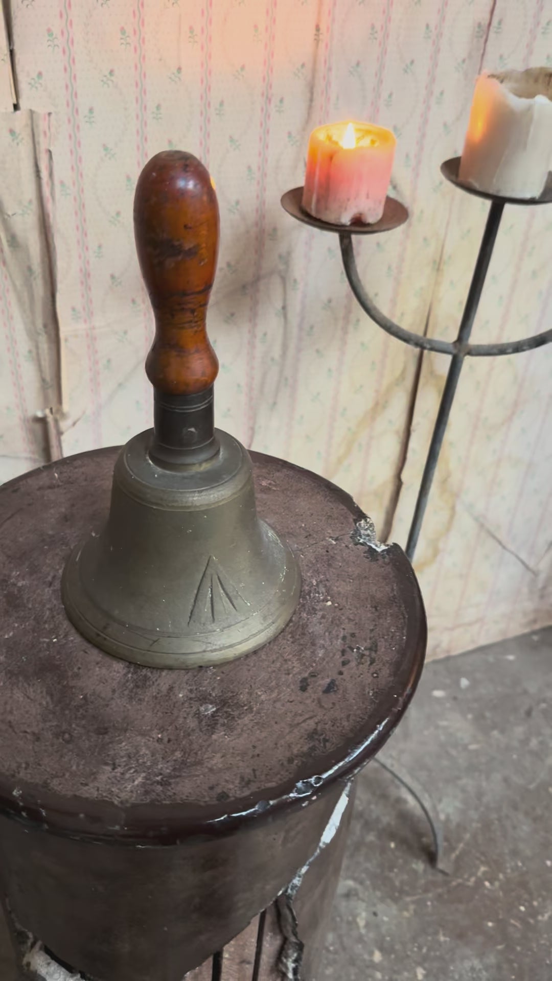 The condition of the bell is good and operative (see video), with its honest utilitarian casting, deep tone and uncleaned surface with a beautifully mellow handle and verdigris to the bronze.