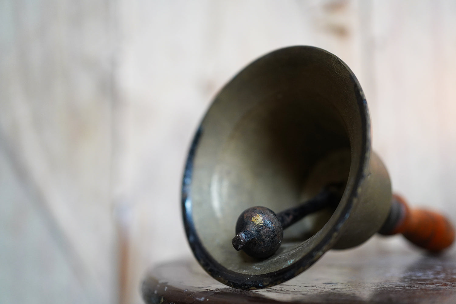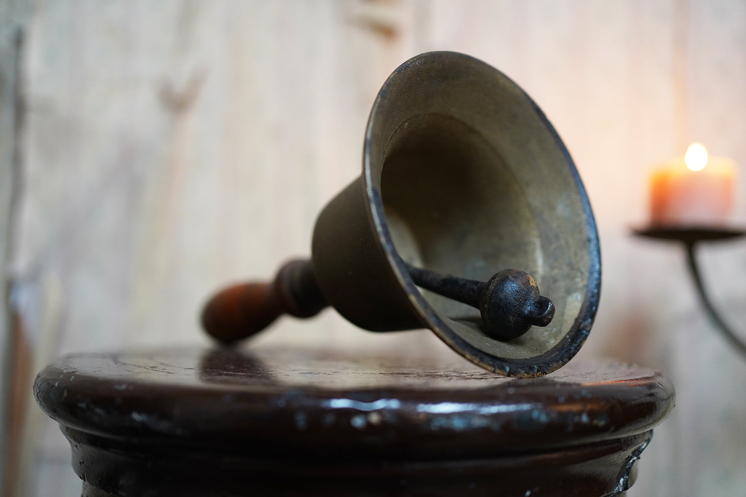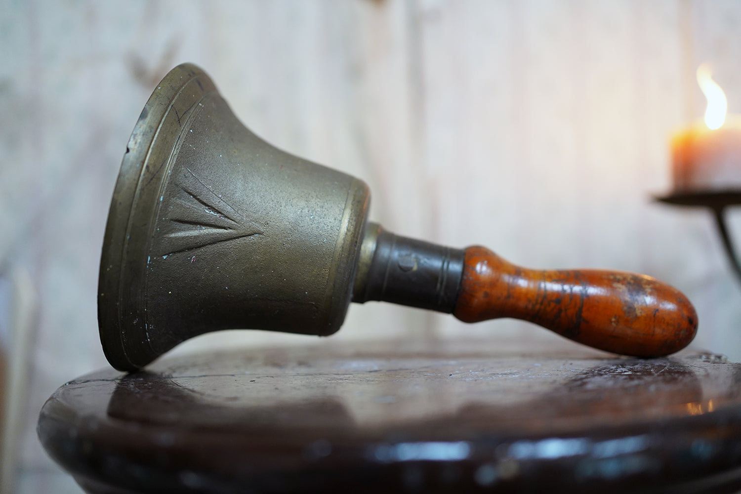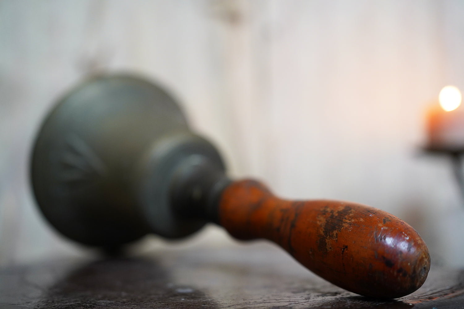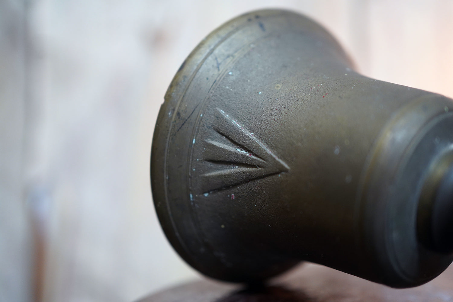 The condition of the bell is good and operative (see video), with its honest utilitarian casting, deep tone and uncleaned surface with a beautifully mellow handle and verdigris to the bronze.