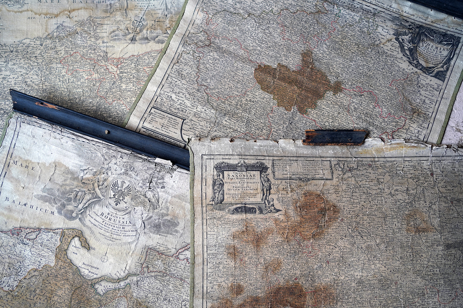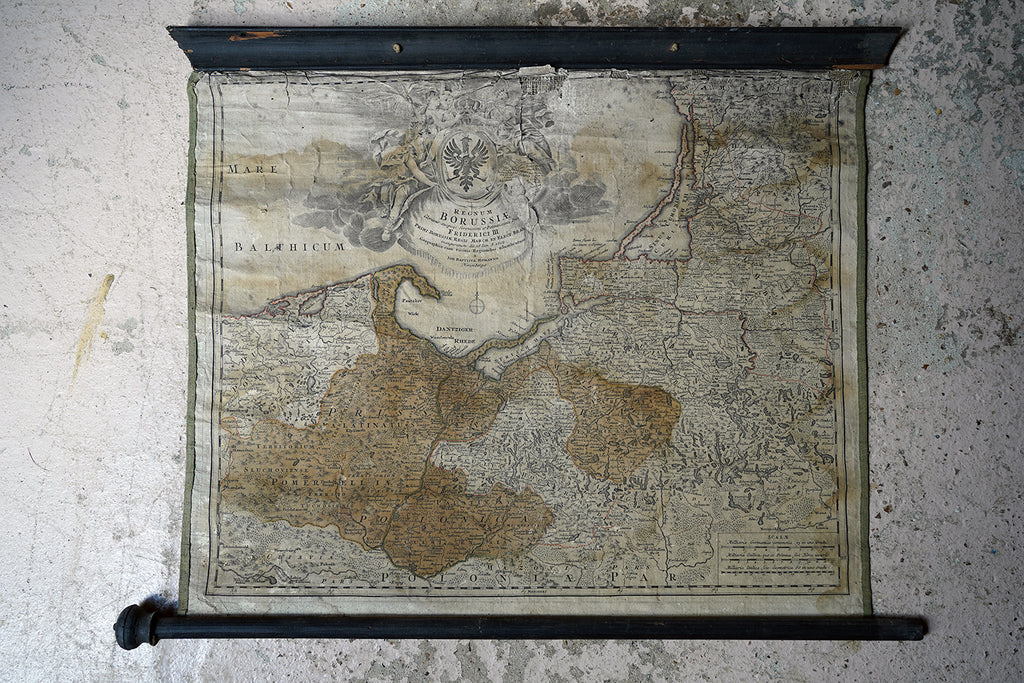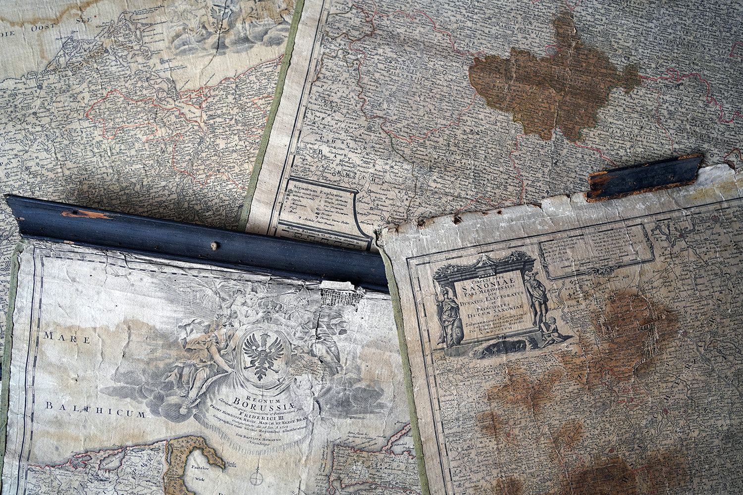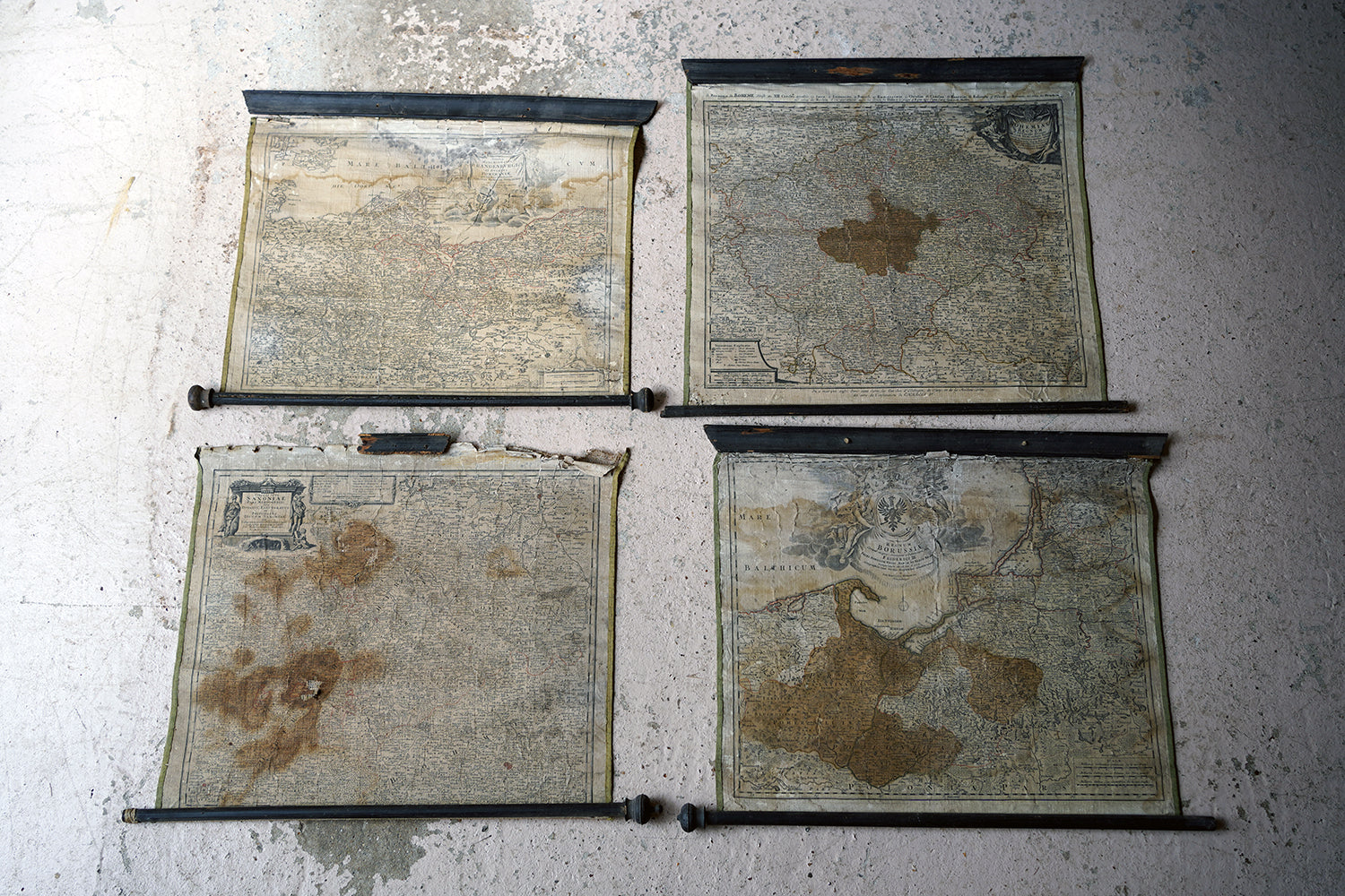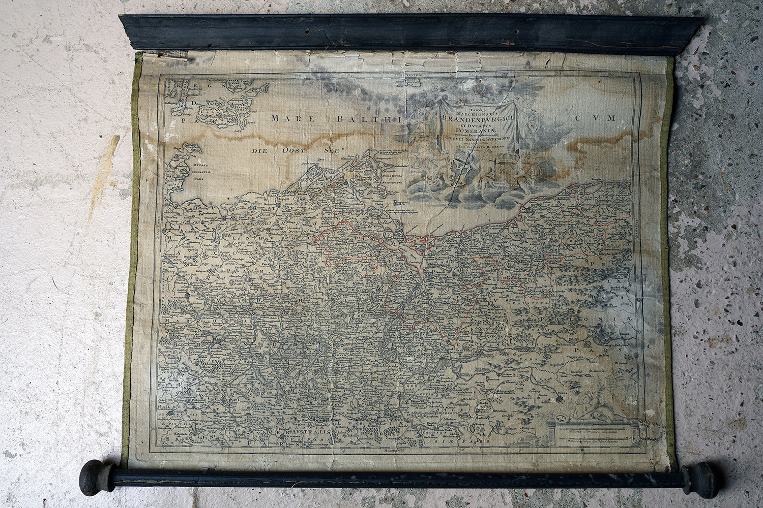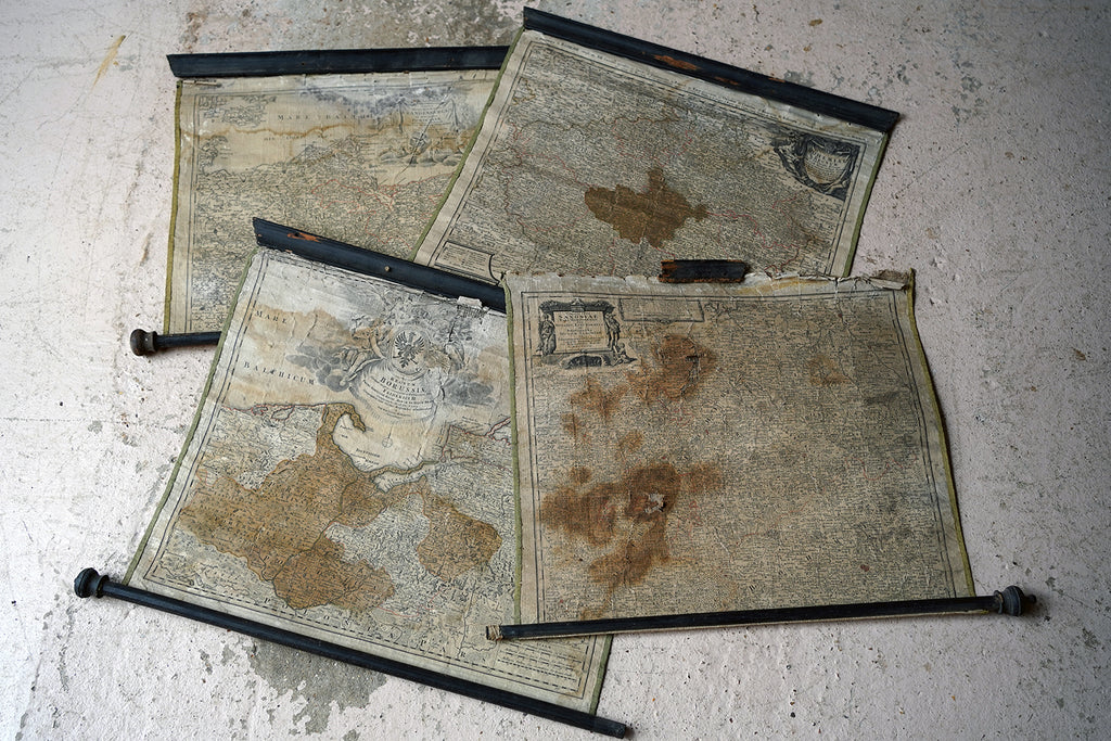 The hand-coloured maps in as found attic condition, each with their original ebonised pine rods for scrolling and lime green borders, in beautifully faded order showing various regions from Bohemia, Saxony and the Baltics with beautiful illustrated cartouches, each dating from 1720 to 1757 and being canvas backed,
